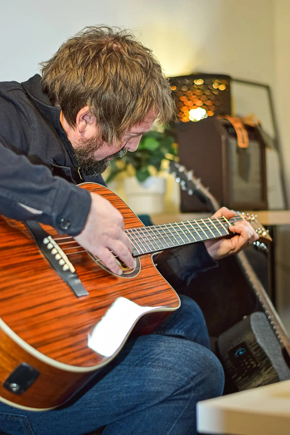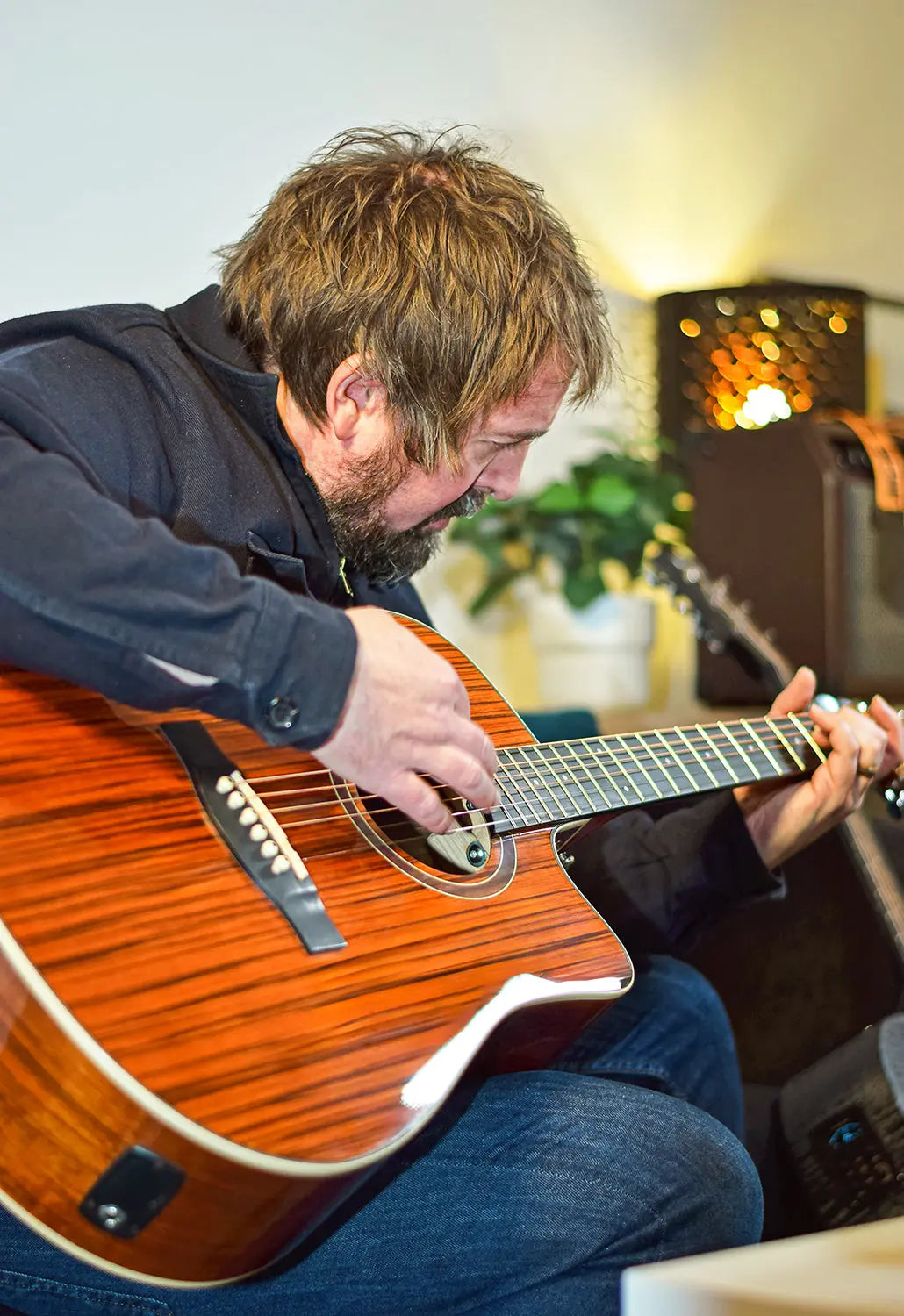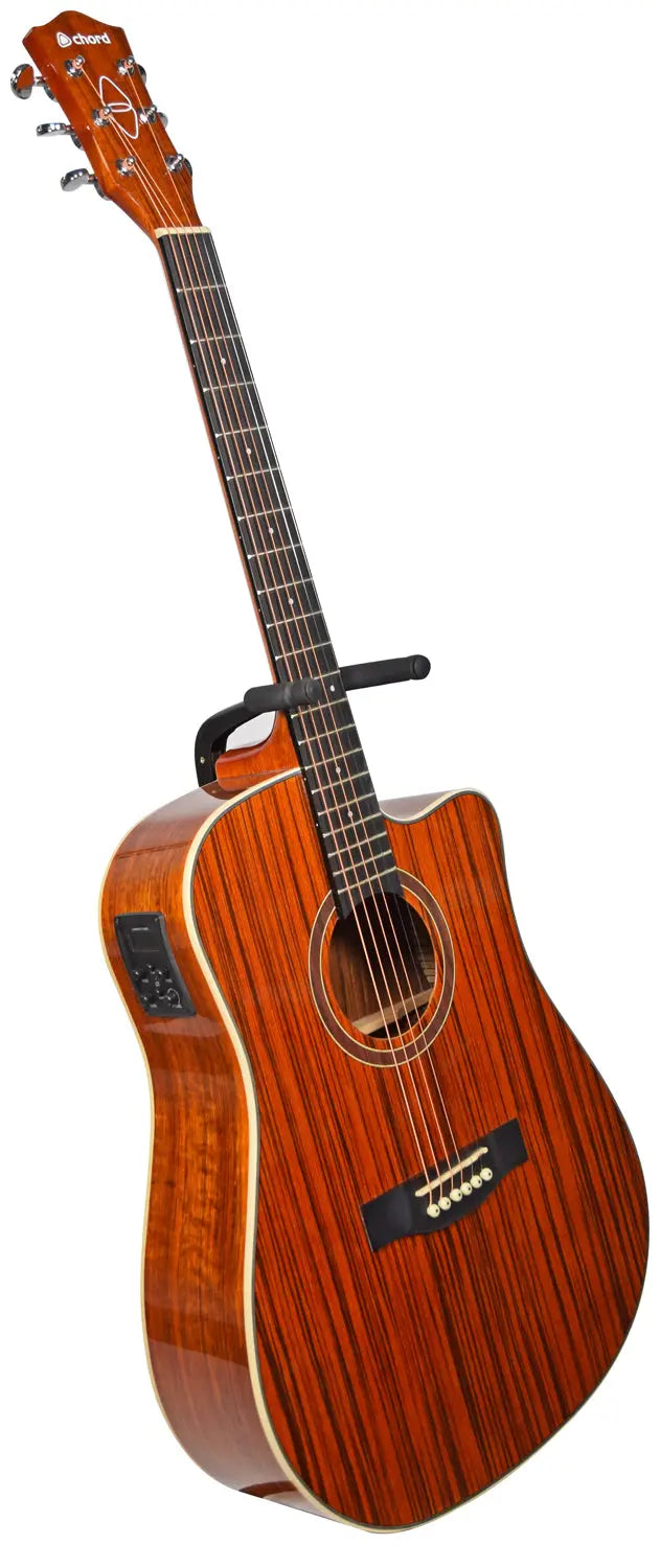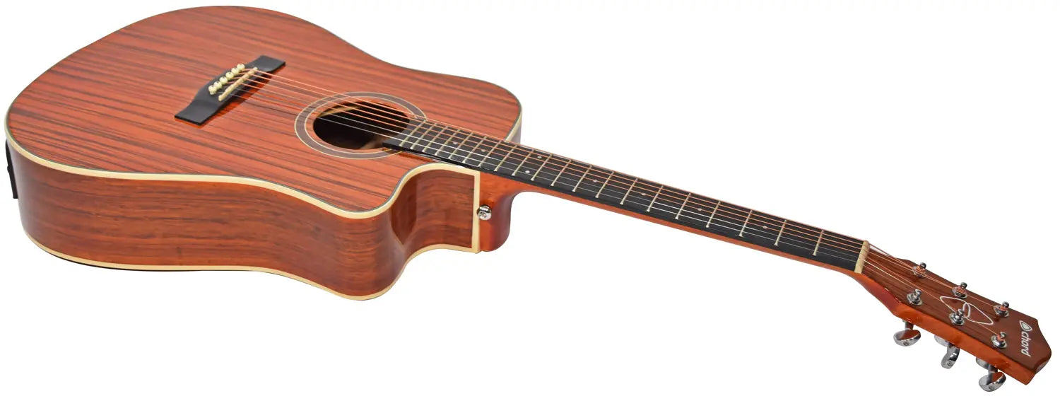 Western style electro-acoustic guitar with a venetian cutaway. Fitted with a 3-band active EQ and inbuilt tuner. The body is constructed from figured wood laminates in a high gloss finish to accentuate the attractive woodgrain. The Okoume neck holds an HPL fingerboard with 20 low profile frets. In addition to its natural good looks, the Sundown guitar is an eminently playable guitar with pro-level features for live performances, studio sessions and songwriting.