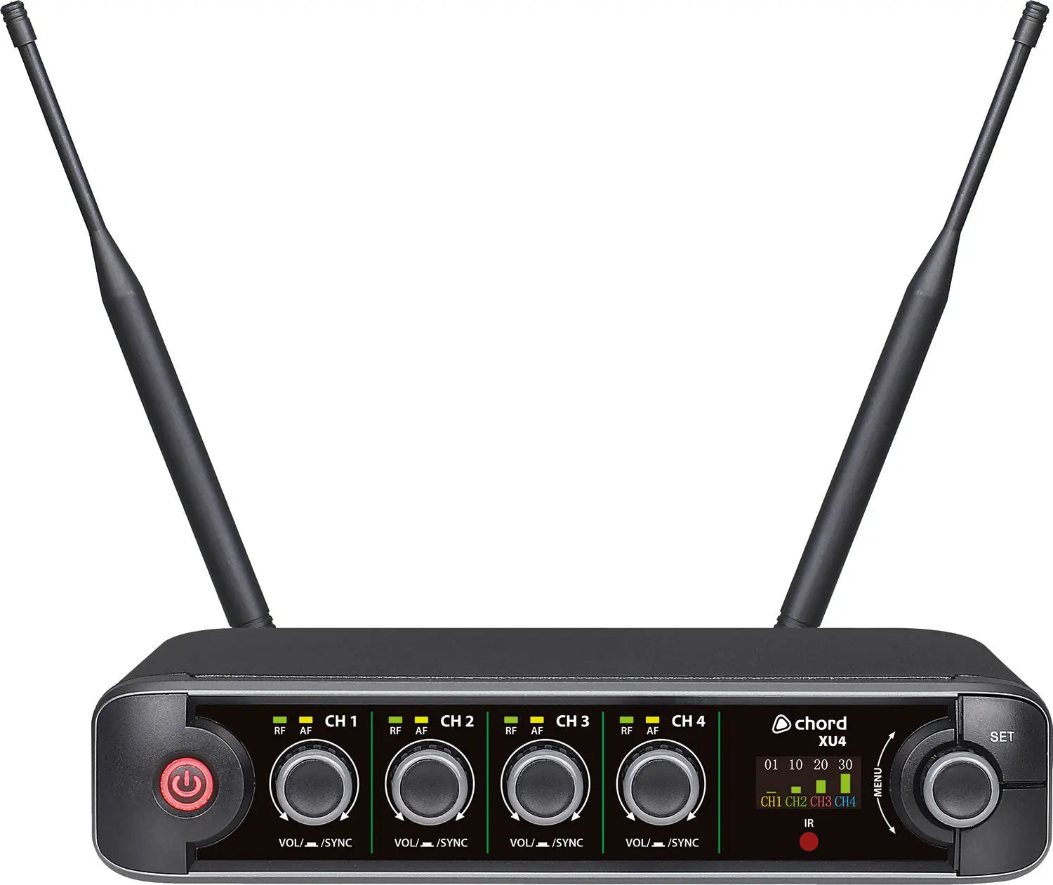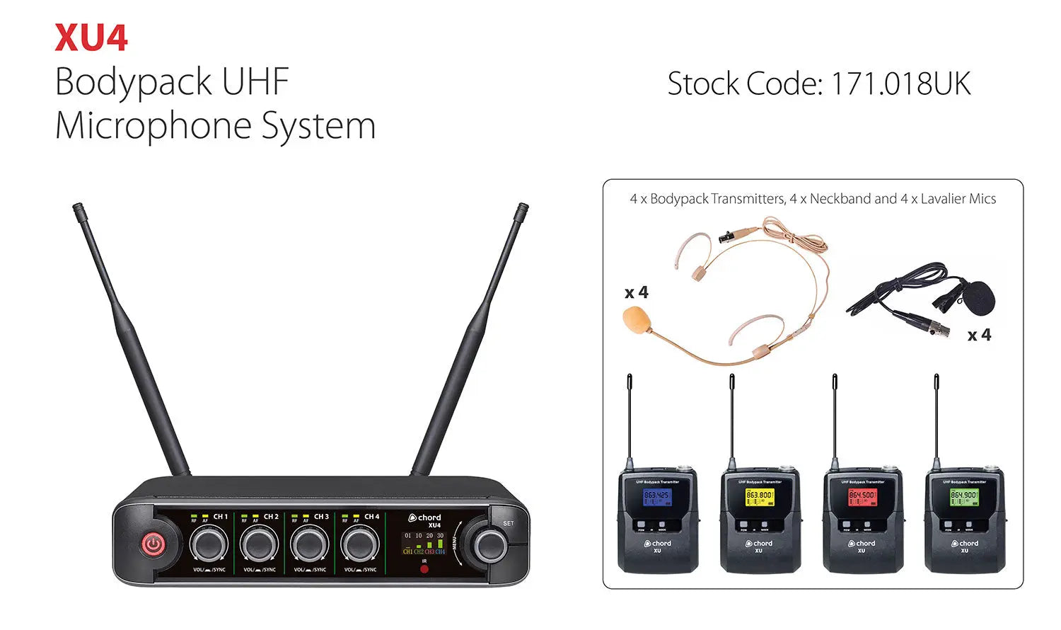 XU series wireless microphone systems offer pro-level features in a compact receiver with premium microphone transmitters. Supplied as a half-width 1U rack receiver with 1, 2 or 4 channels of either handheld microphones or bodypack transmitters with a neckband and lavalier mic option. The receiver is a true diversity type with dual antennas and internal distribution for minimizing dropouts. The front panel has a volume control and indicator LEDs per channel alongside a colour TFT display with level indications for each channel and settings for channel frequencies and colours. Each transmitter also has its own LCD display for frequency and battery status, with a backlight that can be set to one of 6 colours for identification. Carrier frequencies are arranged in 10 groups with carriers in both the UK/EU license-free UHF and PMSE licensed duplex gap UHF bands. Each set is supplied with hardware for mounting into a 1U rack space with extension cables to enable front mounting of the antennas. For a wireless microphone system with straightforward operation and intuitive features, the XU series delivers freedom and reliable operation to vocalists, presenters and instructors in a compact and convenient package.