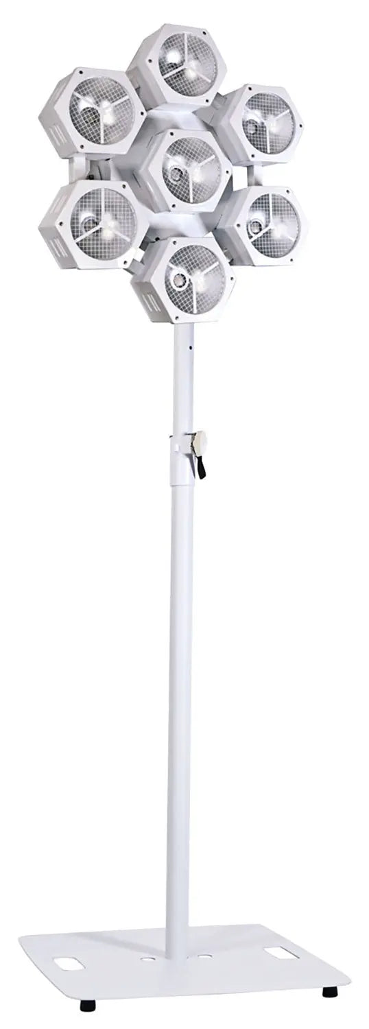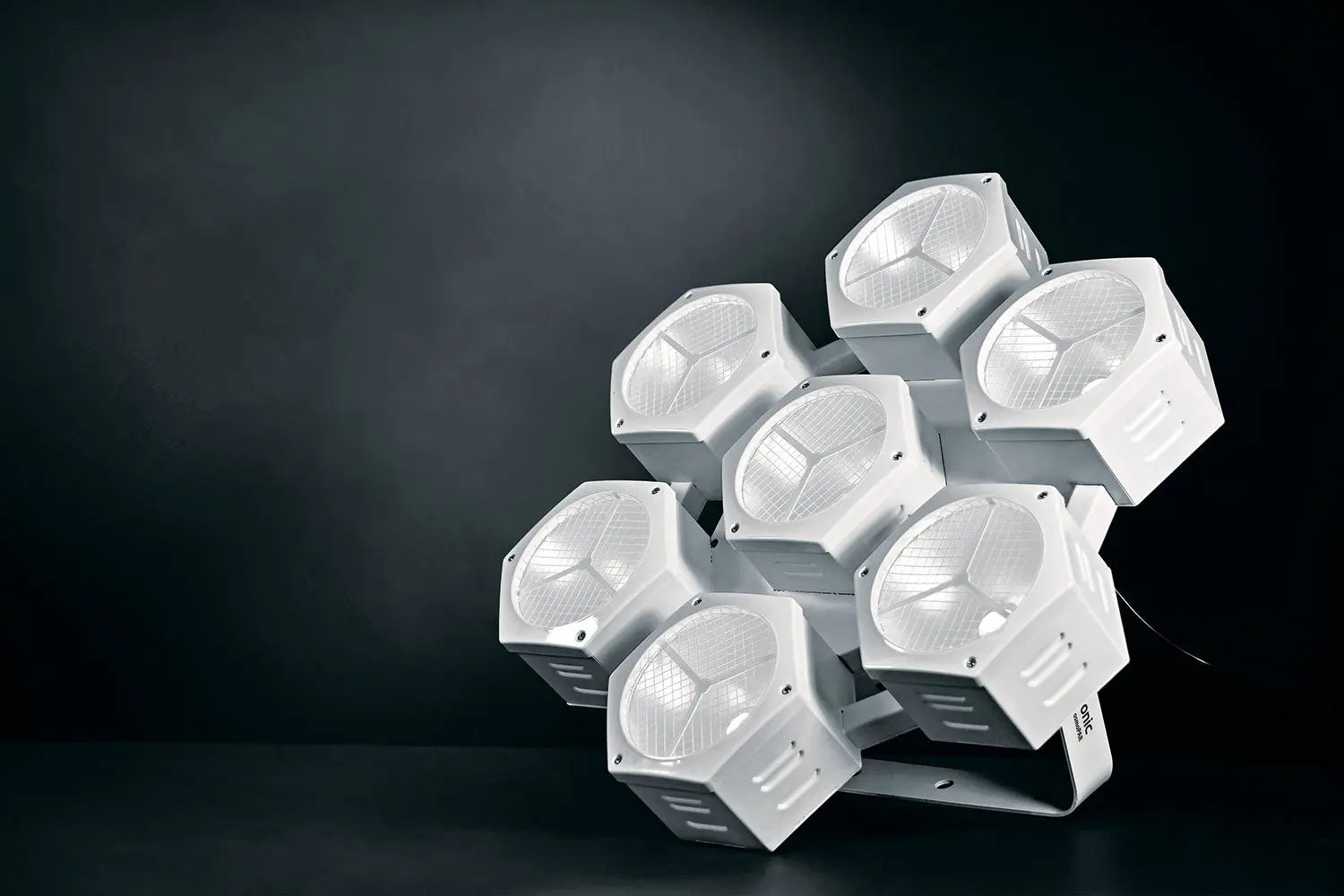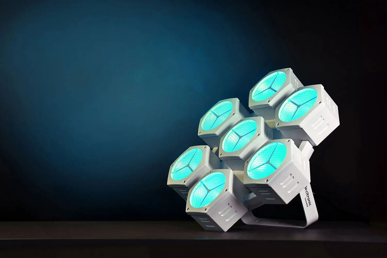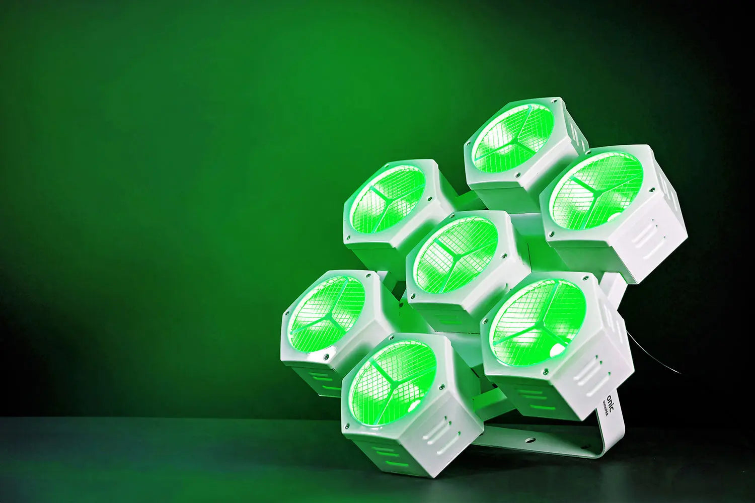Introducing the CosmoPAR-LE, a stunning re-incarnation of our award nominated fixture in a limited edition white finish. This heavy-duty retro-style PAR light is fitted with 7 bright 40W RGBW COB LEDs that produce a vast array of eye-popping colours, patterns and effects. The unit can be controlled by auto, sound-to-light, master/slave programs or via 6/9/21/30 channel DMX if more precise control is required. Produces an amazing wall of brilliant colour when connected to multiple units, ideal for stage backgrounds and larger events.