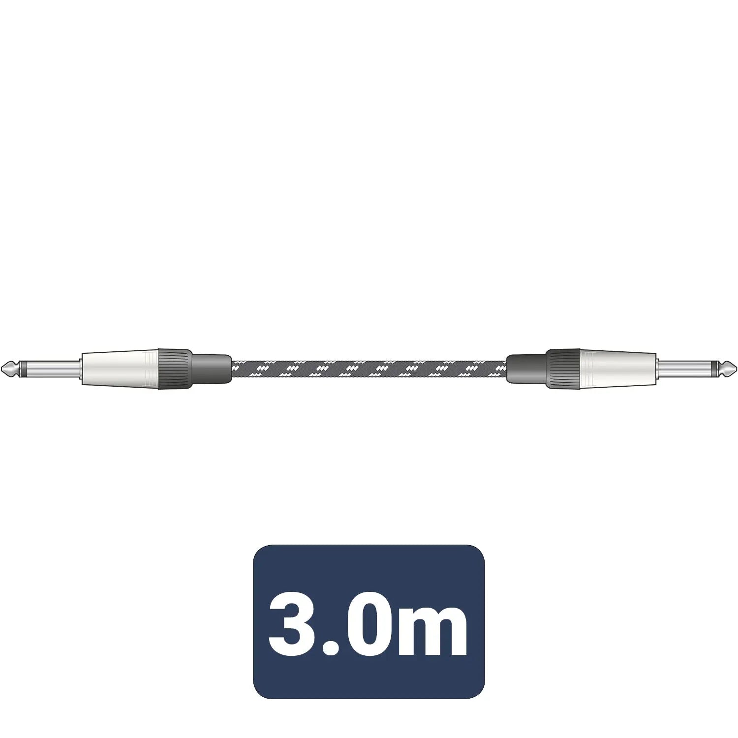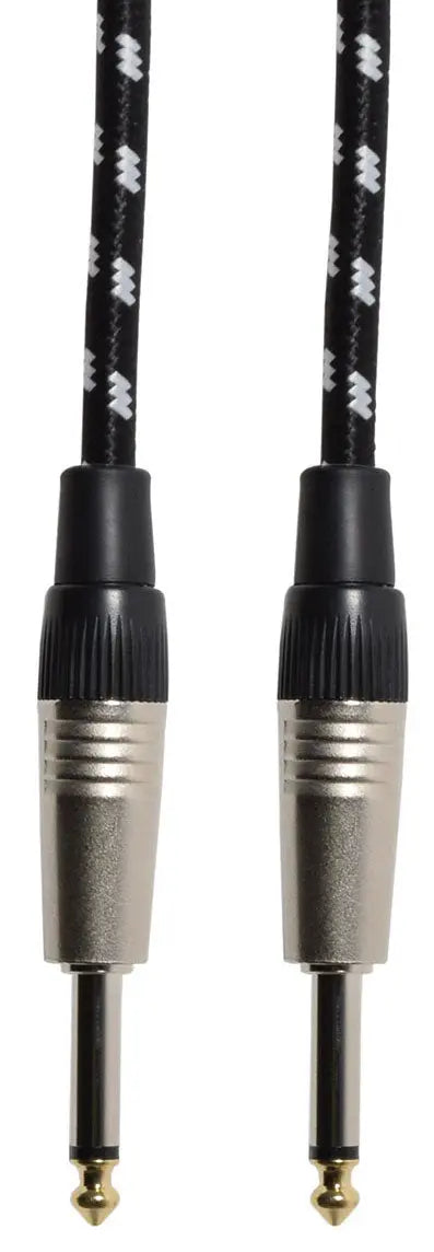 A retro style, nylon-braid-covered guitar, instrument or audio lead for unbalanced signals. The anti-tangle braiding provides added protection for the cable within; made with pure copper conductors and cotton-reinforcement; a soft-grip, anti-tangle, rubberised jacket; machine-soldered connections; and professional, die-cast 6.3mm straight mono jack plugs.