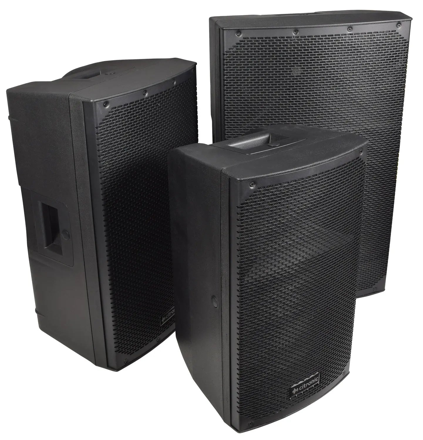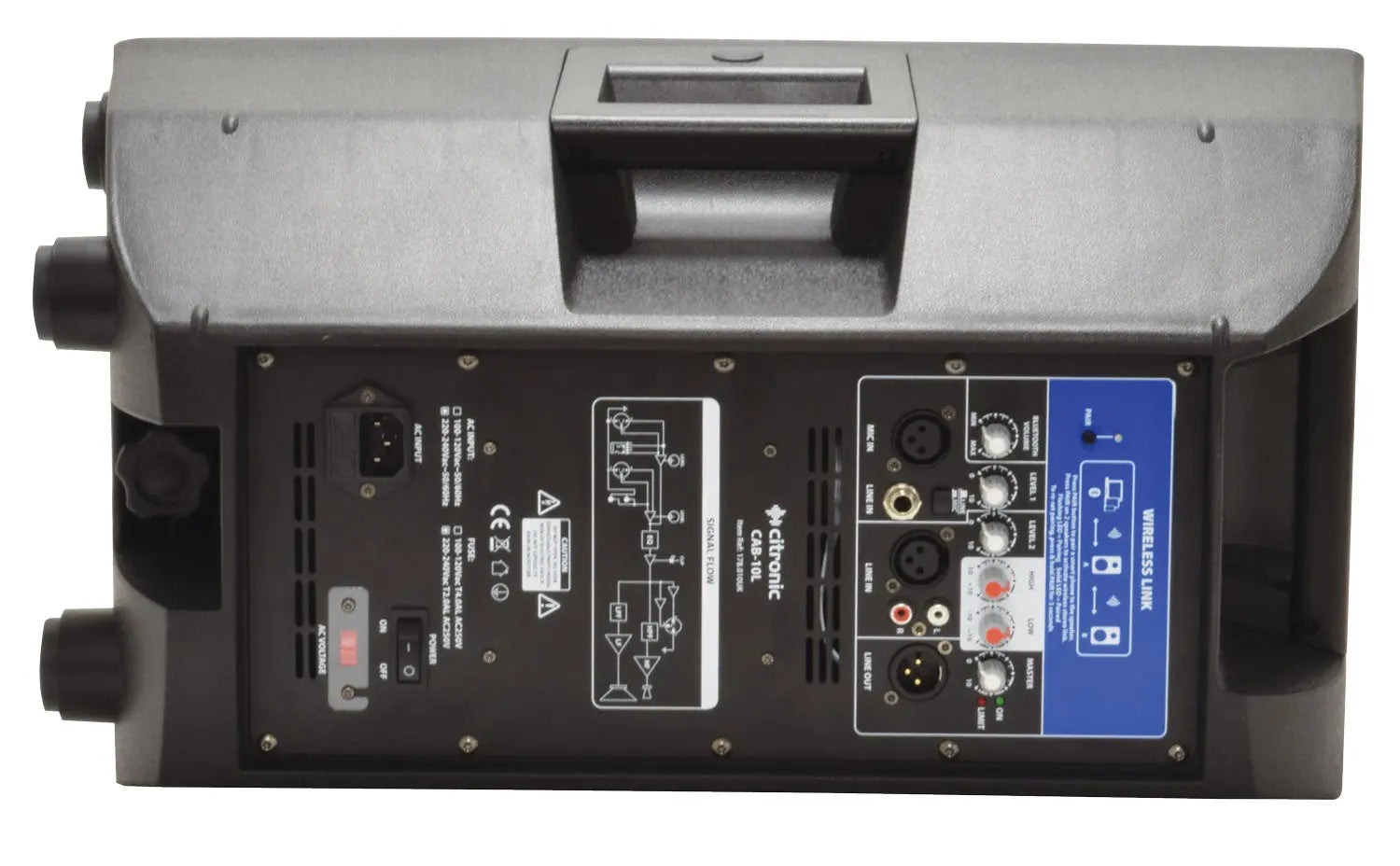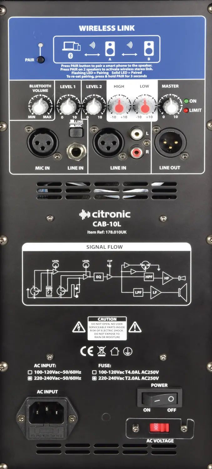 Active PA speakers with BT wireless connection and stereo link capability, housed in a compact and lightweight moulded PP enclosure. Custom designed low and high frequency drivers are powered by a digital amplifier circuit for powerful and energy-efficient performance. A switchable Mic/Line input and separate Line input are provided along with a Bluetooth receiver for playback from a smart phone or tablet. The BT section also has a link function which allows wireless connection to another CAB series speaker to form a stereo pair (Bluetooth signal only). Maximum sound output with minimal size, weight and setup time.