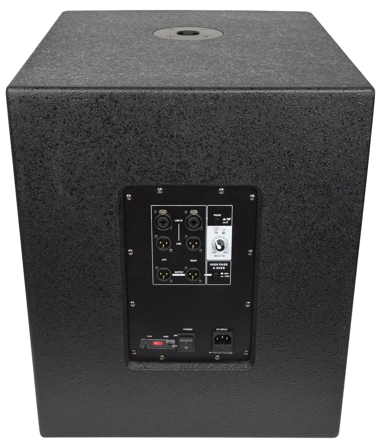 Lightweight yet powerful active subwoofer units with inbuilt class D amplifiers. Each cabinet is constructed from 15mm MDF with integral side handles for easy portability and 35mm socket to accommodate a mounting pole. The high flex sub driver is front-loaded with a protective steel grille to deliver powerful transients and add warmth to any sound system. The class D amplifier section has stereo line inputs and outputs to allow use either as a mono sub with stereo tops or a matching sub for each top speaker. Line inputs have a parallel Link output to pass the signal onto further active speakers and a pair of line outputs with switchable high pass filter to connect to active top cabinets. A phase switch is included to help avoid sound cancellation and time-align multiple speaker setups. Designed as a perfect match for the CASA series speakers and equally at home with other active full range cabinets.