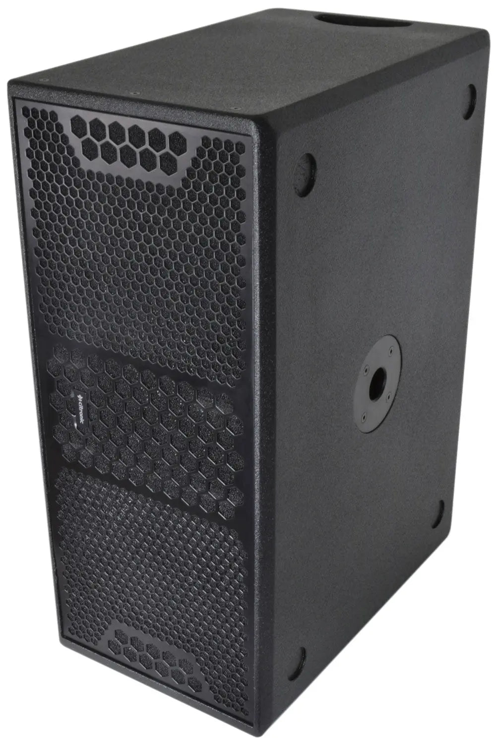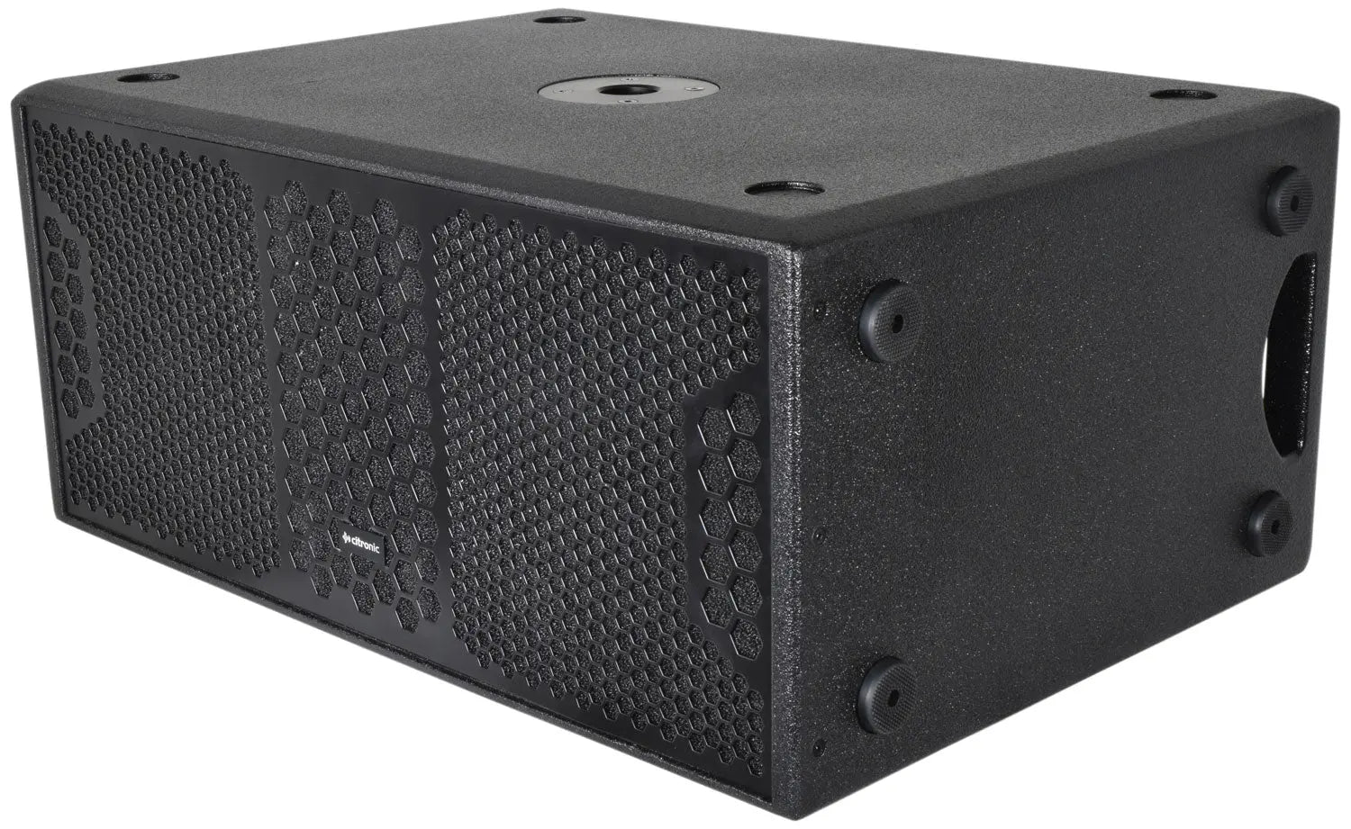 Dual driver active subwoofer cabinet with internal amplifier for mobile and fixed sound reinforcement. Inputs and outputs for 2 channels can be used for independent signals, enabling a 2.1 system setup with 2 full-range cabinets. Each input has independent level control, giving the option of adjusting the sub content for either channel at will. Preset DSP control accurately filters low frequencies to the class-D amplifier section to drive the twin 10" woofers up to 600Wrms output. A phase switch can be used to correct time-alignment or out-of-phase situations. This sub unit can be positioned flat to accept a 35mm pole to mount a full-range speaker or upright for a smaller footprint. The form factor of this cabinet also makes it ideal for discreet installation.