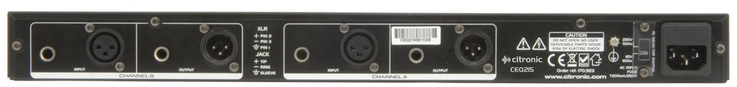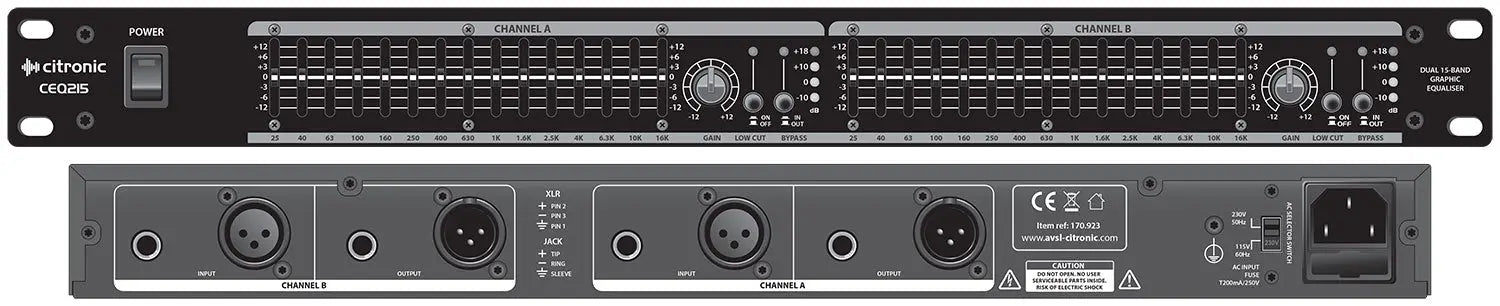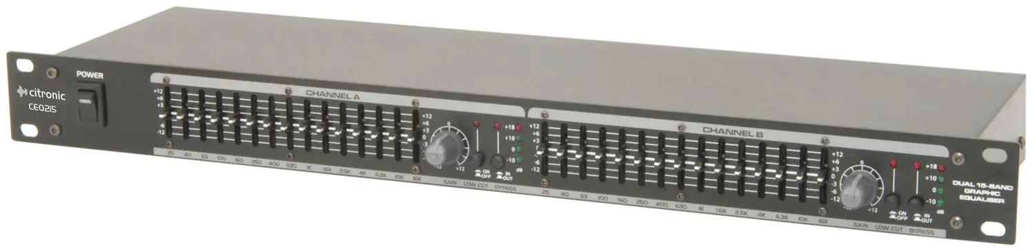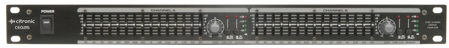 The CEQ215 is a 19" rack mounted dual 15-band graphic equaliser, which allows the adjustment of labelled frequencies via the individual cut/boost faders. Up to 12dB of cut or boost for frequencies ranging from 25Hz to 16kHz for accurate audio spectrum control.