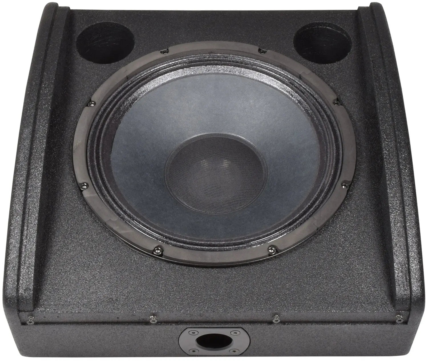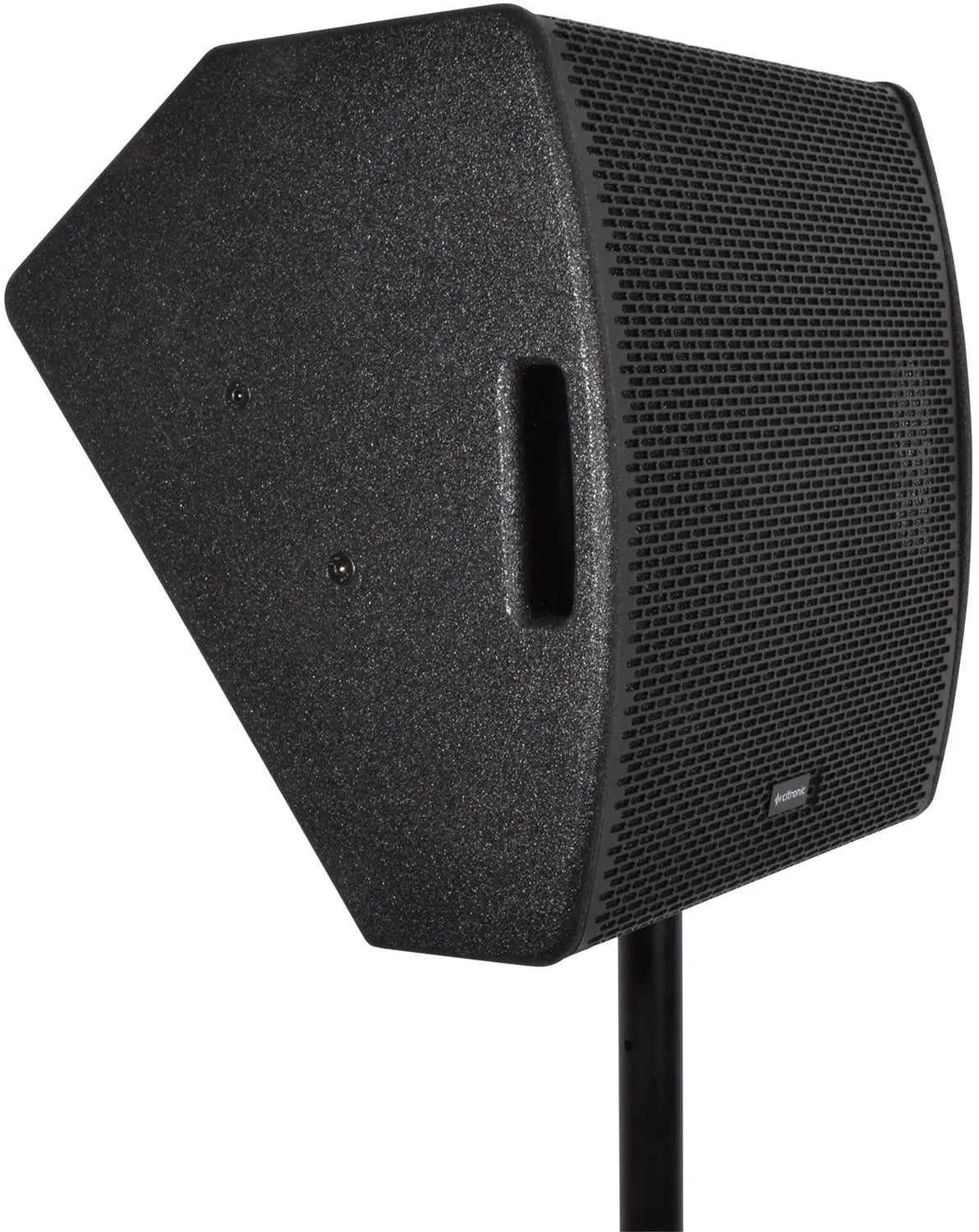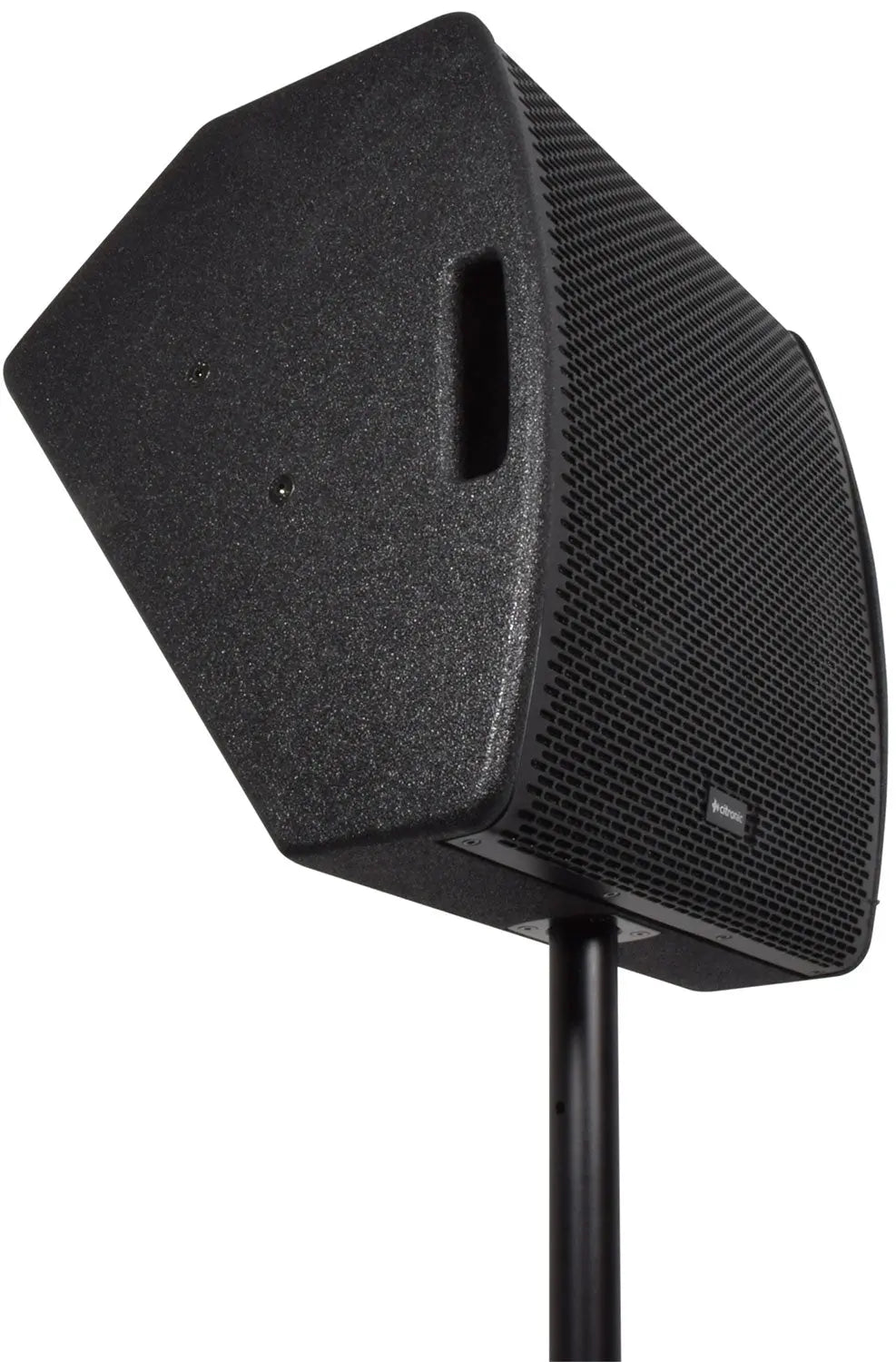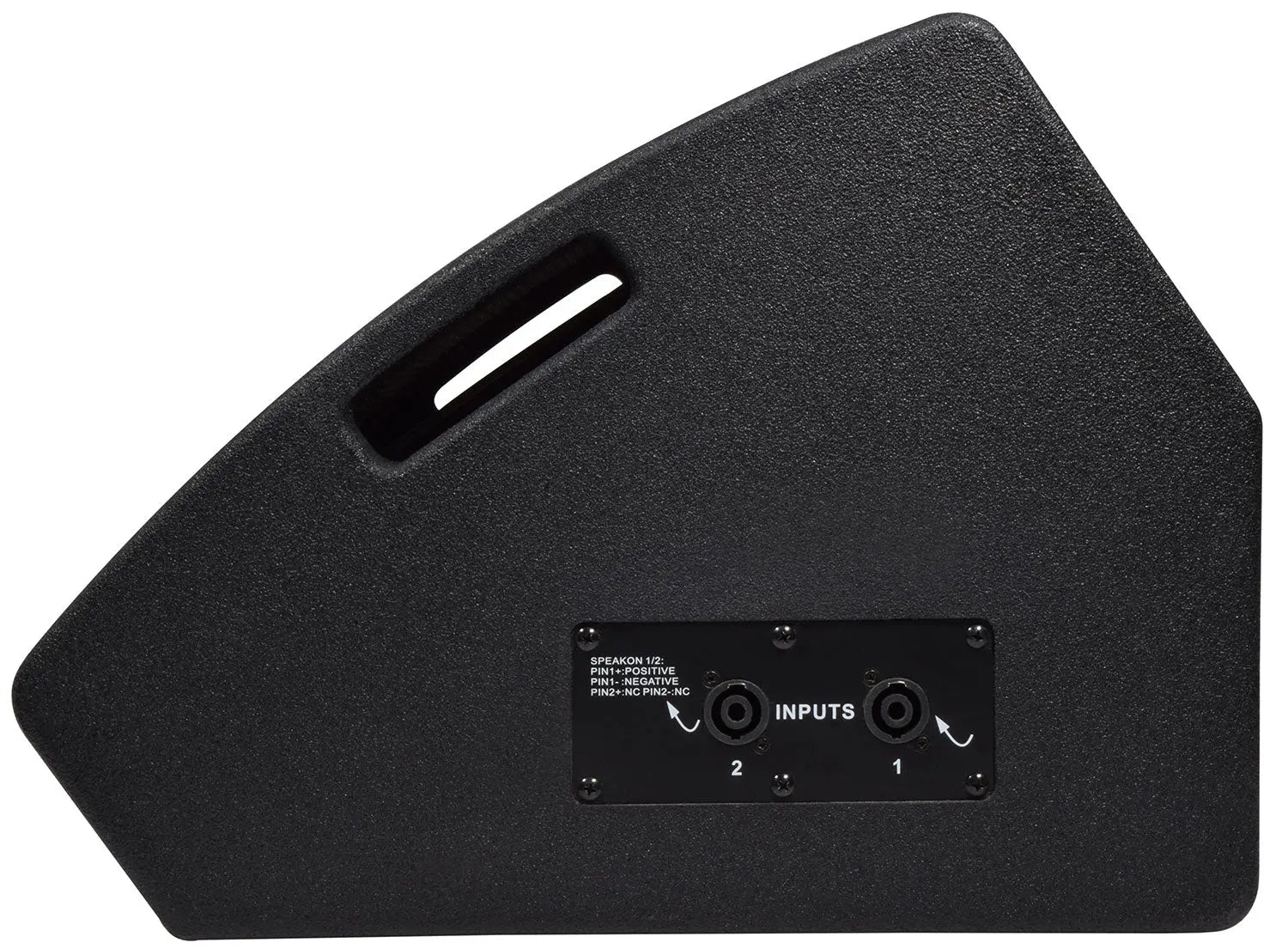 Passive wedge speaker in a durable, texture coated plywood cabinet with minimal footprint. The main driver delivers punchy low frequencies with the help of 2 bass ports and a concentric titanium tweeter is mounted within the main driver for perfectly aligned, sparkling high frequencies. An arched powder-coated steel grille provides heavy duty protection from the rigours of stage performances and forms 2 side handle holes for easy portability. A pair of twist-lock SPK connectors are wired in parallel to accept input from an amplifier and enable connection onto a further passive speaker or monitor if required. The compact size and high power handling means that this is a very capable unit for stage foldback but can equally serve as a compact PA speaker, thanks to its 35mm pole-mount socket and M8 flying points.