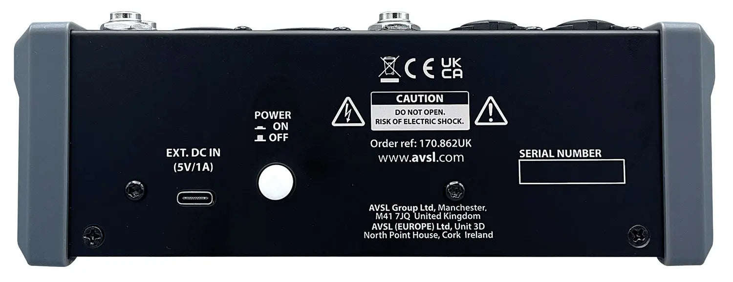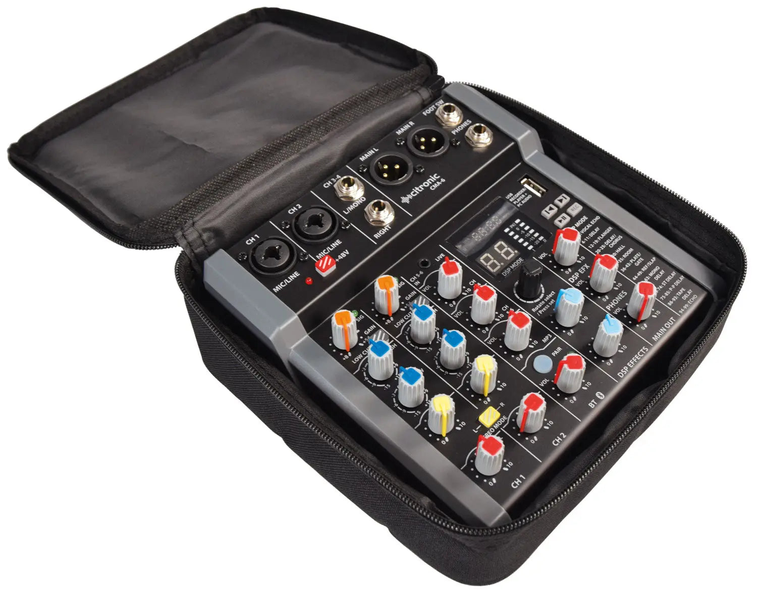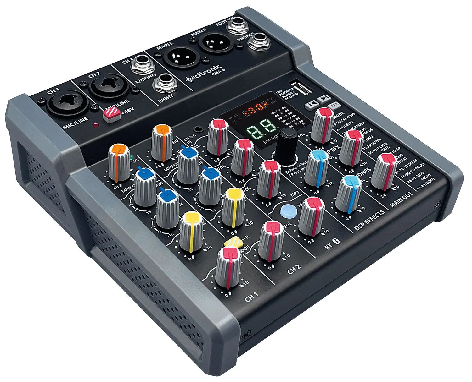 Compact format audio mixer with 2, 4 or 6 mono input channels, a stereo line input and a further minijack stereo input. Each mono mic/line channel has a combo XLR/jack input with +48V phantom power switchable in pairs for the XLR inputs. Each mic/line channel has a Gain control for matching the input source and a low-cut switch to filter out rumble or handling noise from microphones. Each mono channel also has High/Low EQ controls and an FX level control. Pairs of mono channels can be linked to act as a stereo left + right pair as required. The onboard foot-switchable DSP effects engine has 99 presets for delay, reverb and modulation effects, each of which can be adjusted using two parameter controls. An onboard Bluetooth receiver has an illuminated pairing button and independent volume control. The USB type-A port on the top panel is for playback of audio files or can be used to record the main outputs to a USB storage device or as an external audio device when connected to a laptop. Output is delivered to a pair of balanced XLR connectors to provide low noise operation for high quality studio or live performances.