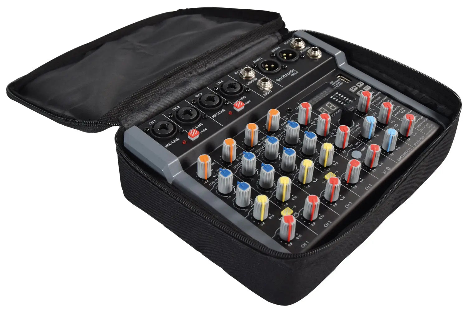 Compact format audio mixer with 2, 4 or 6 mono input channels, a stereo line input and a further minijack stereo input. Each mono mic/line channel has a combo XLR/jack input with +48V phantom power switchable in pairs for the XLR inputs. Each mic/line channel has a Gain control for matching the input source and a low-cut switch to filter out rumble or handling noise from microphones. Each mono channel also has High/Low EQ controls and an FX level control. Pairs of mono channels can be linked to act as a stereo left + right pair as required. The onboard foot-switchable DSP effects engine has 99 presets for delay, reverb and modulation effects, each of which can be adjusted using two parameter controls. An onboard Bluetooth receiver has an illuminated pairing button and independent volume control. The USB type-A port on the top panel is for playback of audio files or can be used to record the main outputs to a USB storage device or as an external audio device when connected to a laptop. Output is delivered to a pair of balanced XLR connectors to provide low noise operation for high quality studio or live performances.