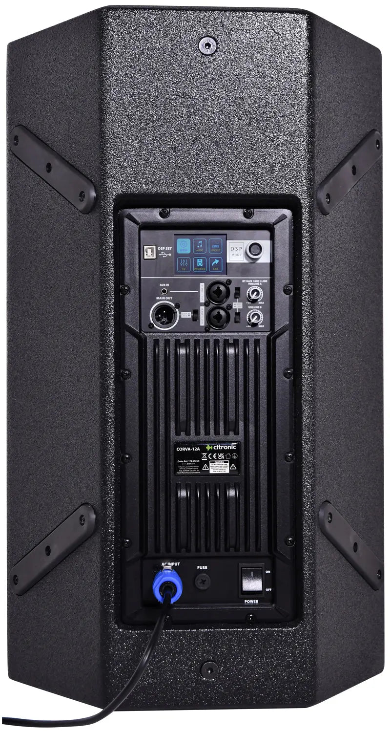 CORVA active speaker cabinets are a milestone in the Citronic commitment to high quality sound at all levels, packing a remarkable level of output into a single heavy duty cabinet. Designed for stacking or pole mounting, these cabinets can equally be deployed at height, using the 12 x M8 flying points. Each enclosure is loaded with specially designed heavy duty drivers to deliver powerful and immediate sound pressure levels. Each powerful class-D amplifier section is DSP controlled with a menu-driven colour display for setting EQ profiles, dynamics and gain. In-depth editing is enabled via a USB interface to connect a PC and accurately adjust, test and save custom DSP settings. For larger sound reinforcement applications, CORVA active cabinets have the capability and flexibility to provide big sound on demand.
