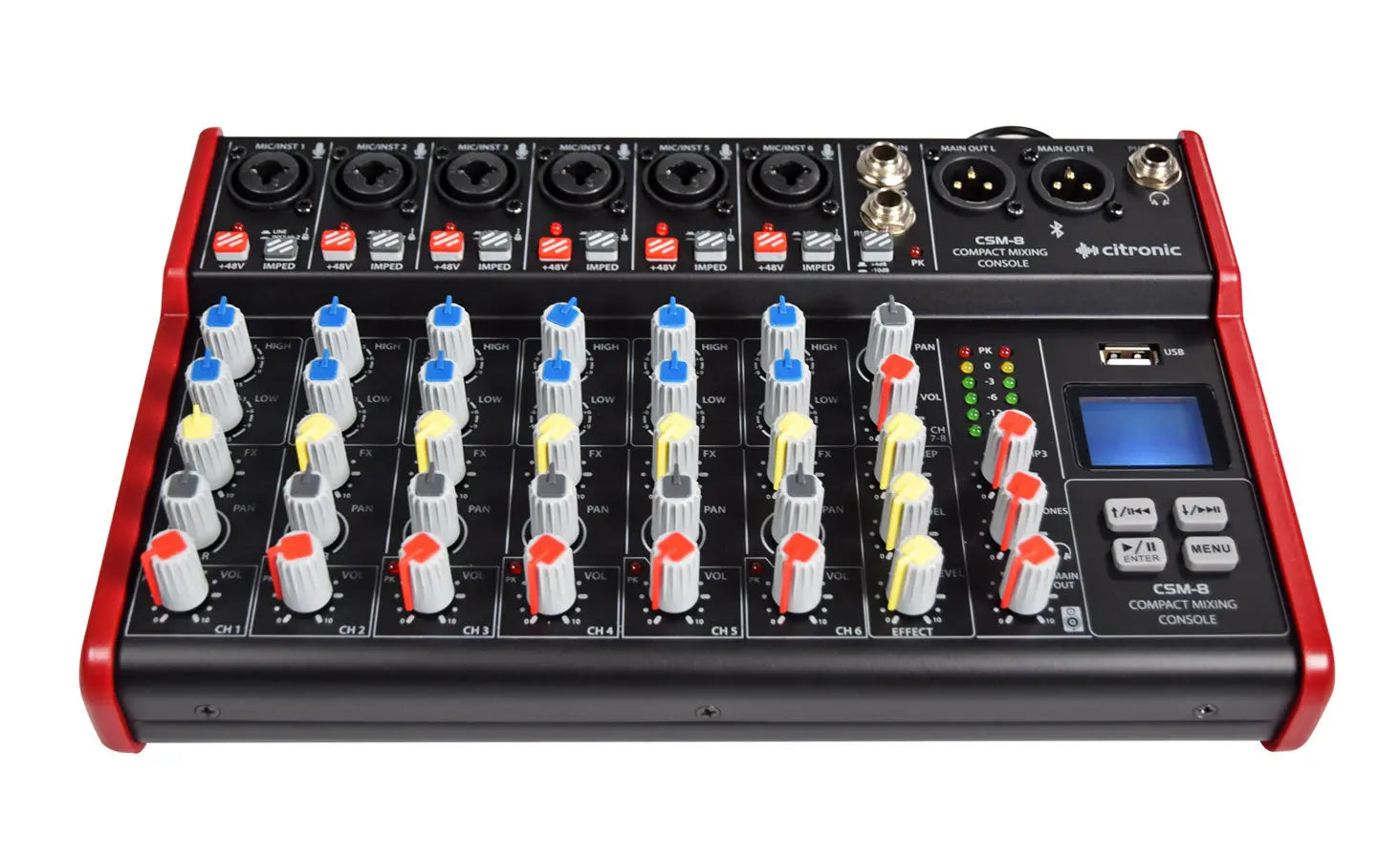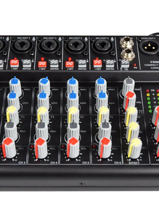 The CSM-8 is a compact mixer for live use or recording with 6 balanced mic inputs and an additional stereo input. The mic inputs have 2 band EQ FX (delay) level control pan control and phantom power. The CSM range feature a USB and Bluetooth player and recorder uilt in. Stream music from your phone or tablet to the mixer or playback from a USB stick. You can even record your mix directly to the USB stick too.Ā The menu is simlpe to use and navigate thanks to the large LCD display. Outputs are on balanced XLRs with a headphone monitor output as well. Ā Ā