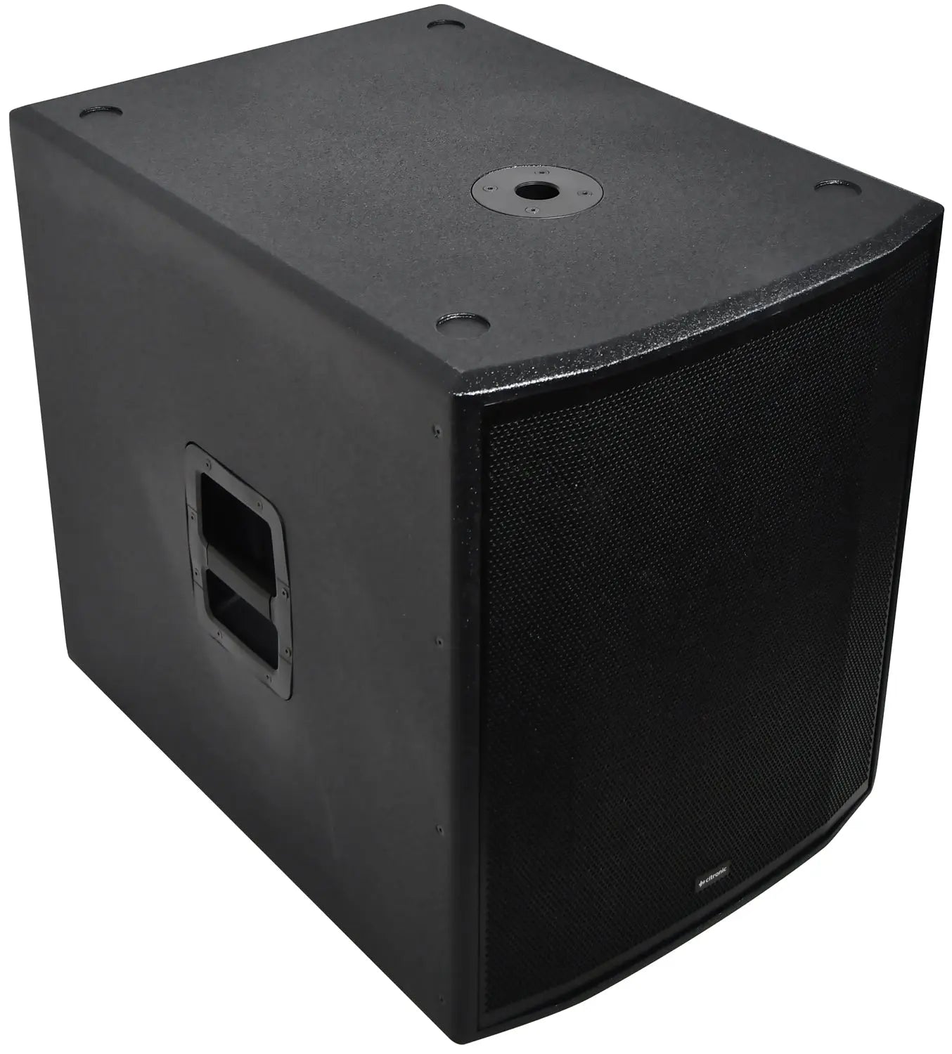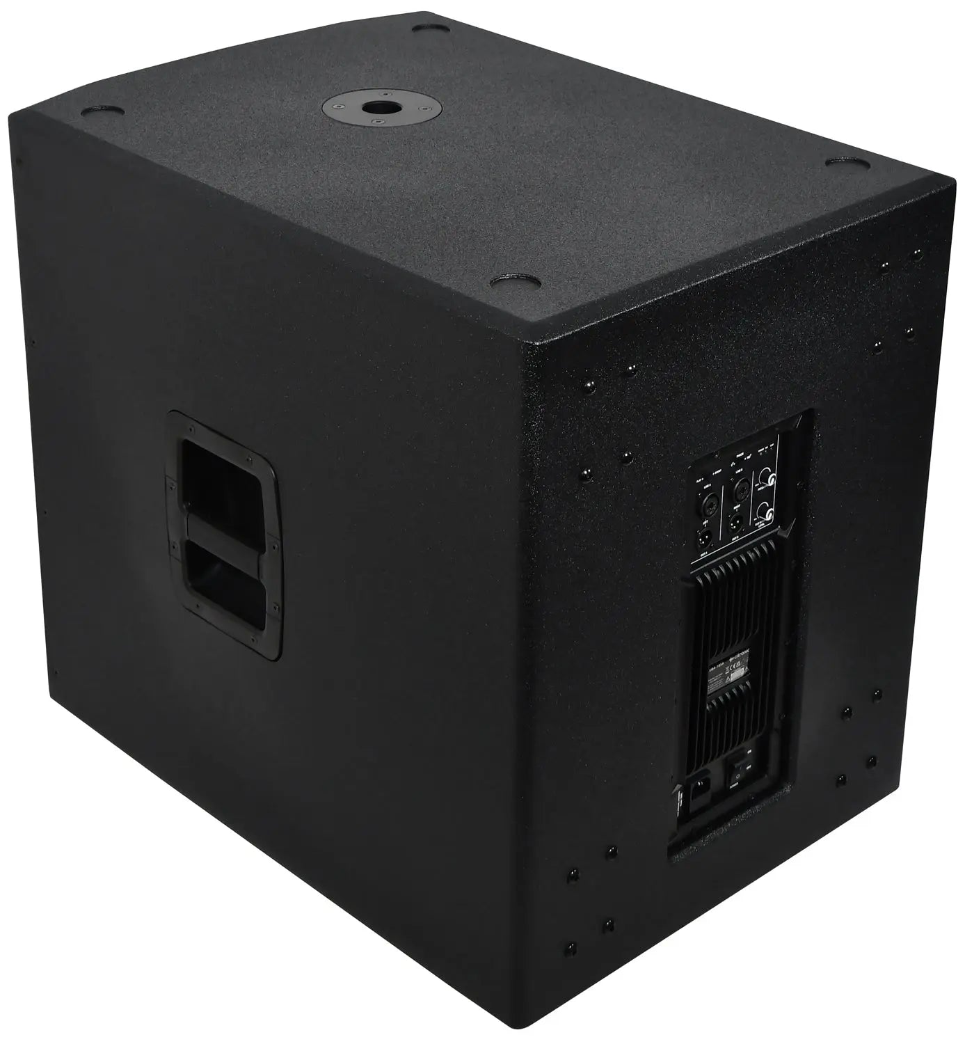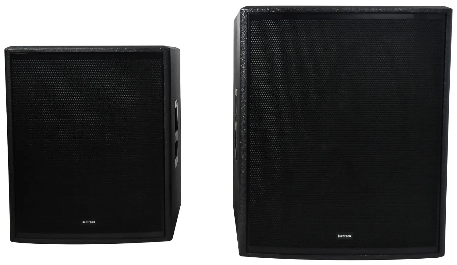 CUBA-series high output active subwoofer cabinets with internal amplifier. Each cabinet is constructed from 15mm MDF and coated in a durable textured polyurea material with a powder coated steel grille. Carrying handles are built into each side of the cabinet with a top mounted 35mm socket for pole mounting a top cabinet. A single high energy sub frequency driver is driven by a fixed DSP controlled class-D amplifier to develop high sound pressure output, accurately reproducing heavy dynamics and giving body to a full range system. Designed to match with higher output full range cabinets in the Citronic range or as part of any PA system that needs powerful and fast attacking sub content.