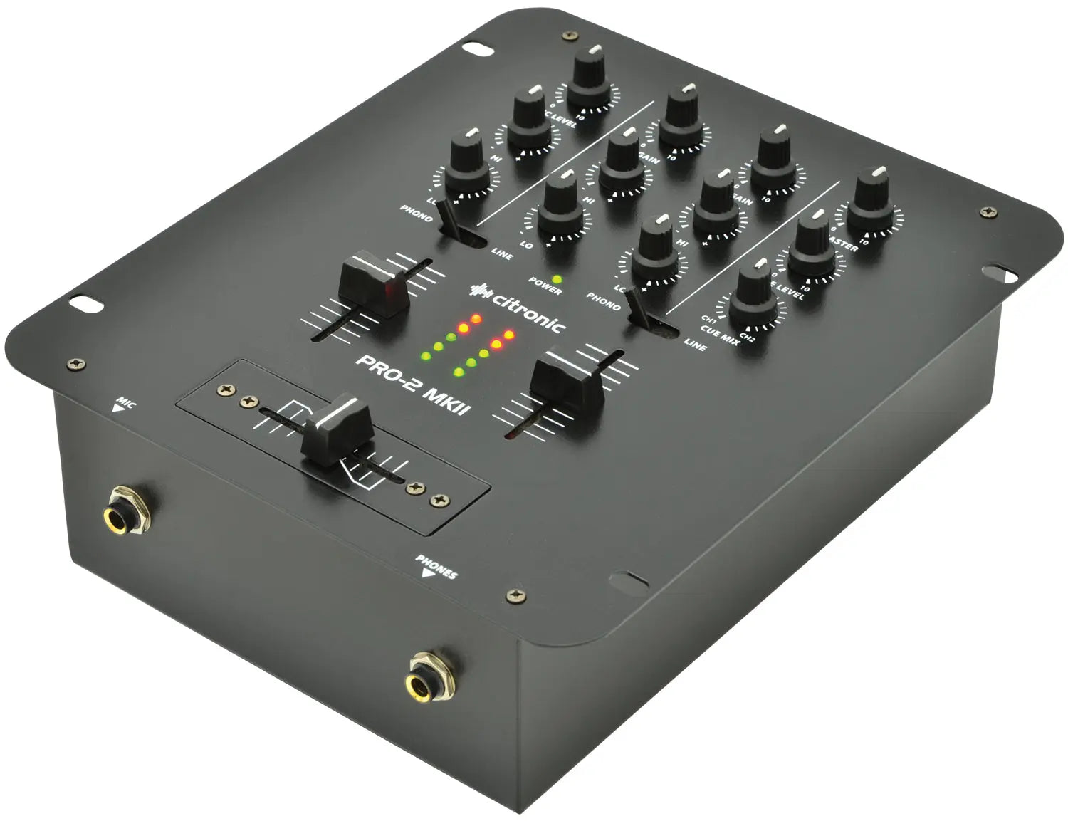 The PRO-2 MKII is a straightforward traditional two-channel mixer with a solid build quality and an uncluttered layout. It has high quality faders, sturdy rotaries and includes a dedicated microphone input with two-band EQ and level control. The monitor section features a rotary control to switch between channels 1 and 2 allowing the user to have a mix of both channels at the same time through the headphones.