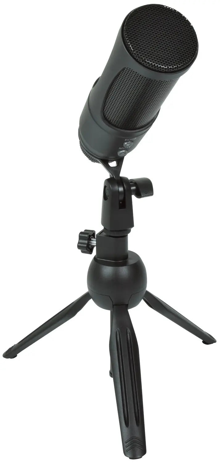 Compact studio condenser microphone for podcasting and vocal recording. Fitted with a back-electret capsule, driven by an onboard preamp. Echo effect and mute function are switchable via 2 illuminated buttons at the front. Connection to a PC or Mac computer is via the supplied USB lead and operates as a plug & play USB audio device.The complete assembly is housed in a black anodised die-cast body with a large steel grille for the capsule. Supplied with a collar clamp and mini tripod for convenient, table-top operation.