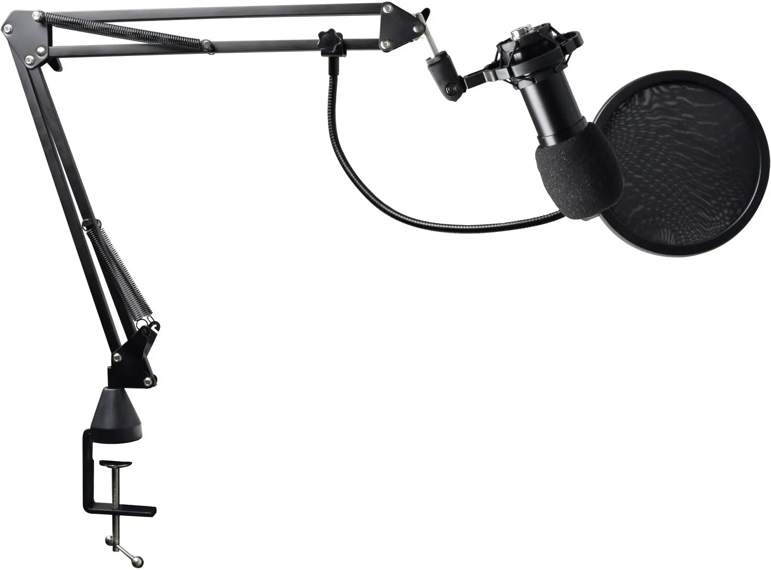 Complete recording kit comprising a USB condenser microphone with shock mount, pop filter, pop shield, USB type B to A lead and adjustable arm mount with clamp. Designed for use with either a PC or Mac computer running a digital recording software suite. The UMK-7 delivers clear vocal or instrument pickup to provide studio quality results from an affordable and uncluttered setup.