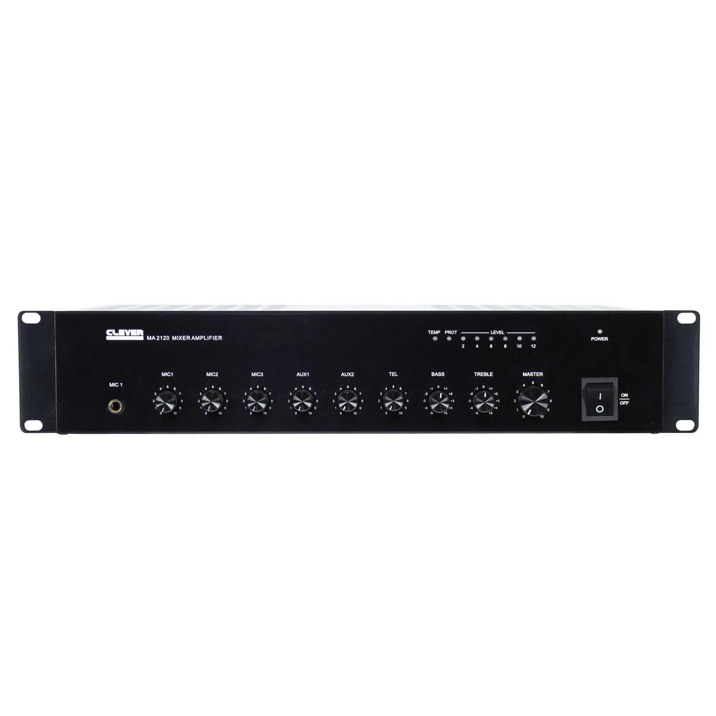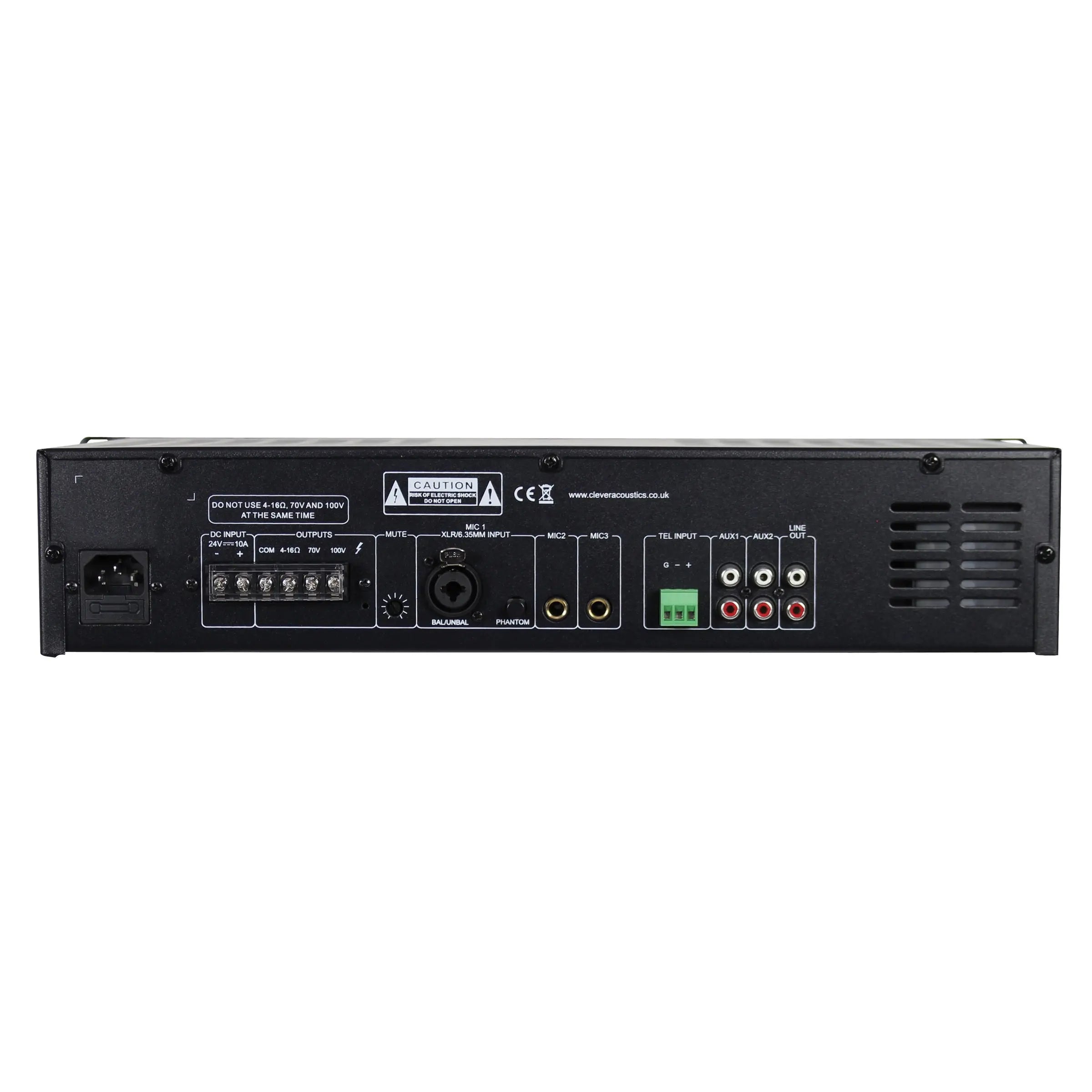 The MA 2120 is ideal for installation into shops offices and commercial premises. Featuring three microphone inputs two AUX inputs and one telephone input. MIC 1 features switchable +48V phantom power and adjustable VOX priority over the other inputs. Individual gain controls for microphone and AUX inputs plus controls for bass treble and master volume. 3 year warranty 19" rack mountable chassis (removable rack ears) 70V 100V and low impedance 4-16Ω loudspeaker outputs Three microphone inputs telephone input and two AUX inputs via phono socket Mic 1 features VOX priority and VOX level on rear panel Mic 1 2 and 3 AUX 1 2 telephone and master volume controls and bass/treble tone controls Switchable +48V phantom power on mic 1 Line output via phono sockets Short circuit overload and high temperature protection Built-in priority functions for telephone override for AUX 1 and 2 and mic 1 2 and 3 Optional DC input for use with battery backup power sources or for operation using high capacity batteries LED VU meter with temperature and protect indication Convection cooled for silent operation