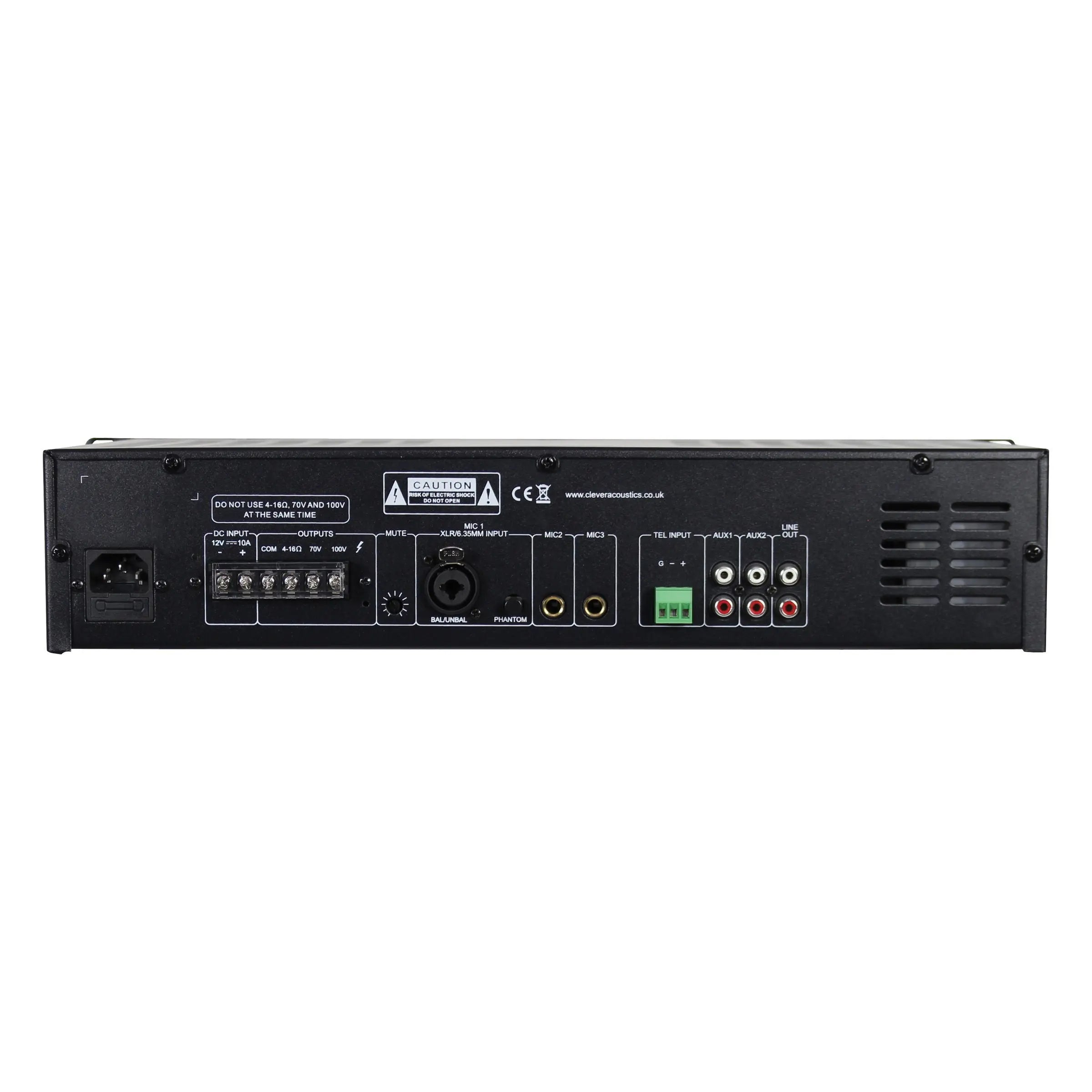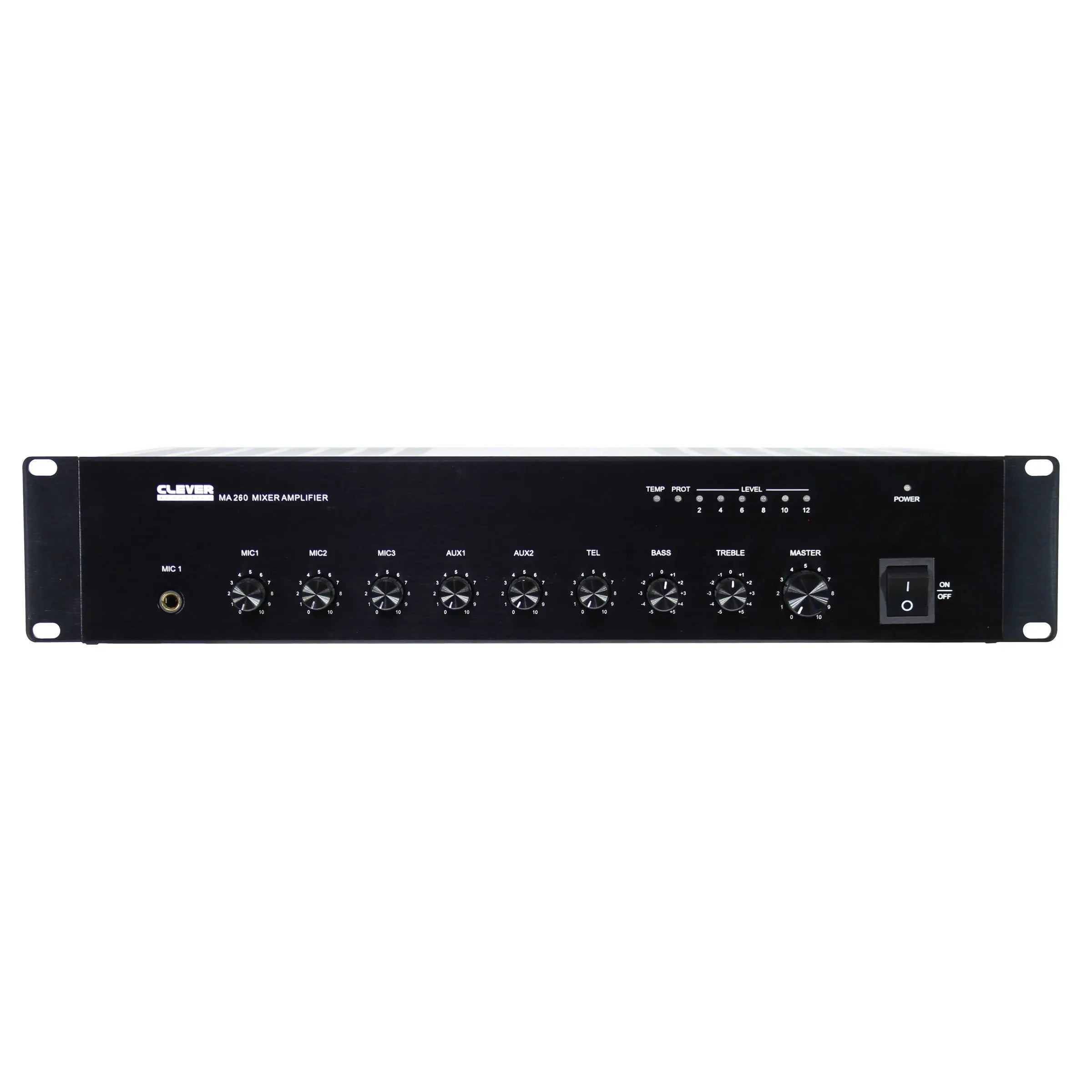 The MA 260 is ideal for installation into shops offices and commercial premises. Featuring three microphone inputs two AUX inputs and one telephone input. MIC 1 features switchable +48V phantom power and adjustable VOX priority over the other inputs. Individual gain controls for microphone and AUX inputs plus controls for bass treble and master volume. 3 year warranty 19" rack mountable chassis (removable rack ears) 70V 100V and low impedance 4-16Ω loudspeaker outputs Three microphone inputs telephone input and two AUX inputs via phono socket Mic 1 features VOX priority and VOX level on rear panel Mic 1 2 and 3 AUX 1 2 telephone and master volume controls and bass/treble tone controls Switchable +48V phantom power on mic 1 Line output via phono sockets Short circuit overload and high temperature protection Built-in priority functions for telephone override for AUX 1 and 2 and mic 1 2 and 3 Optional DC input for use with battery backup power sources or for operation using high capacity batteries MA 260 perfect for vehicle PA systems allowing public announcements on the move LED VU meter with temperature and protect indication Convection cooled for silent operation