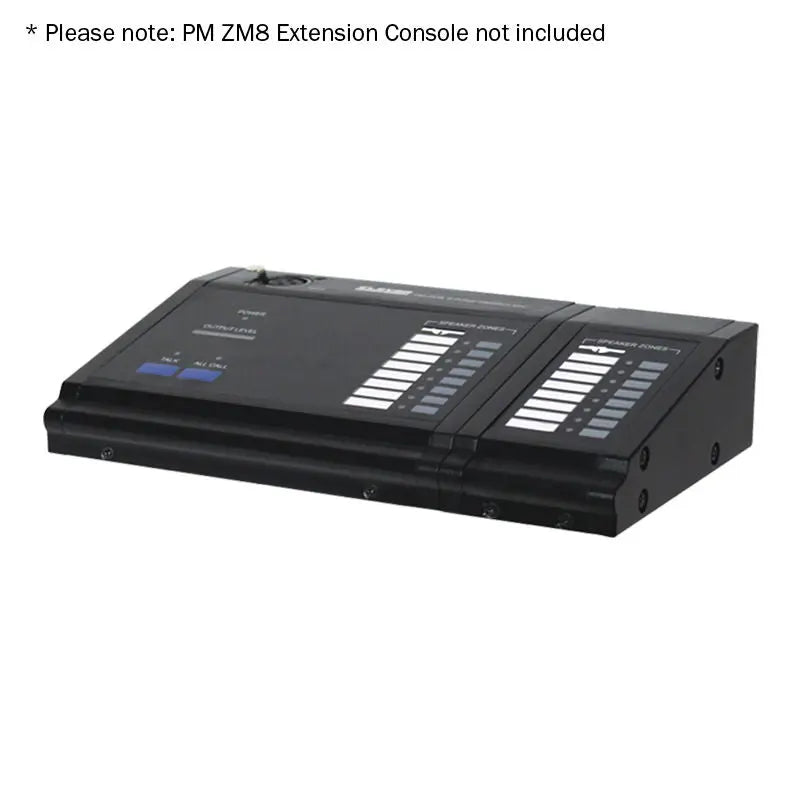 The PM ZM 8 is a dedicated remote paging console for the ZM 8 Zone Mixer which is connected through a standard CAT 5 cable for zone announcement or communication at a remote location from the ZM 8. 3 year warranty 8 zone selector with state indication Talk and all zone paging swift keys are provided 2 or 4 tone chime with selector and off switch Volume controls are provided for chime and microphone Indicators include individual zone busy paging power and output level to provide a direct visualisation Only for use with the ZM 8 Zone Mixer (CRAM19)