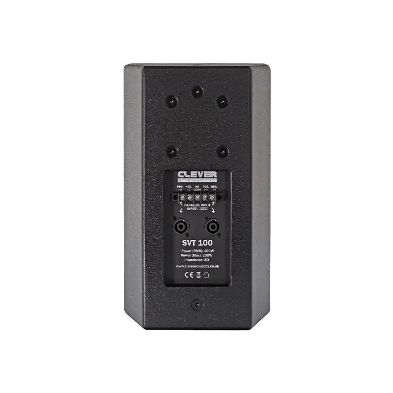 The SVT 100 is an excellent sound reinforcement or background music loudspeaker and can be oriented in a vertical or horizontal position. It has been designed for installation and with the use of the included bracket it can be mounted on a wall or ceiling. Alternatively these speakers feature fly points and BRAC03/BRAC04 mounts. Also for ease of installation the SVT 100 features both speakON and screw terminals all in a parallel configuration. The SVT 100 cabinets also feature a rotatable horn flare which allows an installer to tailor the HF dispersion to vertical or horizontal cabinet installations. 3 year warranty Continuous power (RMS): 100W Peak power: 200W Max. calculated SPL: 114dB Sensitivity (1W/1m): 90dB Frequency response: 75Hz-20kHz Crossover frequency: 2.7kHz Horizontal coverage: 90° Vertical coverage: 60° LF transducers: 6” / 150mm HF transducers: 1” / 25mm Nominal impedance: 8Ω Connections: 2 x speakON connectors and barrier strip Mounting options: Includes bracket and fly points and features pre-prepared mounting points on rear for BRAC03/BRAC04