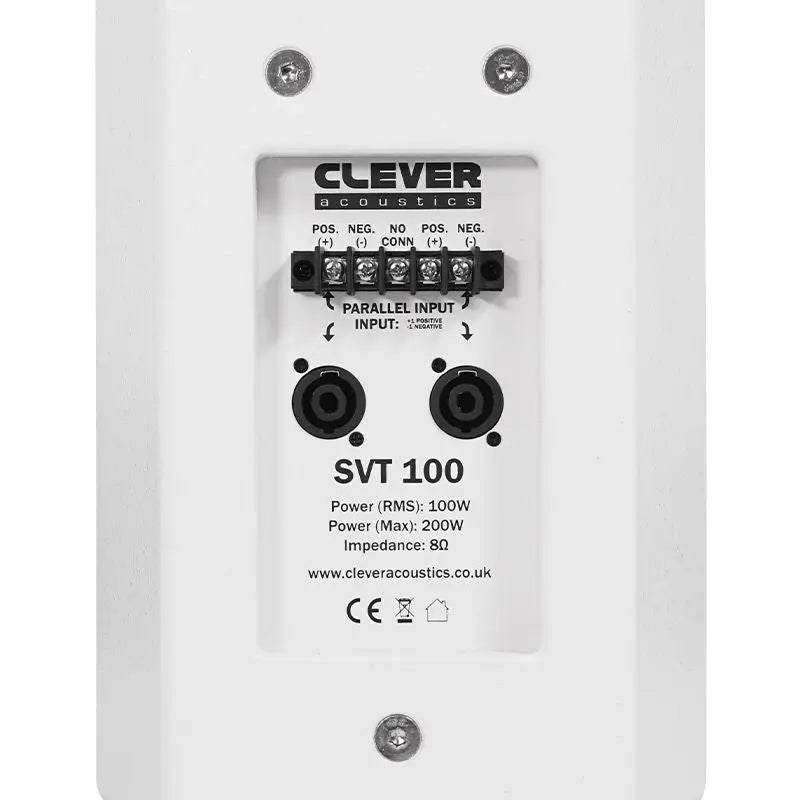 The SVT 100 is an excellent sound reinforcement or background music loudspeaker and can be oriented in a vertical or horizontal position. It has been designed for installation and with the use of the included bracket it can be mounted on a wall or ceiling. Alternatively these speakers feature fly points and BRAC03/BRAC04 mounts. Also for ease of installation the SVT 100 features both speakON and screw terminals all in a parallel configuration. The SVT 100 cabinets also feature a rotatable horn flare which allows an installer to tailor the HF dispersion to vertical or horizontal cabinet installations. 3 year warranty Continuous power (RMS): 100W Peak power: 200W Max. calculated SPL: 114dB Sensitivity (1W/1m): 90dB Frequency response: 75Hz-20kHz Crossover frequency: 2.7kHz Horizontal coverage: 90° Vertical coverage: 60° LF transducers: 6” / 150mm HF transducers: 1” / 25mm Nominal impedance: 8Ω Connections: 2 x speakON connectors and barrier strip Mounting options: Includes bracket and fly points and features pre-prepared mounting points on rear for BRAC03/BRAC04