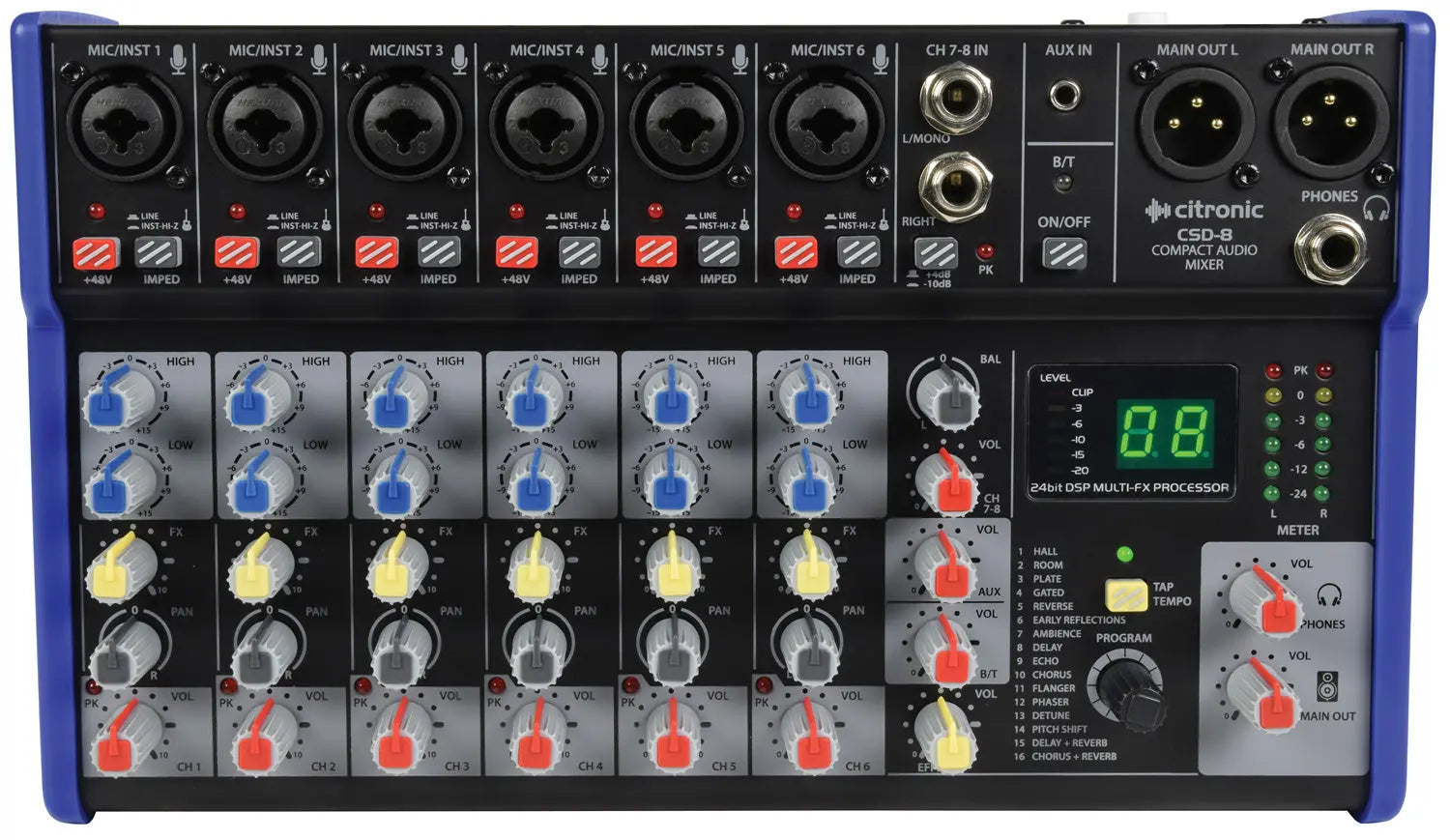 Compact format audio mixer with 2 4 or 6 mono input channels and a stereo line input. Each mono channel has a combo XLRjack input with individually switchable micinstrument impedance and +48V phantom power for the XLR. Input channels have HighLow EQ and Pan controls. The Bluetooth pairing button enables wireless connection to a smart phone or tablet for playback. All CSD mixers feature a 16 program DSP effects section with digital reverbs delays and modulation effects for vocals and instruments. Output is delivered on a pair of balanced XLR connectors and offers very low noise operation for high quality studio or live performances.Bluetooth pairing for smartphone or tablet 16 program 24-bit DSP effects engine Individually switchable +48V phantom power Supplied with DC power adaptor