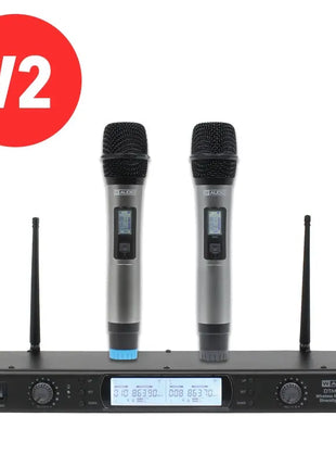 DTM seriesĀwireless microphonesĀfeature twin UHFĀbelt packĀorĀhandheld systemsĀwith 20 (863-865Mhz) selectable frequencies. The Channel 70 (863-865Mhz) system utilises a true diversity full bandwidth receiver for the ultimate in RF stability. Outstanding vocal reproduction and stable wireless connectivity allow freedom of movement on stage. These systems offer crystal clear sound reproduction and rock solid reliability. Metal bodied transmitters feature ergonomic design with a rugged housing to stand up to the rigours of the road. The flexibility of the handheld systems may be increased by purchasing the additional DTM 800BP. - Phase Lock Loop (PLL) - IR sync facility for simple setup - True diversity receiver 863-865Mhz - 20 frequencies - Large LCD receiver display including RF level AF level channel and frequency - LCD transmitter display - Removable BNC antennae - Auto frequency scanning - Balanced XLR output for each channel plus unbalanced mixed output - Frequency response (handheld): 40Hz-15kHz - Audio output level: 400mV - Dynamic range: 96dB - Full width rack mount receiver - Up to 2 DTM 800 systems can be used simultaneously - Optional 12V DC 1000mA EU power supply available: Order code MIC70P - Loaded with Version 2 Software Ā