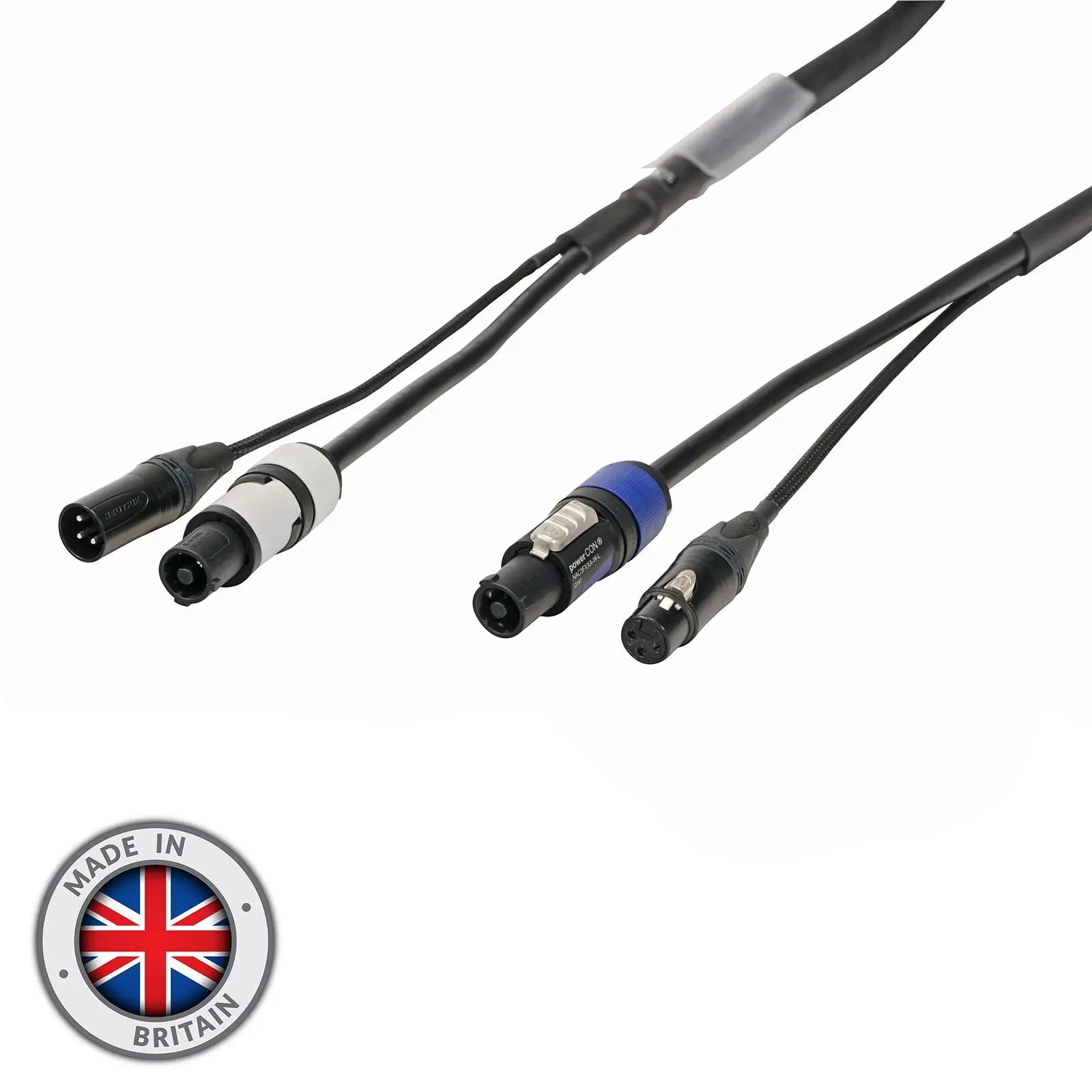 Hybrid multicore DMX signal plus power cables for linking lighting fixtures together in a convenient single outer jacket for speed of rigging while allowing the user to keep cable runs neat and tidy. These British manufactured cables are finished using nylon braided sleeving over the signal cable tail for maximum durability and terminated with Neutrik connectors. These are ultra flexible and designed for touring use providing a solution to the problem of integrated signal and power distribution. Constructed using carefully selected fillers to maintain the overall shape and facilitate easier coiling. Made in Britain Neutrik connectors 3-Pin XLR male plus powerCON FXXB male to 3-Pin XLR female plus powerCON FXXA female Nylon braided signal cable secured by adhesive lined heatshrink Analogue or AES digital audio RS422/485 or DMX512 control with a 3-core power cable H05VV-F harmonised standard 2.5mm² power core Clear heatshrink suitable for identification or asset label Suitable for most 110Ω balanced data applications such as RS422 RS485 DMX512 and timecode Oxygen-free copper cores for maximum signal integrity Length: 10m