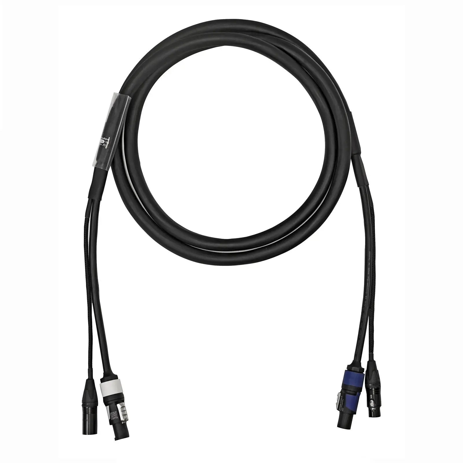 Hybrid multicore DMX signal plus power cables for linking lighting fixtures together in a convenient single outer jacket for speed of rigging while allowing the user to keep cable runs neat and tidy. These British manufactured cables are finished using nylon braided sleeving over the signal cable tail for maximum durability and terminated with Neutrik connectors. These are ultra flexible and designed for touring use providing a solution to the problem of integrated signal and power distribution. Constructed using carefully selected fillers to maintain the overall shape and facilitate easier coiling. Made in Britain Neutrik connectors 3-Pin XLR male plus powerCON FXXB male to 3-Pin XLR female plus powerCON FXXA female Nylon braided signal cable secured by adhesive lined heatshrink Analogue or AES digital audio RS422/485 or DMX512 control with a 3-core power cable H05VV-F harmonised standard 2.5mm² power core Clear heatshrink suitable for identification or asset label Suitable for most 110Ω balanced data applications such as RS422 RS485 DMX512 and timecode Oxygen-free copper cores for maximum signal integrity Length: 15m