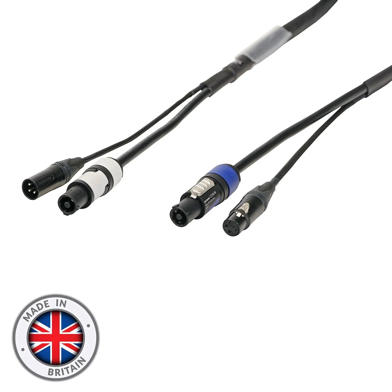 Hybrid multicore DMX signal plus power cables for linking lighting fixtures together in a convenient single outer jacket for speed of rigging while allowing the user to keep cable runs neat and tidy. These British manufactured cables are finished using nylon braided sleeving over the signal cable tail for maximum durability and terminated with Neutrik connectors. These are ultra-flexible and designed for touring use providing a solution to the problem of integrated signal and power distribution. Constructed using carefully selected fillers to maintain the overall shape and facilitate easier coiling. Made in Britain Neutrik connectors 3-Pin XLR male plus powerCON FXXB male to 3-Pin XLR female plus powerCON FXXA female Nylon braided signal cable secured by adhesive lined heatshrink Analogue or AES digital audio RS422/485 or DMX512 control with a 3 core power cable H05VV-F harmonised standard 1.5mm² power core Clear heatshrink suitable for identification or asset label Suitable for most 110Ω balanced data applications such as RS422 RS485 DMX512 and timecode Oxygen-free copper cores for maximum signal integrity Length: 1m
