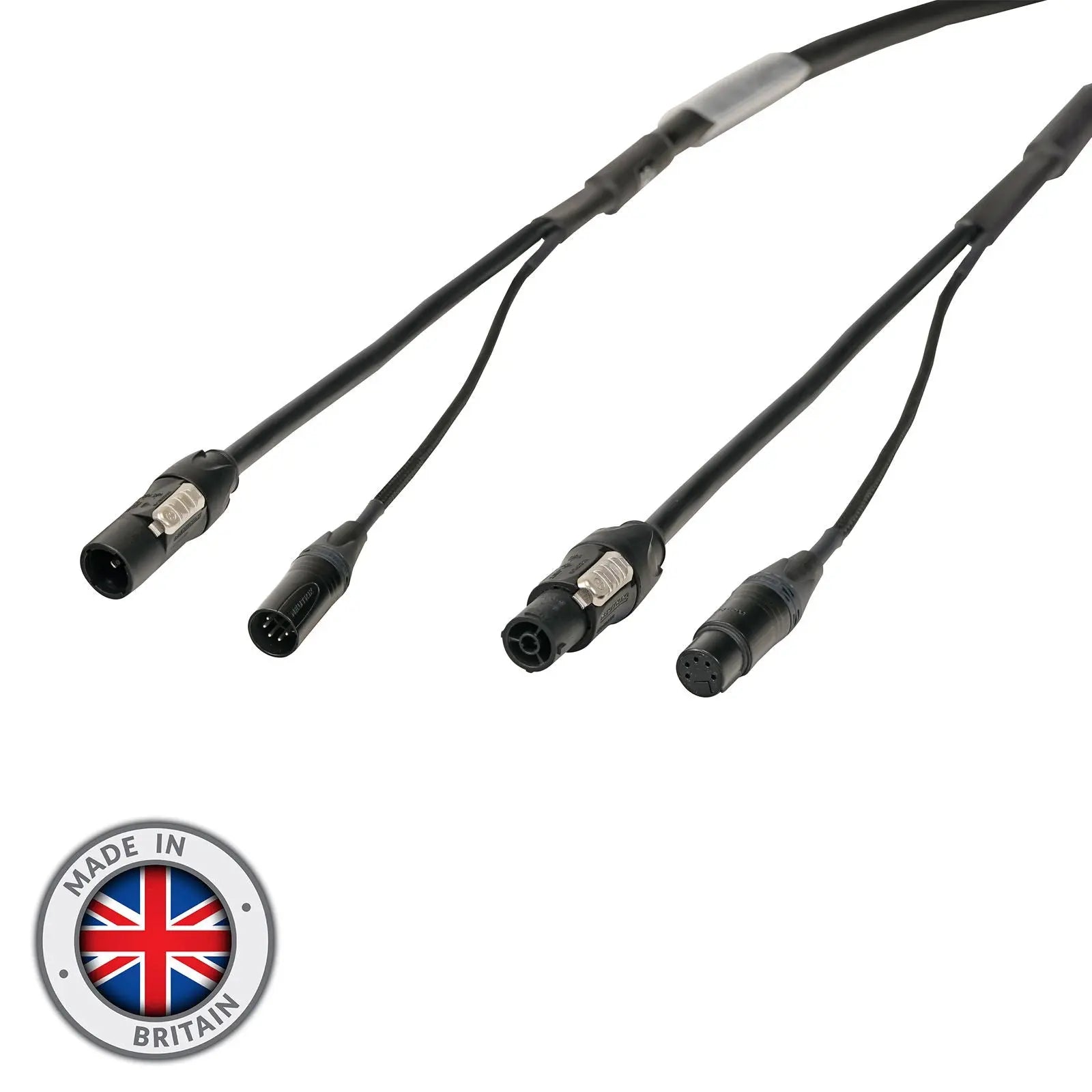 Hybrid multicore DMX signal plus power cables for linking lighting fixtures together in a convenient single outer jacket for speed of rigging while allowing the user to keep cable runs neat and tidy. These British manufactured cables are finished using nylon braided sleeving over the signal cable tail for maximum durability and terminated with Neutrik 5-Pin XLR and powerCON TRUE1-TOP connectors. Constructed using carefully selected fillers to maintain the overall shape and facilitate easier coiling these are ultra-flexible and designed for touring use providing a solution to the problem of integrated signal and power distribution. Made in Britain Neutrik connectors 5-Pin XLR male plus powerCON TRUE1-TOP male to 5-Pin XLR female plus powerCON TRUE1-TOP female Nylon braided signal cable secured by adhesive lined heatshrink Analogue or AES digital audio RS422/485 or DMX512 control with a 3 core power cable H05VV-F harmonised standard 1.5mm² power core Clear heatshrink suitable for identification or asset label Suitable for most 110Ω balanced data applications such as RS422 RS485 DMX512 and timecode Oxygen-free copper cores for maximum signal integrity Length: 1m