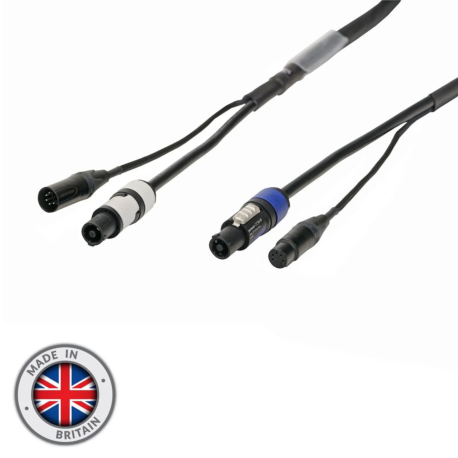 Hybrid multicore DMX signal plus power cables for linking lighting fixtures together in a convenient single outer jacket for speed of rigging while allowing the user to keep cable runs neat and tidy. These British manufactured cables are finished using nylon braided sleeving over the signal cable tail for maximum durability and terminated with Neutrik connectors. These are ultra flexible and designed for touring use providing a solution to the problem of integrated signal and power distribution. Constructed using carefully selected fillers to maintain the overall shape and facilitate easier coiling. Made in Britain Neutrik connectors 5-Pin XLR male plus powerCON FXXB male to 5-Pin XLR female plus powerCON FXXA female Nylon braided signal cable secured by adhesive lined heatshrink Analogue or AES digital audio RS422/485 or DMX512 control with a 3-core power cable H05VV-F harmonised standard 2.5mm² power core Clear heatshrink suitable for identification or asset label Suitable for most 110Ω balanced data applications such as RS422 RS485 DMX512 and timecode Oxygen-free copper cores for maximum signal integrity Length: 20m