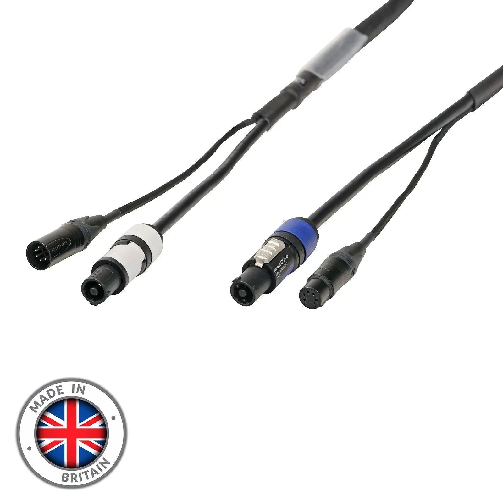 Hybrid multicore DMX signal plus power cables for linking lighting fixtures together in a convenient single outer jacket for speed of rigging while allowing the user to keep cable runs neat and tidy. These British manufactured cables are finished using nylon braided sleeving over the signal cable tail for maximum durability and terminated with Neutrik connectors. These are ultra-flexible and designed for touring use providing a solution to the problem of integrated signal and power distribution. Constructed using carefully selected fillers to maintain the overall shape and facilitate easier coiling. Made in Britain Neutrik connectors 5-Pin XLR male plus powerCON FXXB male to 5-Pin XLR female plus powerCON FXXA female Nylon braided signal cable secured by adhesive lined heatshrink Analogue or AES digital audio RS422/485 or DMX512 control with a 3 core power cable H05VV-F harmonised standard 1.5mm² power core Clear heatshrink suitable for identification or asset label Suitable for most 110Ω balanced data applications such as RS422 RS485 DMX512 and timecode Oxygen-free copper cores for maximum signal integrity Length: 2m