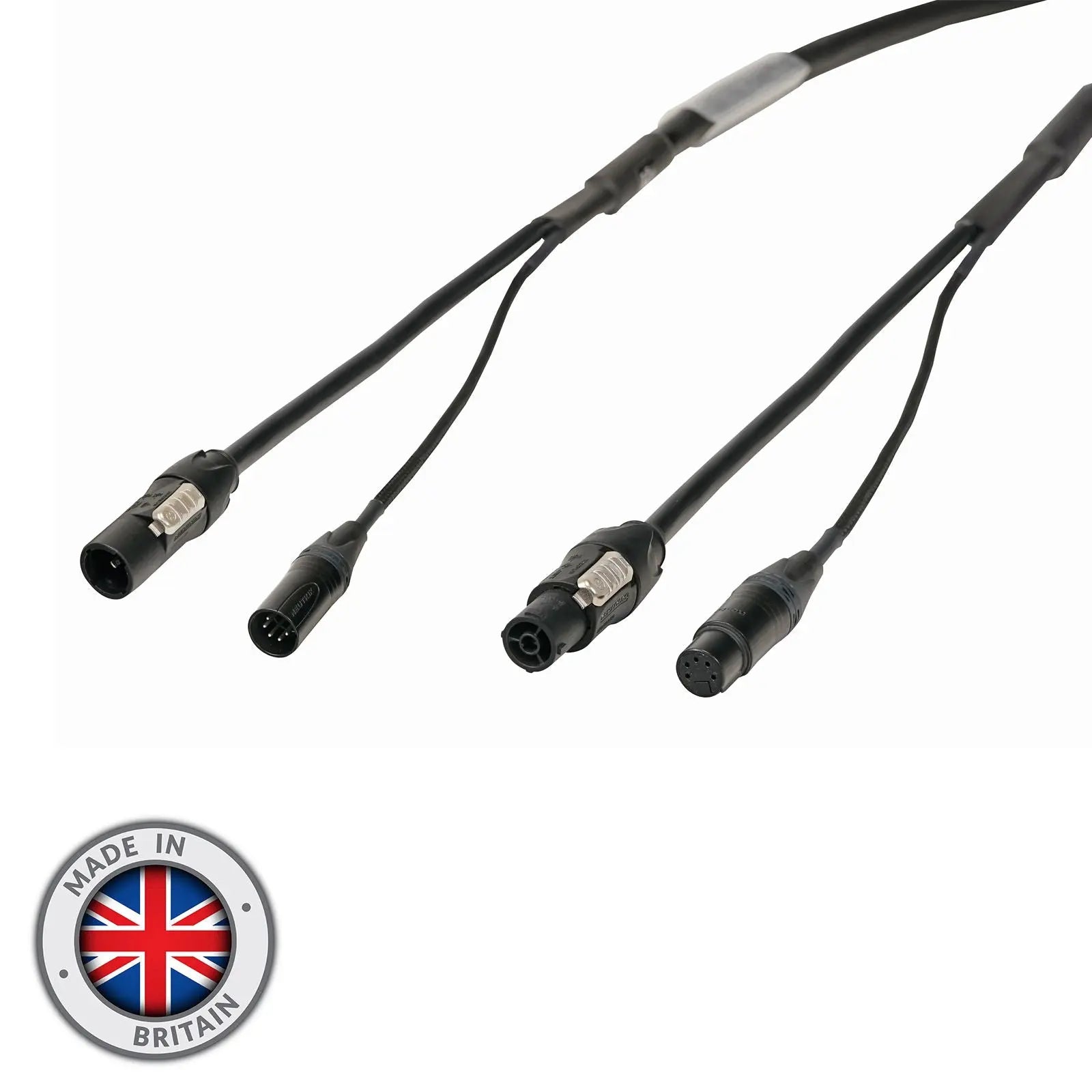 Hybrid multicore DMX signal plus power cables for linking lighting fixtures together in a convenient single outer jacket for speed of rigging while allowing the user to keep cable runs neat and tidy. These British manufactured cables are finished using nylon braided sleeving over the signal cable tail for maximum durability and terminated with Neutrik 5-Pin XLR and powerCON TRUE1-TOP connectors. Constructed using carefully selected fillers to maintain the overall shape and facilitate easier coiling these are ultra-flexible and designed for touring use providing a solution to the problem of integrated signal and power distribution. Made in Britain Neutrik connectors 5-Pin XLR male plus powerCON TRUE1-TOP male to 5-Pin XLR female plus powerCON TRUE1-TOP female Nylon braided signal cable secured by adhesive lined heatshrink Analogue or AES digital audio RS422/485 or DMX512 control with a 3 core power cable H05VV-F harmonised standard 2.5mm² power core Clear heatshrink suitable for identification or asset label Suitable for most 110Ω balanced data applications such as RS422 RS485 DMX512 and timecode Oxygen-free copper cores for maximum signal integrity Length: 2m