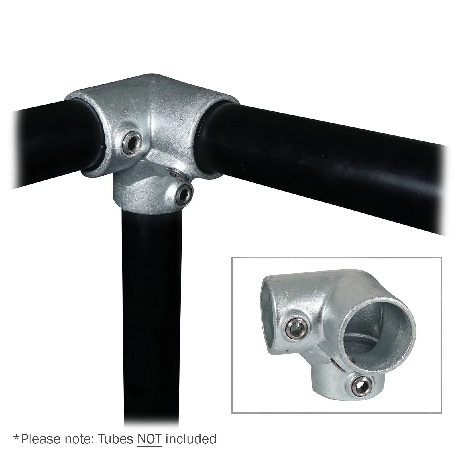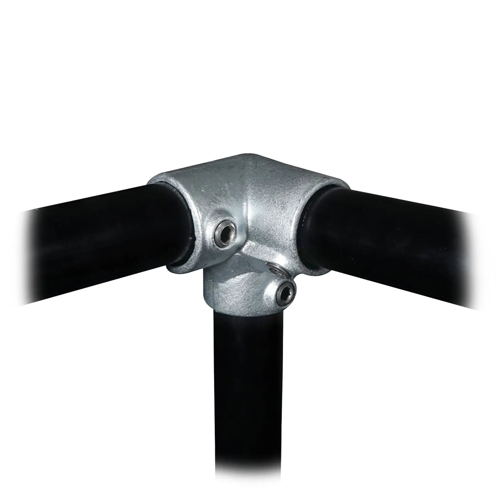 Elumen8 CLAM210 3 Way 90 Degree Elbow Key Clamp (128-HDG). Key clamps are designed to secure and connect 48.3mmØ tubes quickly and easily. The wide range of options available enables users to create a huge variety of configurations including lighting grids studio frames staging and exhibitions stands. The 3 way 90° elbow key clamp is a 3 way corner joint providing a 90° angle to a top rail whilst connecting the post of a handrail. It is also used to create a smooth corner for other rail constructions. Malleable cast iron construction with hot dip galvanised finish Designed to fit 48.3mmØ tubes Simply secured via an Allen key (not included) Please note: Not suitable for use in the construction of scaffolding frameworks Grub screws included