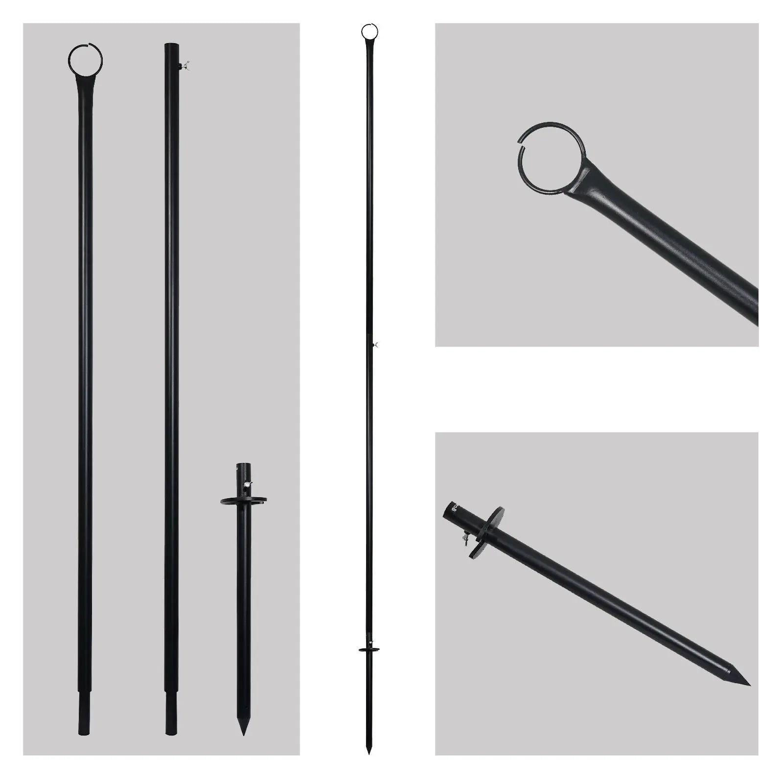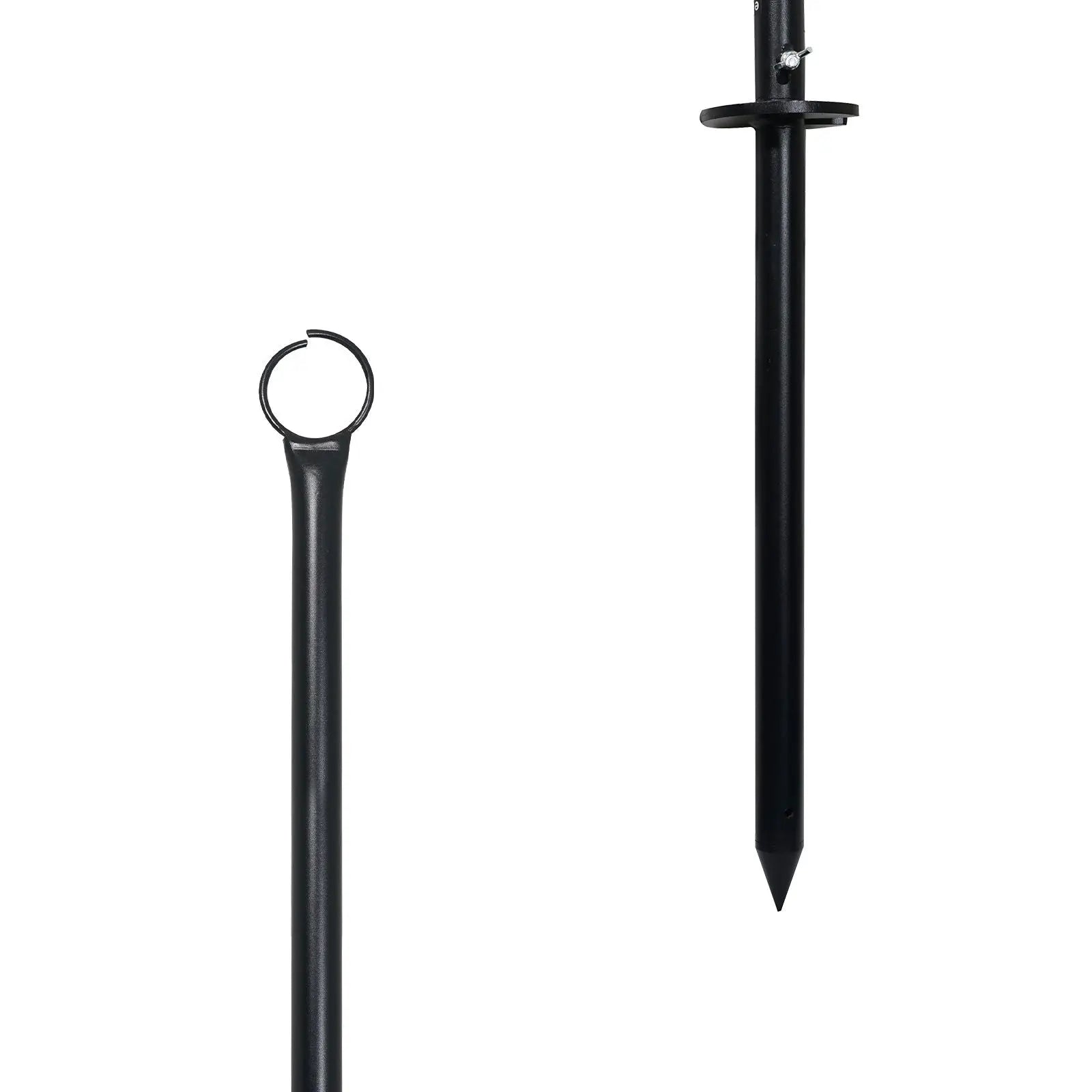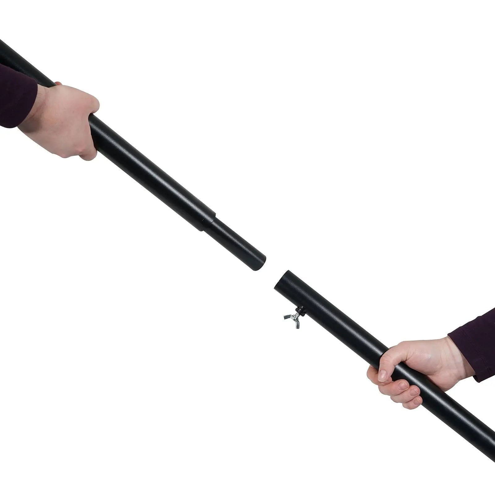 This heavy duty black steel festoon pole has a superior 3mm wall thickness providing a sturdy reliable solution to suspending festoon strings. Suitable for creating illuminated pathways and walkways for outdoor events and weddings this durable 3.6m pole (3m finished height) is constructed in 3 sections for ease of transportation. To assemble the pole drive the ground spike into the ground using the festoon pole hammer cap (available separately) and then slot the upper two sections into position. Wing bolts are provided to secure the sections in place and prevent any movement when in use. The ground spike features a solid pointed tip allowing it to be driven into firm ground. 81mmØ bull horn top ring for festoon mounting 3m finished height (3.6m overall) 3 piece design for ease of transportation 35mm pole diameter 3mm superior wall thickness M8 wing nuts prevent movement during use Ground spike features a solid pointed tip for durability 110mm diameter 8mm thick footplate for easier insertion into the ground Steel construction with black powder coat finish