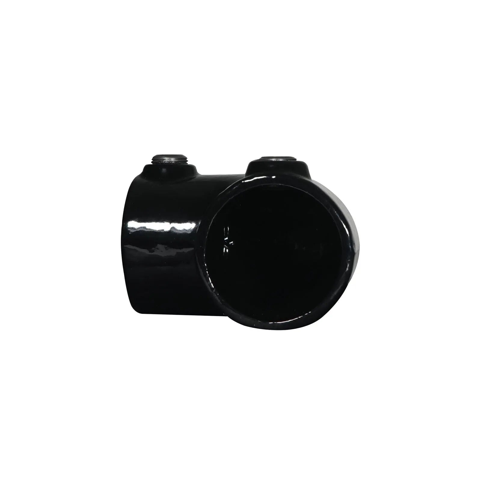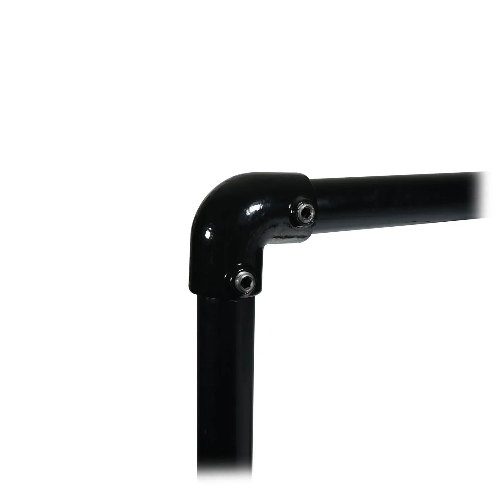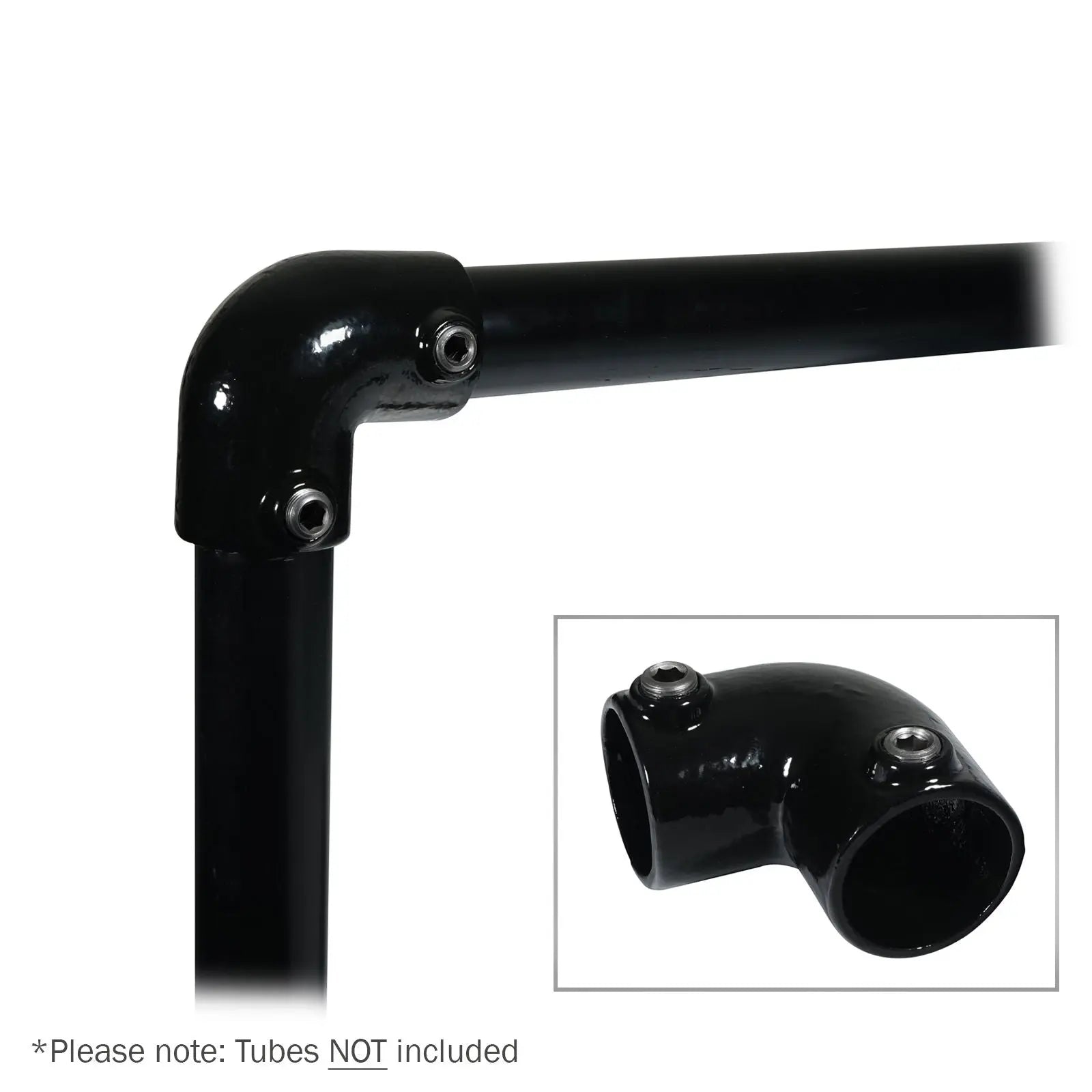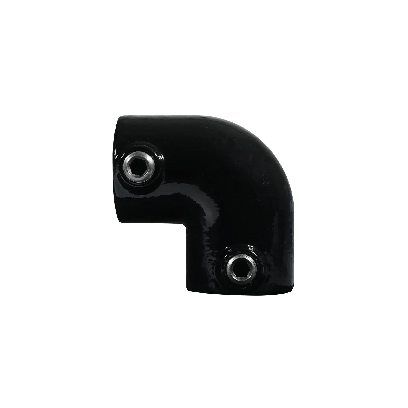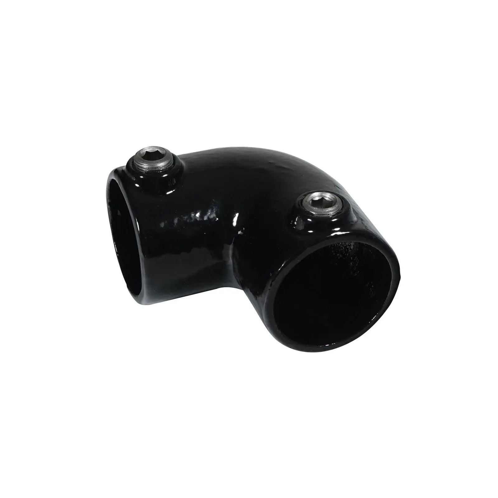 Elumen8 CLAM253 90 Degree Elbow Black Key Clamp (125-BPC). Key clamps are designed to secure and connect 48.3mmØ tubes quickly and easily. The wide range of options available enables users to create a huge variety of configurations including lighting grids studio frames staging and exhibitions stands. The 90° elbow key clamp is commonly used for the termination of a top rail to the last post of a handrail or for creating a smooth corner for other rail constructions. Malleable cast iron construction hot dip galvanised with black powder coated finish Designed to fit 48.3mmØ tubes Simply secured via an Allen key (not included) Please note: Not suitable for use in the construction of scaffolding frameworks Grub screws included