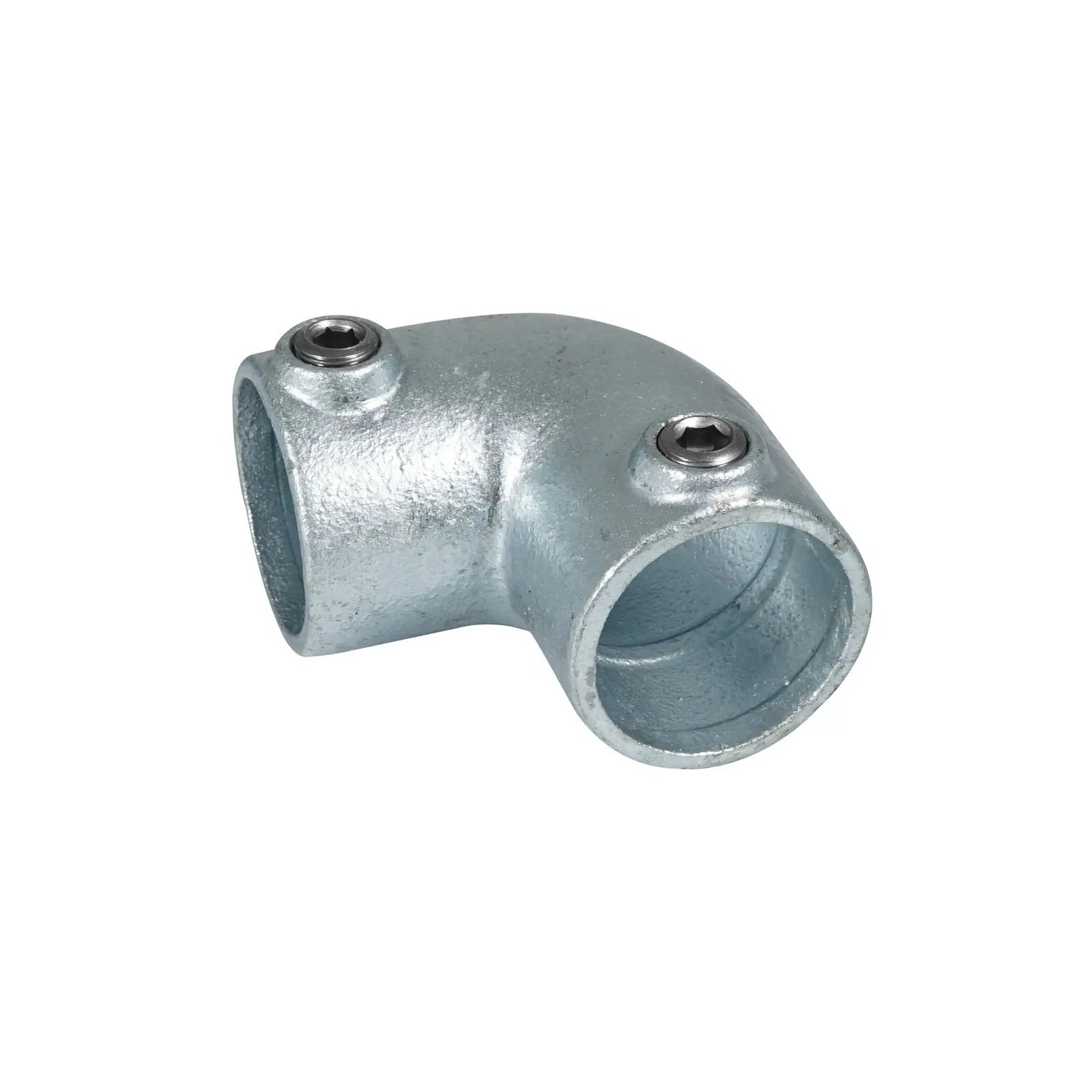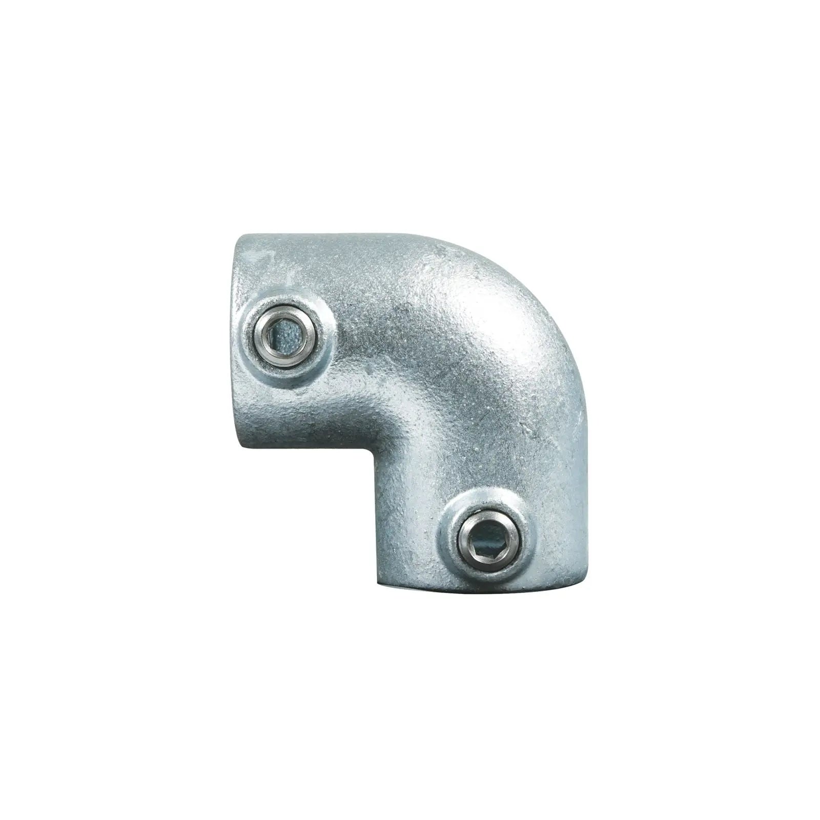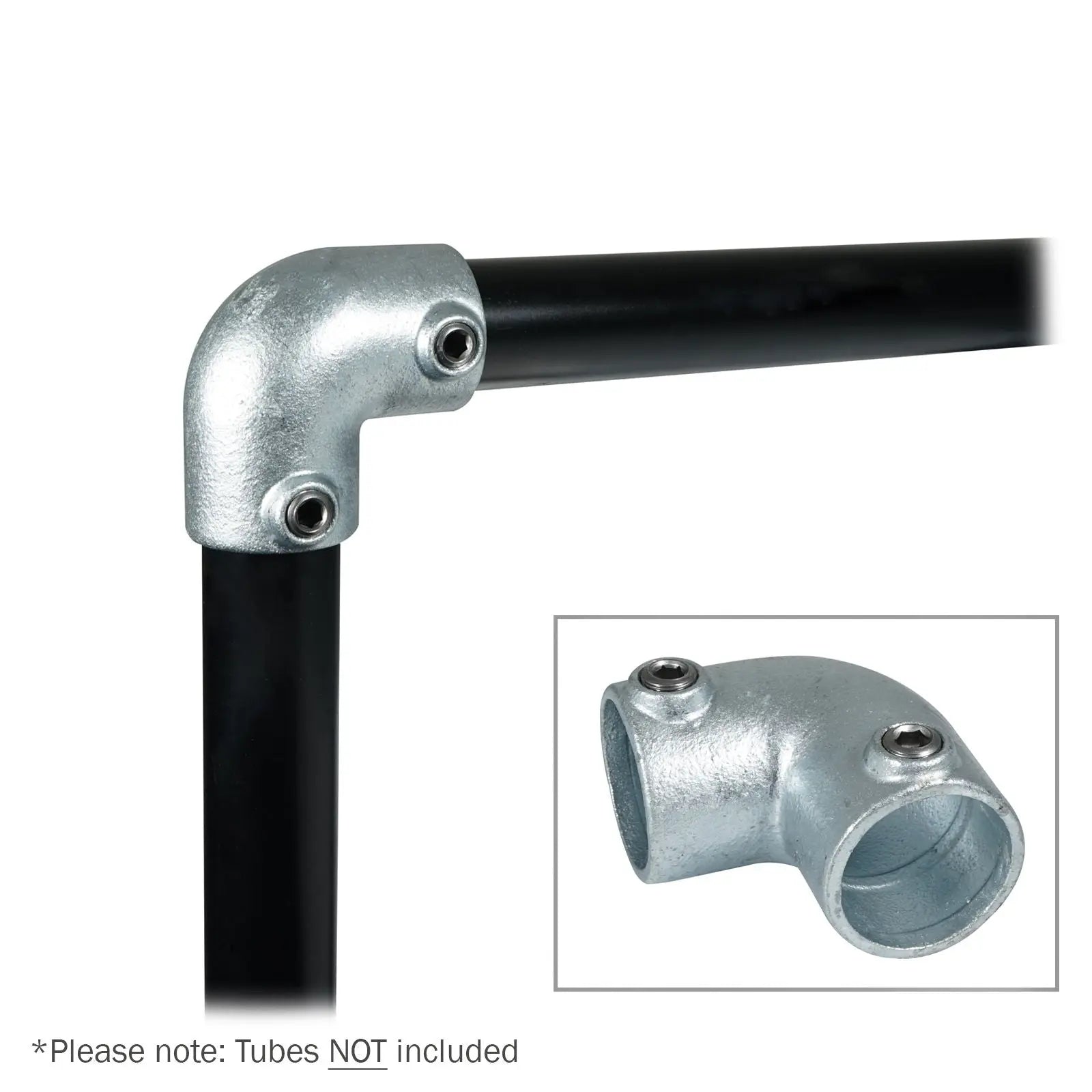 Elumen8 CLAM203 90 Degree Elbow Key Clamp (125-HDG). Key clamps are designed to secure and connect 48.3mmØ tubes quickly and easily. The wide range of options available enables users to create a huge variety of configurations including lighting grids studio frames staging and exhibitions stands. The 90° elbow key clamp is commonly used for the termination of a top rail to the last post of a handrail or for creating a smooth corner for other rail constructions. Malleable cast iron construction with hot dip galvanised finish Designed to fit 48.3mmØ tubes Simply secured via an Allen key (not included) Please note: Not suitable for use in the construction of scaffolding frameworks Grub screws included