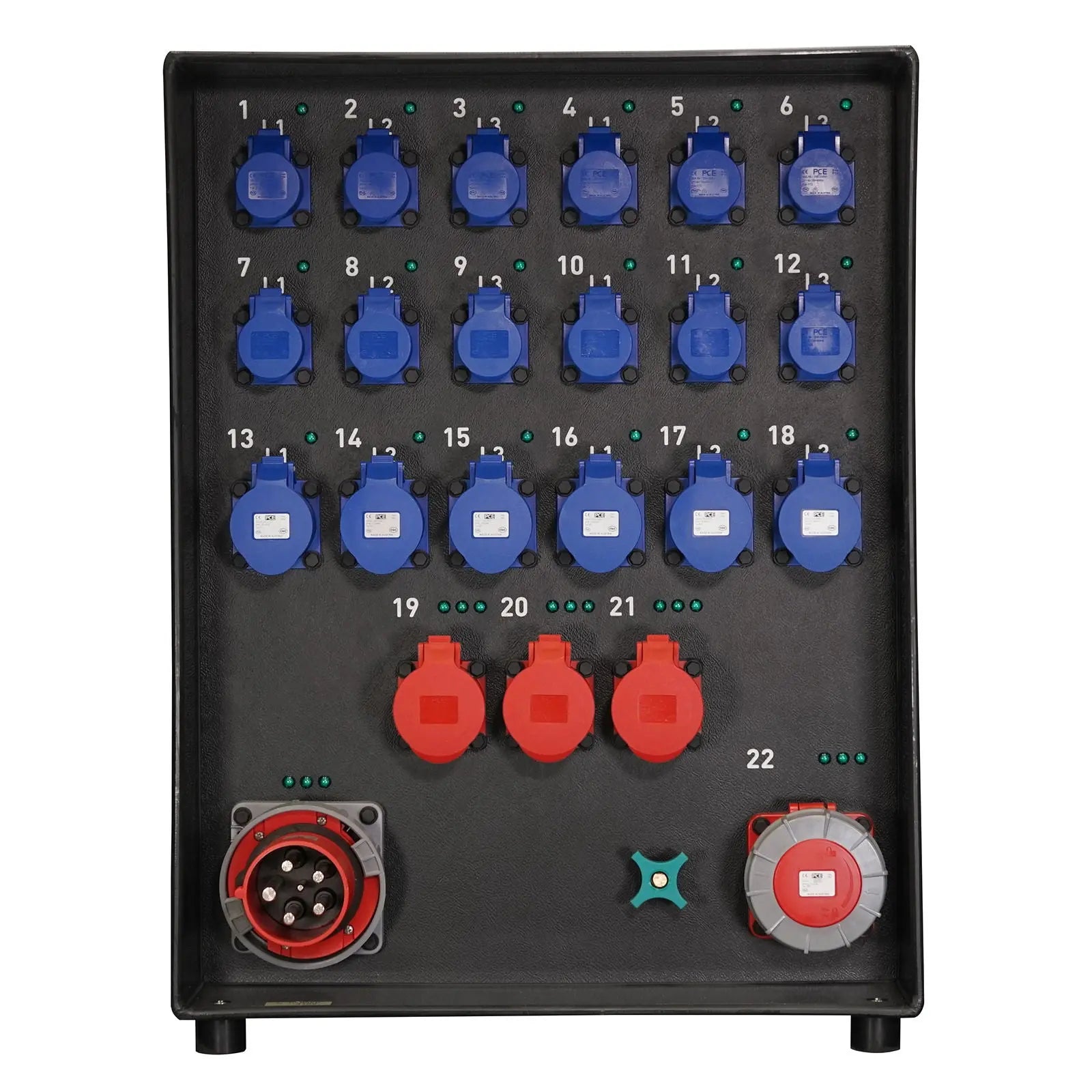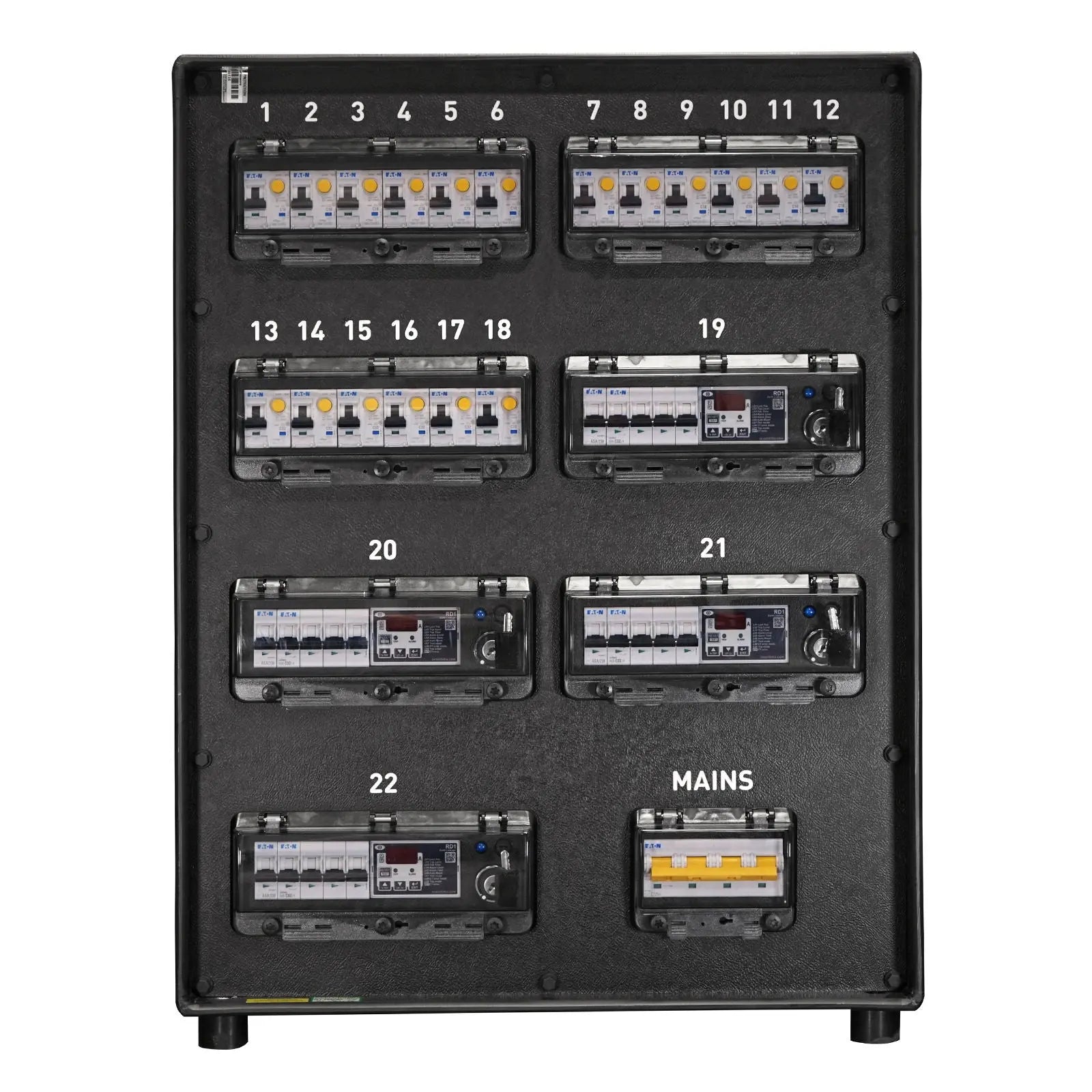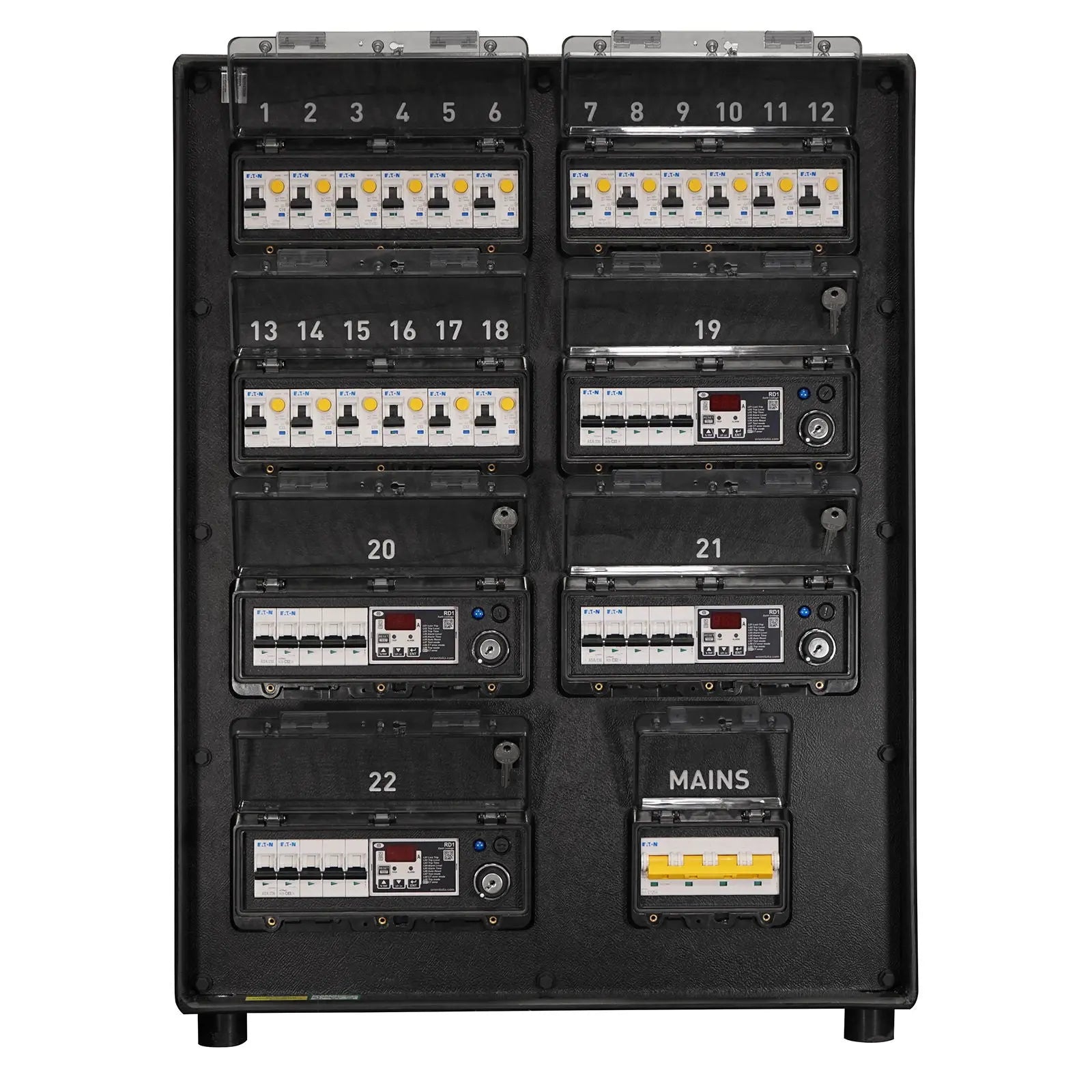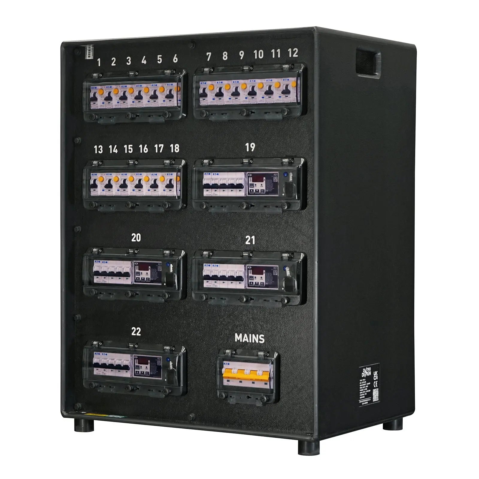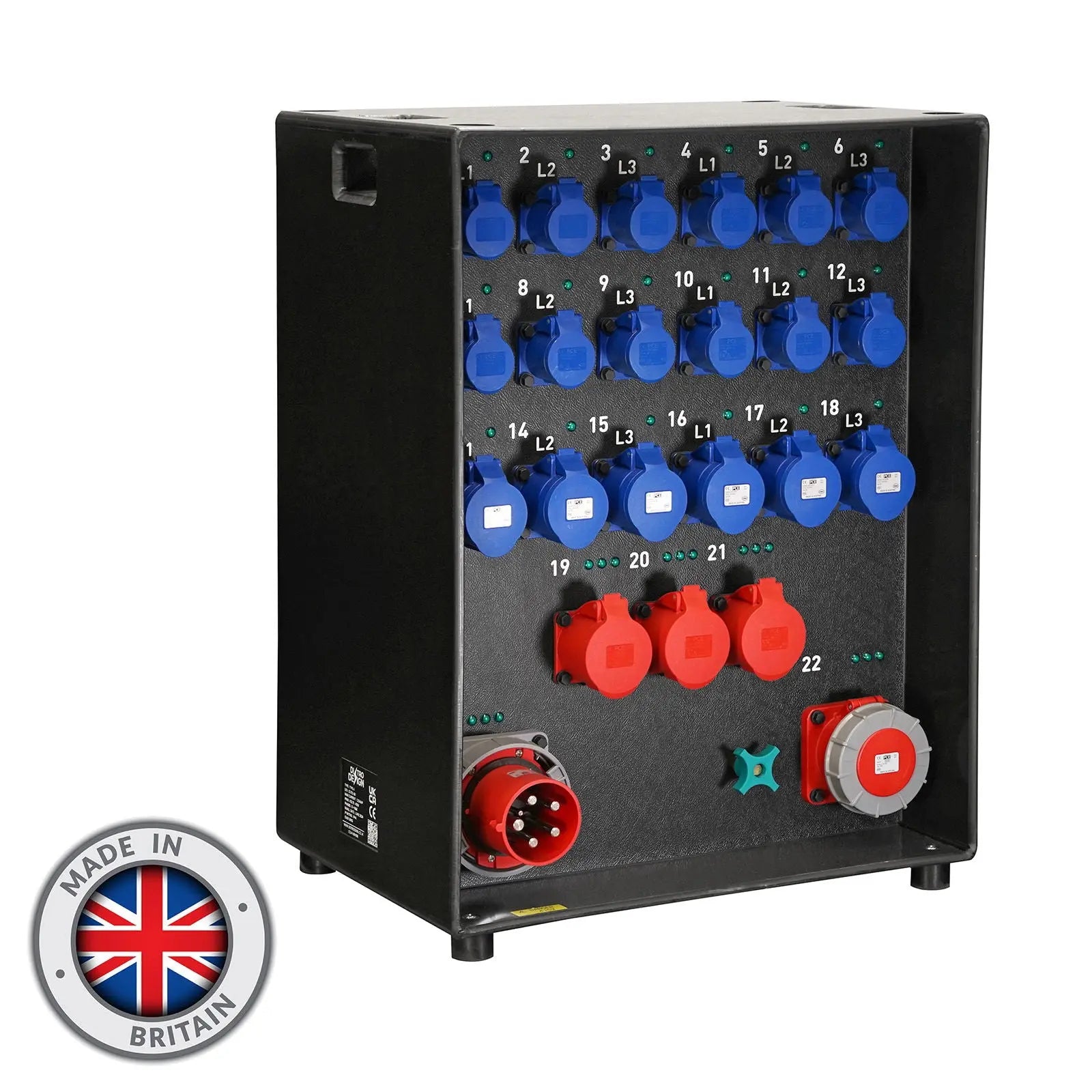 Manufactured within a rugged HDPE chassis this 125A distribution unit is designed for use on large events and concerts. Made in Britain 125A three phase input with link output Earth stud Input: 125A type 4 distro in 125A 3PH appliance inlet with neon indicators protected by an overall 125A 4-Pole MCB Outputs:1 x 63A 3PH panel socket with neon indicators protected by:1 x 63A 4-Pole MCB Digital variable switchable RCD 3 x 32A 3PH panel sockets with neon indicators protected by:3 x 32A 4-Pole MCB Digital variable switchable RCD 6 x 32A 1PH panel sockets with neon indicators protected by:6 x 32A 2-Pole 30mA RCBO’s 12 x 16A 1PH panel sockets with neon indicators protected by:12 x 16A 2-Pole 30mA RCBO’s