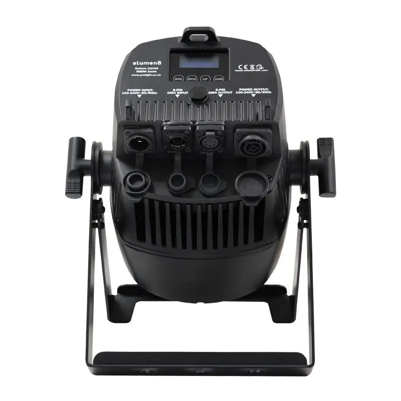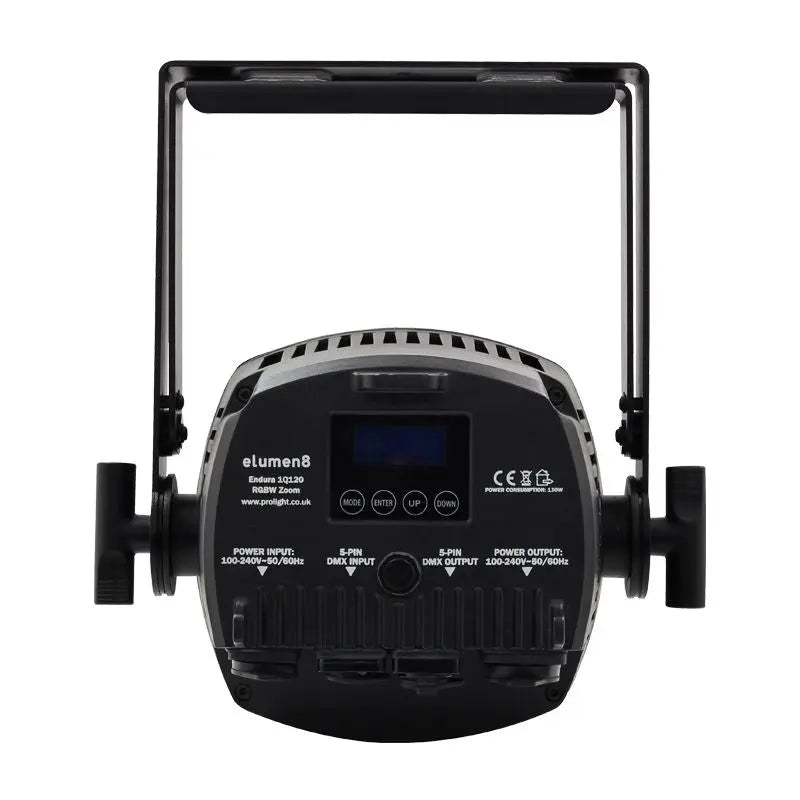 The Endura series are heavy-duty rental ready IP rated pars made for the most demanding of applications. With flicker-free operation thanks to a 3600Hz refresh rate and a multitude of colour and output options the series is perfectly suited for use in concert TV and outdoor applications. The fixture can be controlled via DMX accessible via a 4 button backlit display with menu lock to prevent unauthorised setting changes providing a variety of colour macro change fade and strobe functions with 4 selectable dimmer curves. The added motorised zoom feature allows the user to adjust the beam angle from 13° to 38°. The robust IP65 rated housing features TRUE1 and 5-Pin DMX inputs and outputs to facilitate a problem-free connection. 2 year warranty 1 x 120W quad-colour COB LED (RGBW) Adjustable beam angle: 13°-38° 13° - 7731 Lux @ 2m (full on) 38° - 5739 Lux @ 2m (full on) Refresh rate: 3.6kHz DMX channels: 2/5/9 or 10 selectable RDM (Remote Device Management) Static colour colour change colour fade and master/slave modes 0 - 100% 8 or 16 bit dimming Variable strobe Bracket allows for multiple rigging or floor standing applications Quick release omega clamp included 4 button backlit menu with LCD display powerCON TRUE1 compatible Seetronic input/output IP rated 5-Pin XLR input/output Temperature controlled fan for whisper quiet operation 50mm removable snoot included