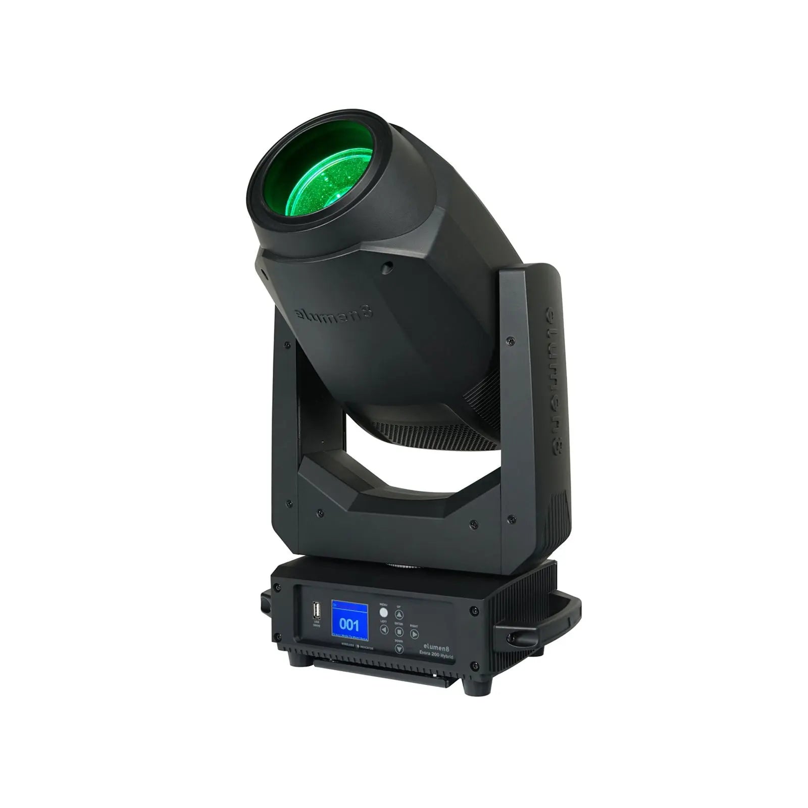 The Evora 200 Hybrid is a feature packed 3-in-1 moving head boasting a comprehensive list of features all contained in a compact housing. The 200W LED paired with an adjustable zoom from 3° to 34° allows super tight beams and wide spots to be achieved. The 200 Hybrid offers both static and rotating gobo wheels 2 rotating prisms a variable frost filter 11 colours and motorised focus. Suited to rental stage and touring the fixture is equipped with TRUE1 connections and has battery backup for offline configuration. Control is via DMX RDM Kling-Net Art-NET and sACN protocols and for further convenience wireless DMX is onboard via W-DMX Sweden. 2 year warranty 1 x 200W white LED (11000K) Adjustable beam angle: 3°- 34° Lumens - Source: 10500 Lumens – Output: 5171 3° - 131459 Lux @ 2m 34° - 7742 Lux @ 2m Refresh rate: 14 selectable presets between 900Hz-25kHz Motorised zoom and focus 8 facet circular rotating indexable prism plus 5 facet linear rotating indexable prism Frost filter CRI: 70 Gobo wheel 1: 8 rotating indexable replaceable gobos + open Gobo wheel 2: 14 static gobos + open Colour wheel: 11 colours + open Control protocols: DMX Kling-net Art-net and sACN DMX channels: 17/21 or 24 selectable Wireless control (W-DMX Sweden transceiver) RDM (Remote Device Management Auto manual control and master/slave modes Pan/tilt auto correction 16-Bit pan/tilt positioning Pan: 540° or 630° selectable Tilt: 270° 0-100% dimming 5 dimming modes: Standard stage TV architectural and theatre Variable strobe Quick release omega clamps included 6 button menu with 1.8” LCD display Display battery backup for offline configuration USB port (firmware updates) powerCON TRUE1 input/output 5-Pin XLR input/output etherCON input/output Temperature controlled fans