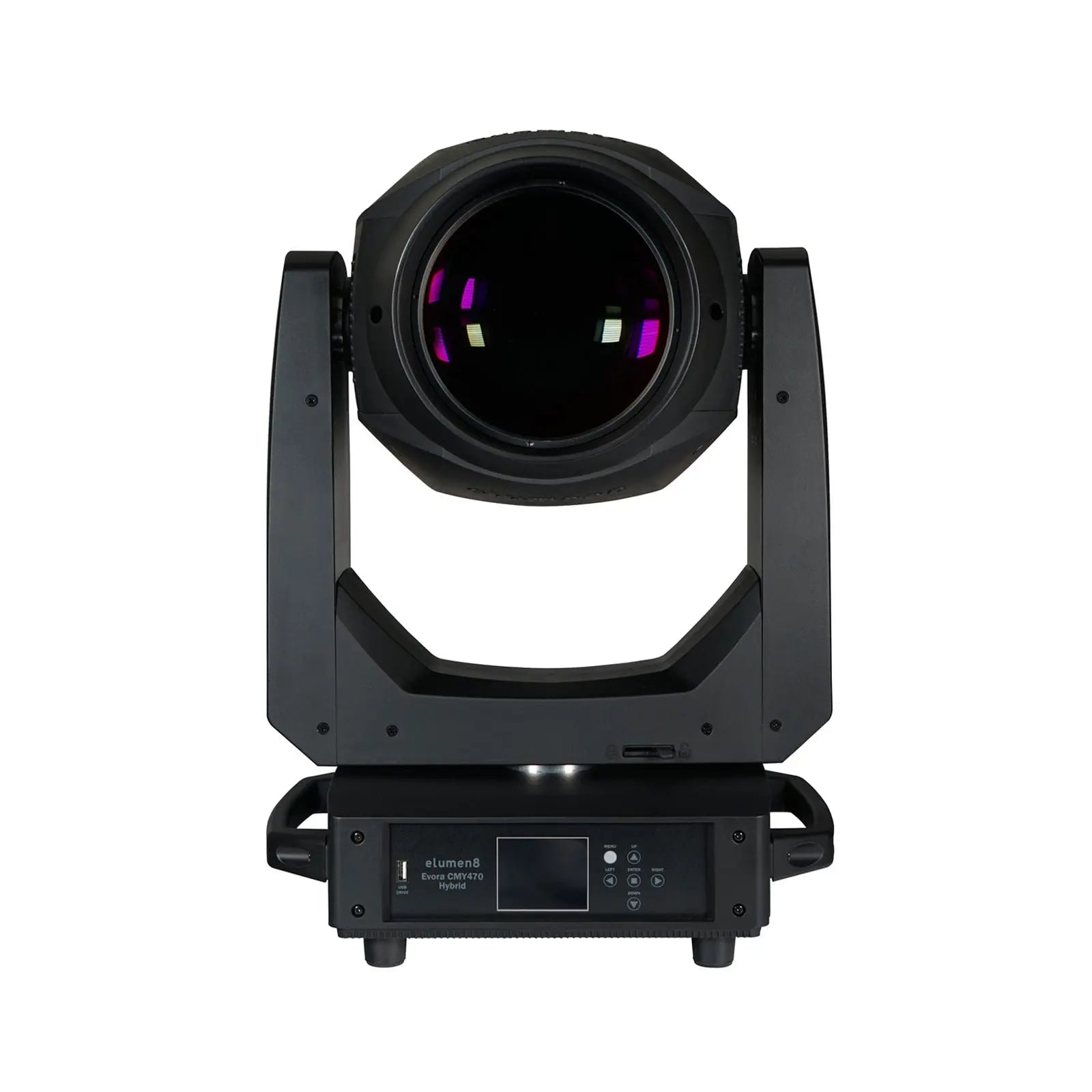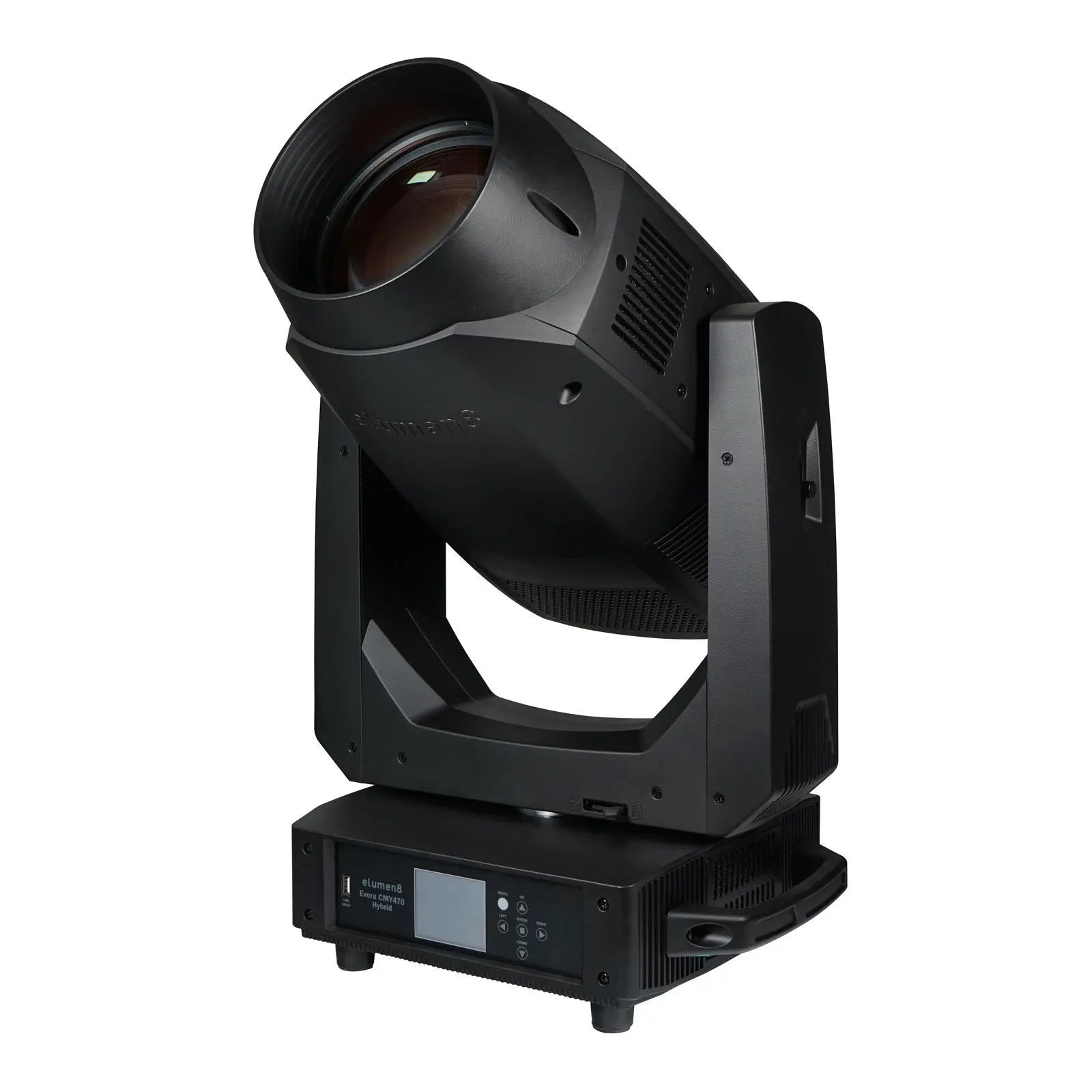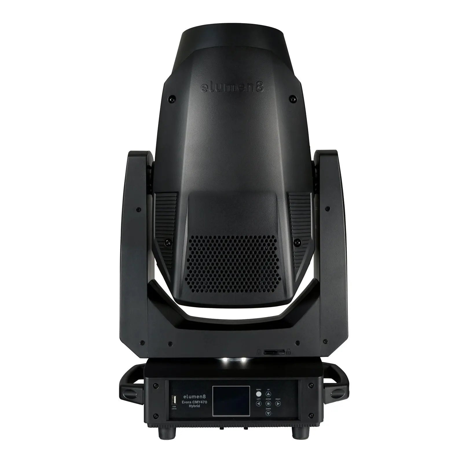The Evora CMY470 Hybrid is a feature packed 3-in-1 moving head boasting an intense Osram® SIRIUS HRI 471W discharge lamp. Crystal clear optics paired with an adjustable zoom from 1.8° to 46° allows super tight beams and wide washes to be achieved. The CMY470 offers both static and rotating gobo wheels 8 rotating prisms 2 variable frost filters animation wheel and motorised focus. Endless colours can be achieved with CMY colour mixing along with its colour wheel and CTO filter. Suited to rental stage and touring the fixture is equipped with TRUE1 connections and has battery backup for offline configuration. Control is via DMX RDM Kling-Net Art-NET and sACN protocols and for further convenience wireless DMX is on-board via W-DMX Sweden. 2 year warranty 1 x Osram® SIRIUS HRI 471W SN discharge lamp (7500K) Adjustable beam angle: 1.8° - 46° Lumens – Source: 23900 Lumens – Output: 12699 Beam mode: 1.8° - 431000 Lux @ 10m 21° - 3620 Lux @ 10m Spot mode: 3° - 180000 Lux @ 10m 42° - 840 Lux @ 10m Wash mode: 7° - 12000 Lux @ 10m 46° - 608 Lux @ 10m Motorised zoom and focus 8 rotating indexable prisms situated across 2 wheels Wheel 1: dynamic effects prism 6 facet circular prism 5 facet linear prism and 4 facet circular prism Wheel 2: 6 facet linear prism 8 facet circular prism 16 facet circular prism and 24 facet circular prism Frost 1: Medium variable frost filter (0-100%) Frost 2: Heavy variable frost filter (0-100%) CRI: 80 High CRI filter (CRI: 90) Gobo wheel 1: 9 rotating indexable replaceable gobos + open Gobo wheel 2: 13 static gobos + open Animation wheel CMY colour mixing: Cyan 0-100% Magenta 0-100% and Yellow 0-100% Colour wheel: 12 colours + CTO filter + open Control protocols: DMX Kling-net Art-net and sACN DMX channels: 35 Wireless control (W-DMX Sweden transceiver) Manual control and master/slave modes plus built-in programs RDM (Remote Device Management) Pan/tilt transit lock and auto correction 16-Bit pan/tilt positioning Pan: 540° or 630° selectable Tilt: 270° 0 – 100% dimming Variable strobe Supplied with quick release omega clamps 6 button menu with 2.7” LCD touch screen display Display battery backup for offline configuration USB port (firmware updates) powerCON TRUE1 input/output 5-Pin XLR input/output etherCON input/output Temperature controlled fans