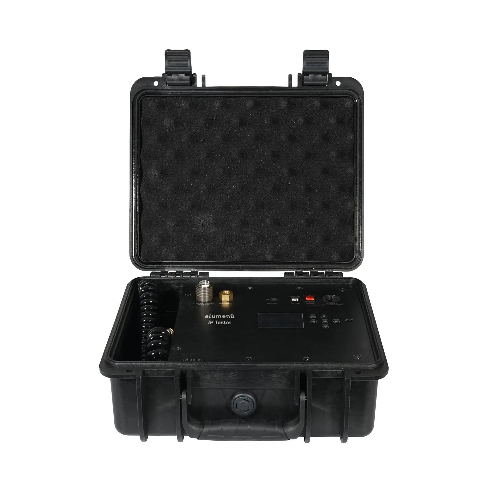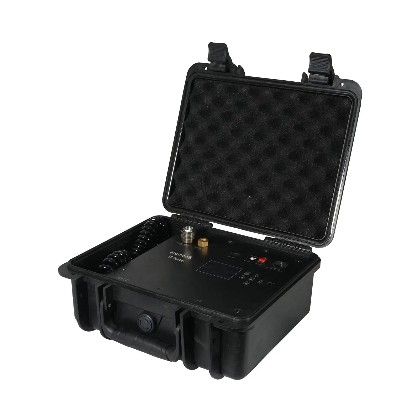 The Elumen8 IP Tester is a portable service tool allowing users to test the integrity of any compatible IP rated lighting fixture after being opened for lamp/gobo replacement and service. This IP tester has been designed to check for both vacuum and pressure leaks. The tester features a simple-to-use 6 button LCD menu with testing progress bar. Serial numbers can also be inputted to keep track of tested fixtures. A Micro SD card slot allows for storage of test reports plus a USB connection for PC software control. Portable IP vacuum and pressure tester Preloaded Elumen8/LEDJ IP rated fixture test presets Manual and auto testing modes 6 button menu with 3" LCD display Fixture serial number input for tracking test results Micro SD Card to store test results USB connection for PC software control (Windows) Supplied in rugged ABS case Includes: 0.9-1.5m coiled air hose with quick-connect fitting threaded M12 brass nozzle with push-to-connect fitting and 1.5m PowerTwist TR1 cable