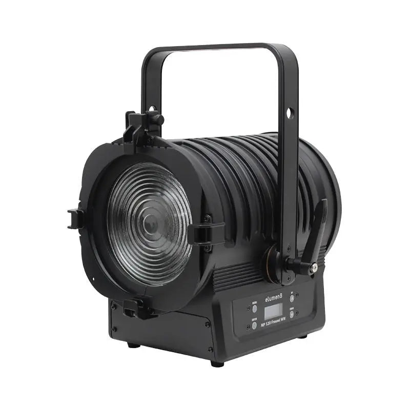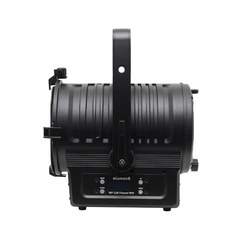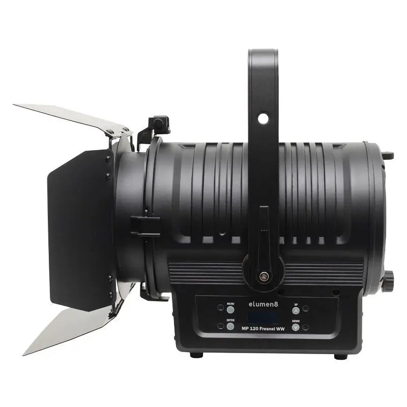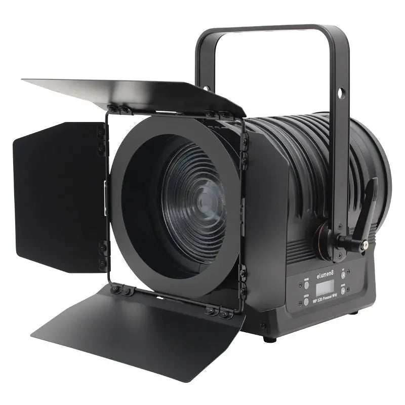 The MP 120 Fresnel lighting fixtures come equipped with a 20cm Fresnel lens and are powered with a 120W 3000K COB LED. Producing a soft edged beam the units not only have a manually adjustable beam angle 19°- 37° they also come supplied with barn doors to further control the beam making them ideal for stage and theatrical lighting applications. These fresnels provide a superb light output and benefit from temperature controlled fan cooling for whisper quiet operation. The 4 button display allows users to select DMX and manual dimming modes along with dimming curves whilst the powerCON and DMX inputs/outputs allow multiple units to be daisy chained in an array further enhancing their flexibility. 2 year warranty 1 x 120W warm white COB LED (3000K) Manually adjustable beam angle: 19°- 37° 19° - 14800 Lux @ 2m 37° - 3349 Lux @ 2m CRI: 95 Refresh rate: 1.5kHz DMX channels: 1/3 or 5 selectable RDM (Remote Device Management) 0 - 100% 8 or 16 bit dimming Variable strobe 4 dimming curves in both LED and halogen profiles: Linear square law inverse square law and S-curve 4 button menu with LCD display powerCON input/output 5-Pin XLR input/output 3-Pin XLR input/output Temperature controlled fan Filter frame and barn doors included