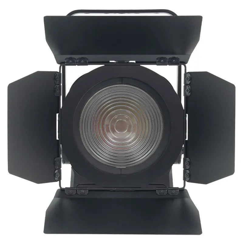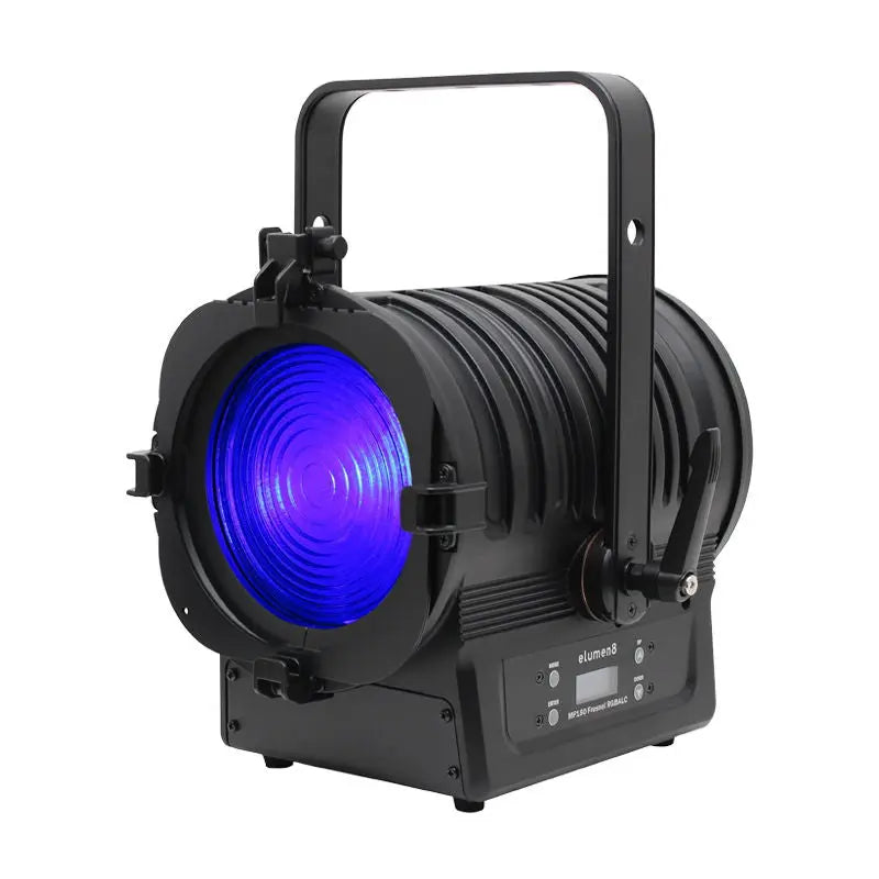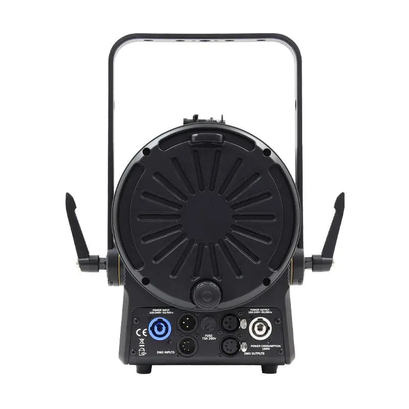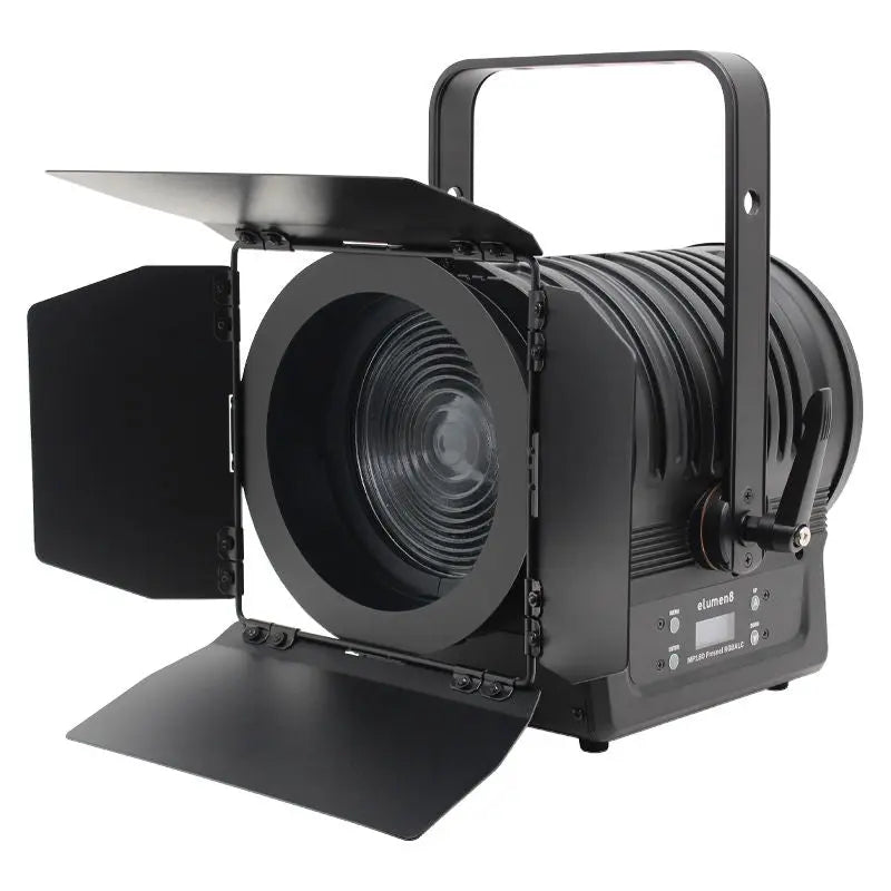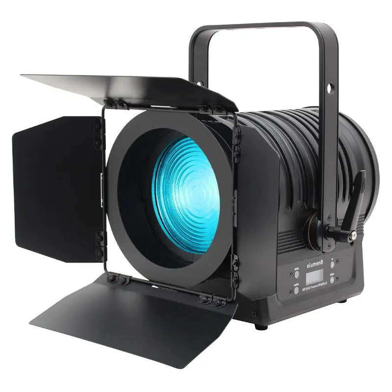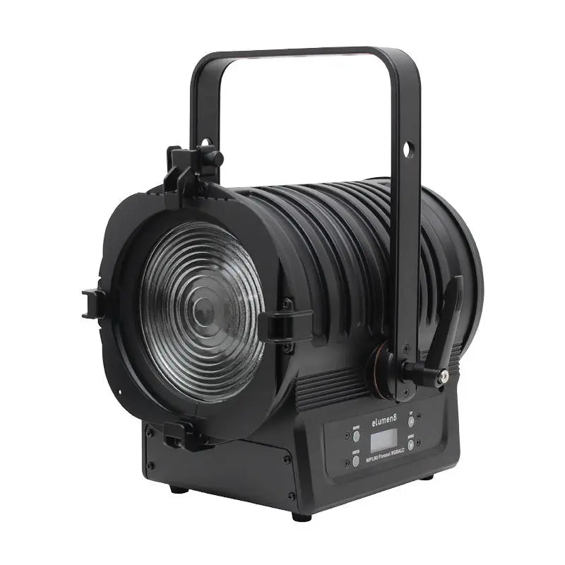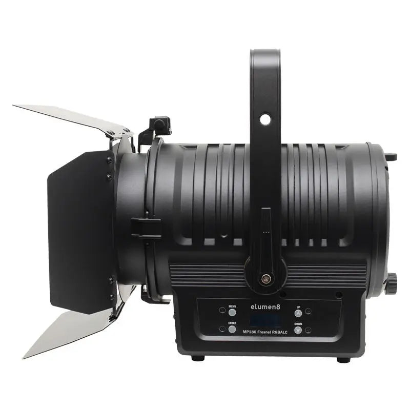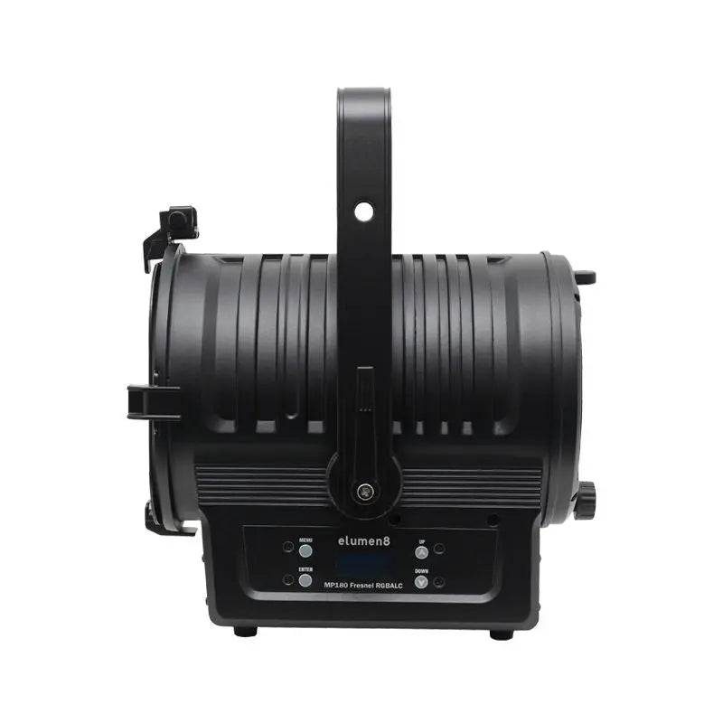 The MP180 is a full colour RGBALC fresnel style fixture that is perfect for short throw applications including studios and theatres. High quality dimming allows for smooth fades and a zoom with adjustable 13°– 46° beam angle places an even field of light wherever needed. The addition of amber lime and cyan within the LED source make the perfect colour on any scene or subject. This fixture provides a superb light output and benefits from a temperature controlled fan. The 4 button display allows users to select DMX and manual dimming modes along with dimming curves. 2 year warranty 1 x 180W six-colour COB LED (RGBALC) Manually adjustable beam angle: 13°- 46° 13° - 6849 Lux @ 2m 46° - 2141 Lux @ 2m CRI: >90 Refresh rate: 17kHz DMX channels: 1/5/6 or 16 selectable RDM (Remote Device Management) 0 - 100% 8 or 16 bit dimming Variable strobe 4 dimming curves in both LED and halogen profiles: Linear square law inverse square law and S-curve 4 button menu with LCD display powerCON input/output 5-Pin XLR input/output 3-Pin XLR input/out Temperature controlled fan Filter frame and barn doors included