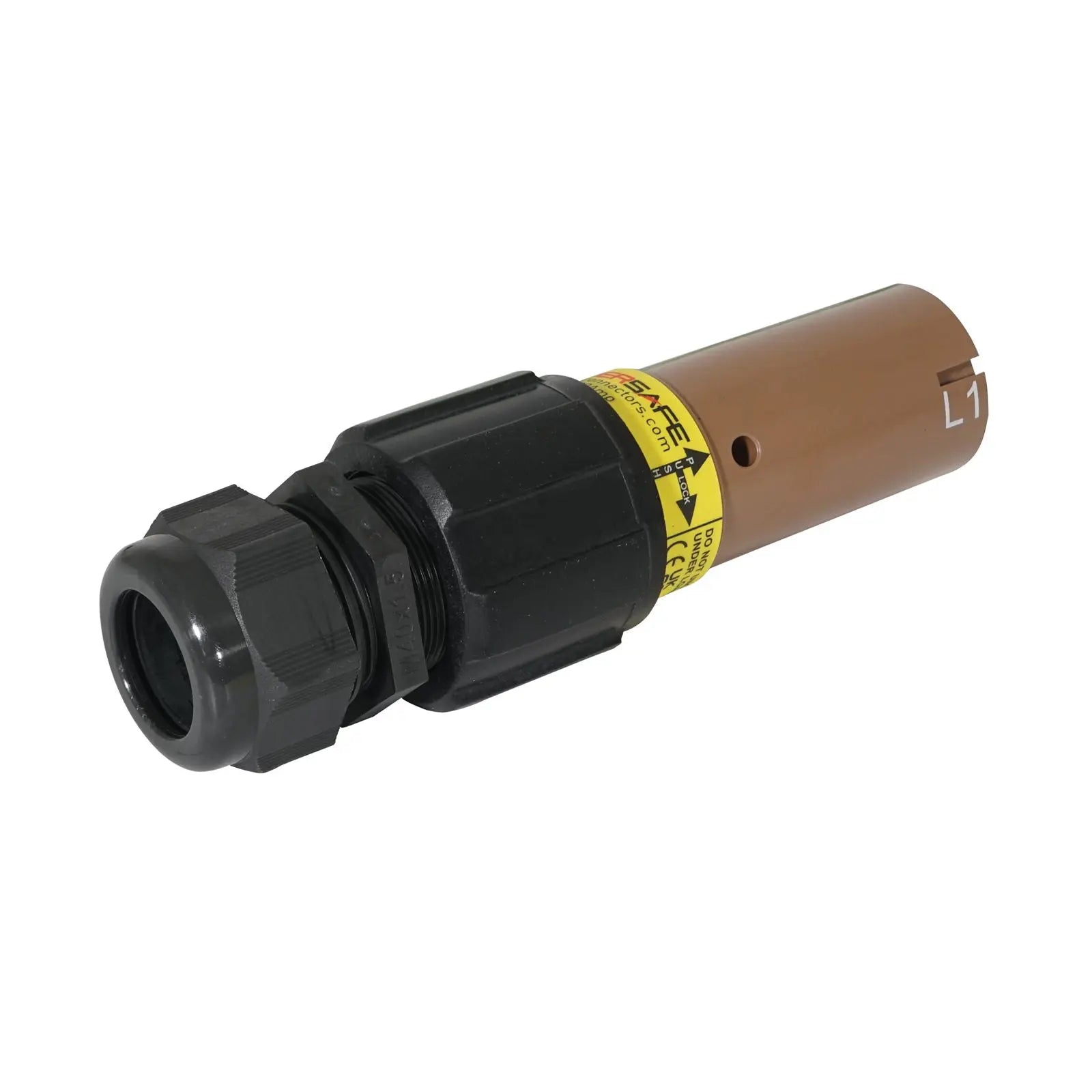 Phase 3s Powersafe single pole connectors are the highest rated safest and finest quality industrial plug available and are used by the power distribution events military and cable assembly industries worldwide. A set of Powersafe line connectors can easily terminate to copper cable using either industry standard crimp tools or set-screw contacts. The three phase power distribution range includes: Earth Neutral L1 L2 and L3 available in either source or drain format as 800A or 500A determined by cable size (240mm²-300mm² requires 800A plugs 25mm²-185mm² requires 500A plugs). They are the perfect safe alternative to Camlock connectors and fully compatible with Litton VEAM T4 400 and T6 660 amp powerlocks ITT Cannon and other manufacturers. Made in Britain Manufacturers code: SLS-1-BN-S120-M40A Type: 500A Line Source 120mm² L1 Brown Mechanically keyed to eliminate the possibility of cross mating Secondary locking prevent unintentional uncoupling under load Finger-proof protection against electric shock IP2X Waterproof and dustproof to IP67 rated Colour coded for easy identification Innovative contact band allows higher rating (400A>500A 660A>800A) Contact band cannot come out High impact insulator (no glass used and flame retardant) Field installation no special tools required Integral cable strain relief Daisy chain capability facilitates flexible stock cable lengths Large cable range: 25mm²-300mm² (Please note: If you require Powersafe for power cables less than set screw 120mm² i.e. 95mm² 70mm² 50mm² 35mm² 25mm² you must purchase a reducer kit separately)