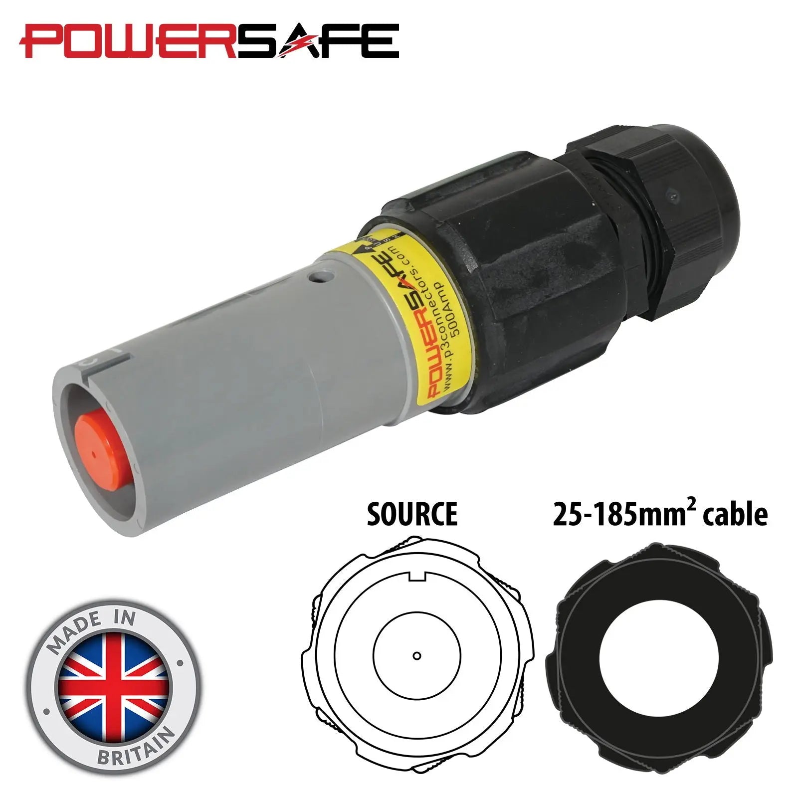 Phase 3s Powersafe single pole connectors are the highest rated safest and finest quality industrial plug available and are used by the power distribution events military and cable assembly industries worldwide. A set of Powersafe line connectors can easily terminate to copper cable using either industry standard crimp tools or set-screw contacts. The three phase power distribution range includes: Earth Neutral L1 L2 and L3 available in either source or drain format as 800A or 500A determined by cable size (240mm²-300mm² requires 800A plugs 25mm²-185mm² requires 500A plugs). They are the perfect safe alternative to Camlock connectors and fully compatible with Litton VEAM T4 400 and T6 660 amp powerlocks ITT Cannon and other manufacturers. Made in Britain Manufacturers code: SLS-3-GY-S120-M40A Type: 500A Line Source 120mm² L3 Grey Mechanically keyed to eliminate the possibility of cross mating Secondary locking prevent unintentional uncoupling under load Finger-proof protection against electric shock IP2X Waterproof and dustproof to IP67 rated Colour coded for easy identification Innovative contact band allows higher rating (400A>500A 660A>800A) Contact band cannot come out High impact insulator (no glass used and flame retardant) Field installation no special tools required Integral cable strain relief Daisy chain capability facilitates flexible stock cable lengths Large cable range: 25mm²-300mm² (Please note: If you require Powersafe for power cables less than set screw 120mm² i.e. 95mm² 70mm² 50mm² 35mm² 25mm² you must purchase a reducer kit separately)