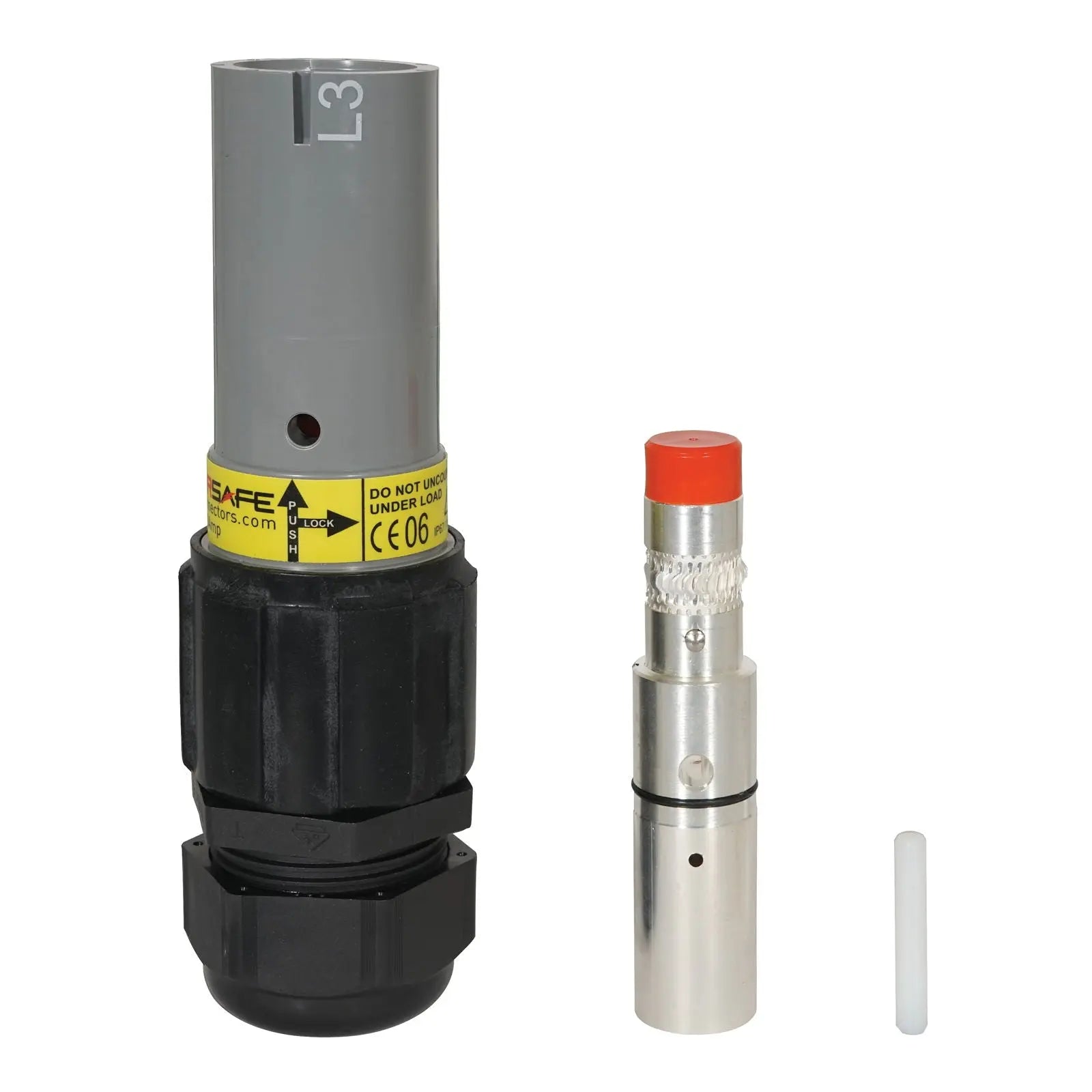 Phase 3s Powersafe single pole connectors are the highest rated safest and finest quality industrial plug available and are used by the power distribution events military and cable assembly industries worldwide. A set of Powersafe line connectors can easily terminate to copper cable using either industry standard crimp tools or set-screw contacts. The three phase power distribution range includes: Earth Neutral L1 L2 and L3 available in either source or drain format as 800A or 500A determined by cable size (240mm²-300mm² requires 800A plugs 25mm²-185mm² requires 500A plugs). They are the perfect safe alternative to Camlock connectors and fully compatible with Litton VEAM T4 400 and T6 660 amp powerlocks ITT Cannon and other manufacturers. Made in Britain Manufacturers code: SLS-3-GY-C240-M40B Type: 800A Line Source 240mm² L3 Grey Mechanically keyed to eliminate the possibility of cross mating Secondary locking prevent unintentional uncoupling under load Finger-proof protection against electric shock IP2X Waterproof and dustproof to IP67 rated Colour coded for easy identification Innovative contact band allows higher rating (400A>500A 660A>800A) Contact band cannot come out High impact insulator (no glass used and flame retardant) Field installation no special tools required Integral cable strain relief Daisy chain capability facilitates flexible stock cable lengths Large cable range: 25mm²-300mm² (Please note: If you require Powersafe for power cables less than set screw 120mm² i.e. 95mm² 70mm² 50mm² 35mm² 25mm² you must purchase a reducer kit separately)
