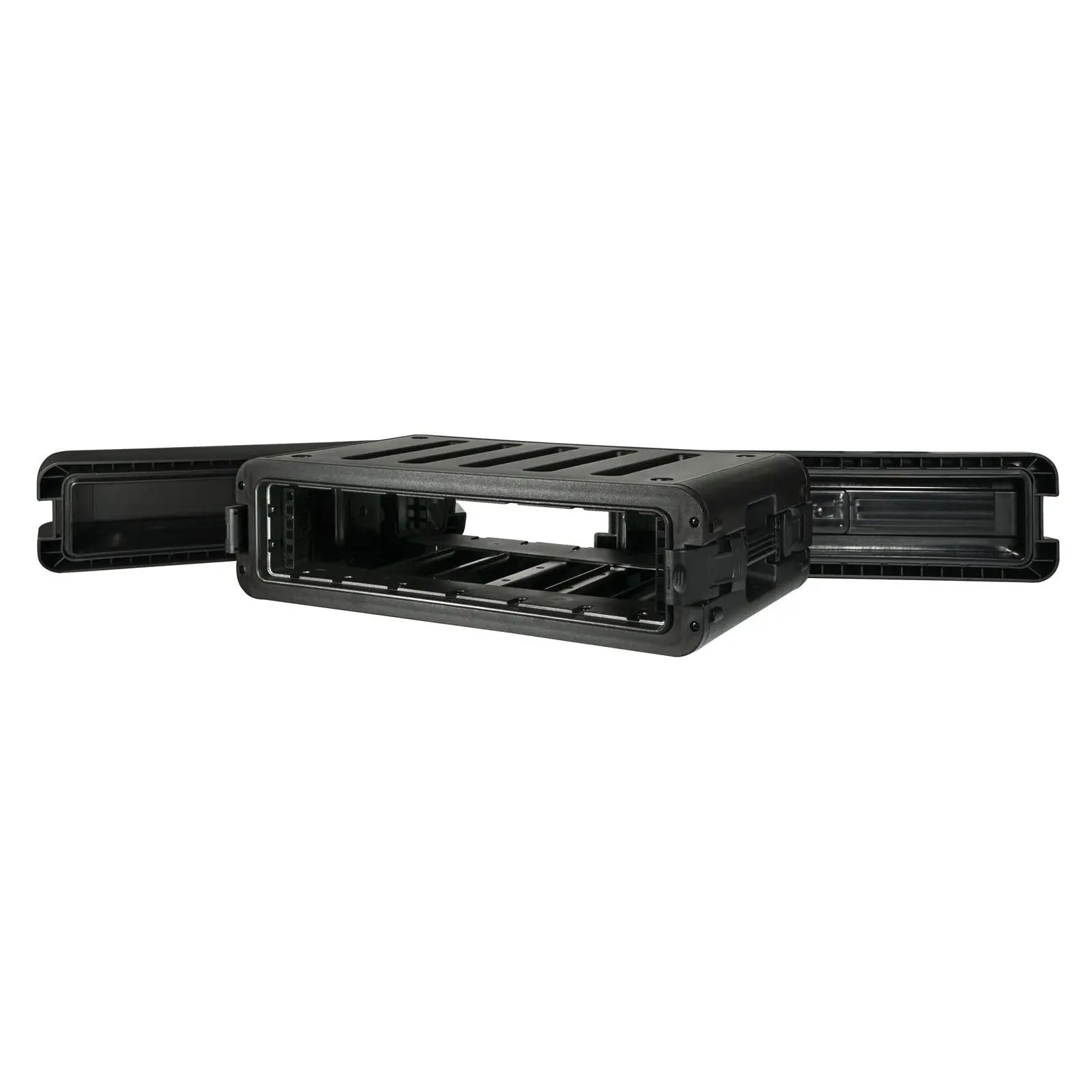 Rugged injection moulded short depth 19” rack cases suitable for housing and transporting a wide range of audio visual equipment. The tough polypropylene material offers impact resistance while remaining lightweight compared to traditional timber flight cases. Injection moulded high strength polypropylene Foam gaskets to prevent moisture ingress during storage and transportation Lightweight Impact and corrosion resistant Secure stacking design Front and rear lids Front and rear rack railsOverlocking flush mounted catches keep lids secure during transit (2 per lid) Supplied with a bag of 12 x M5 cage nuts and 12 x M5 pan head screws Four rubber feet Two large carry handles