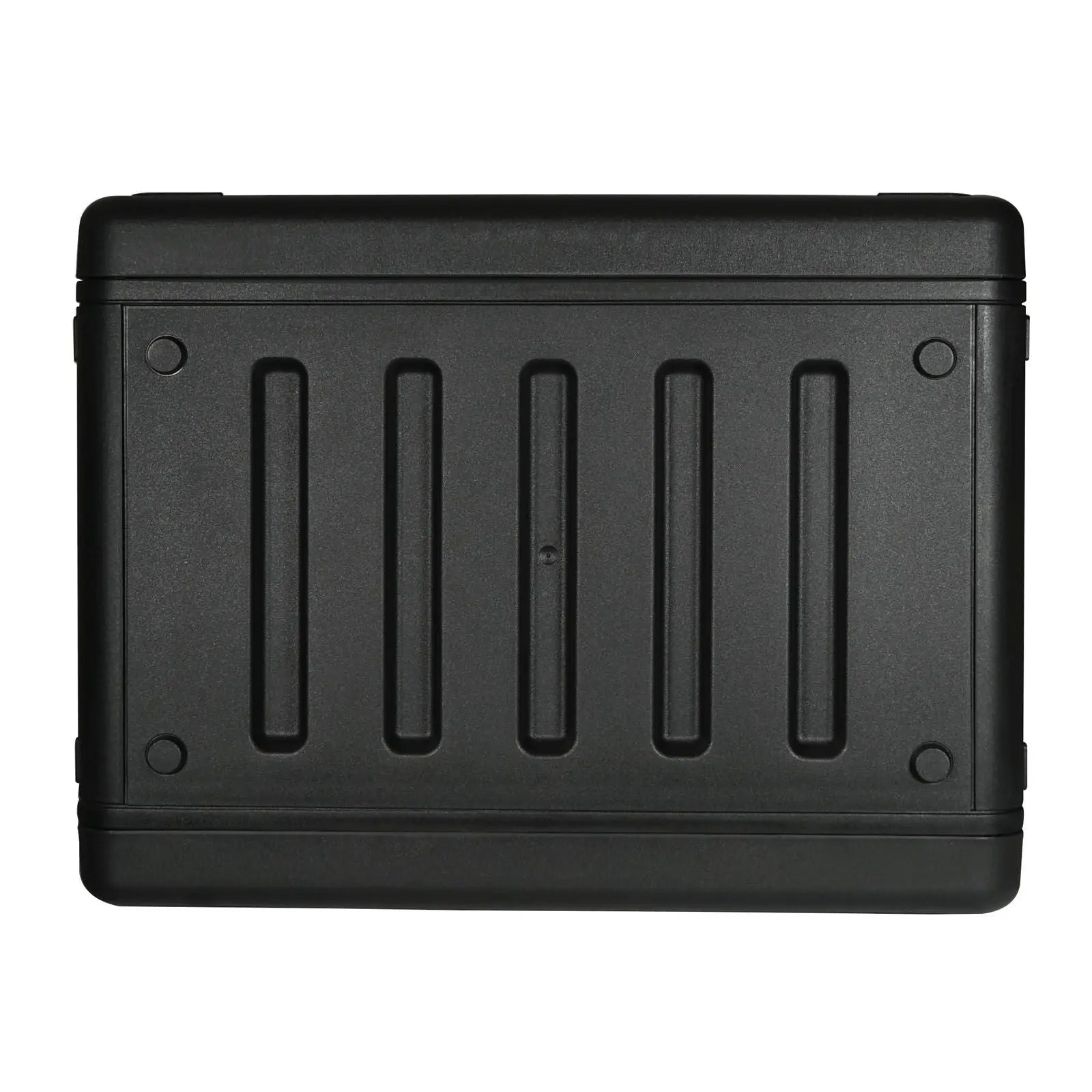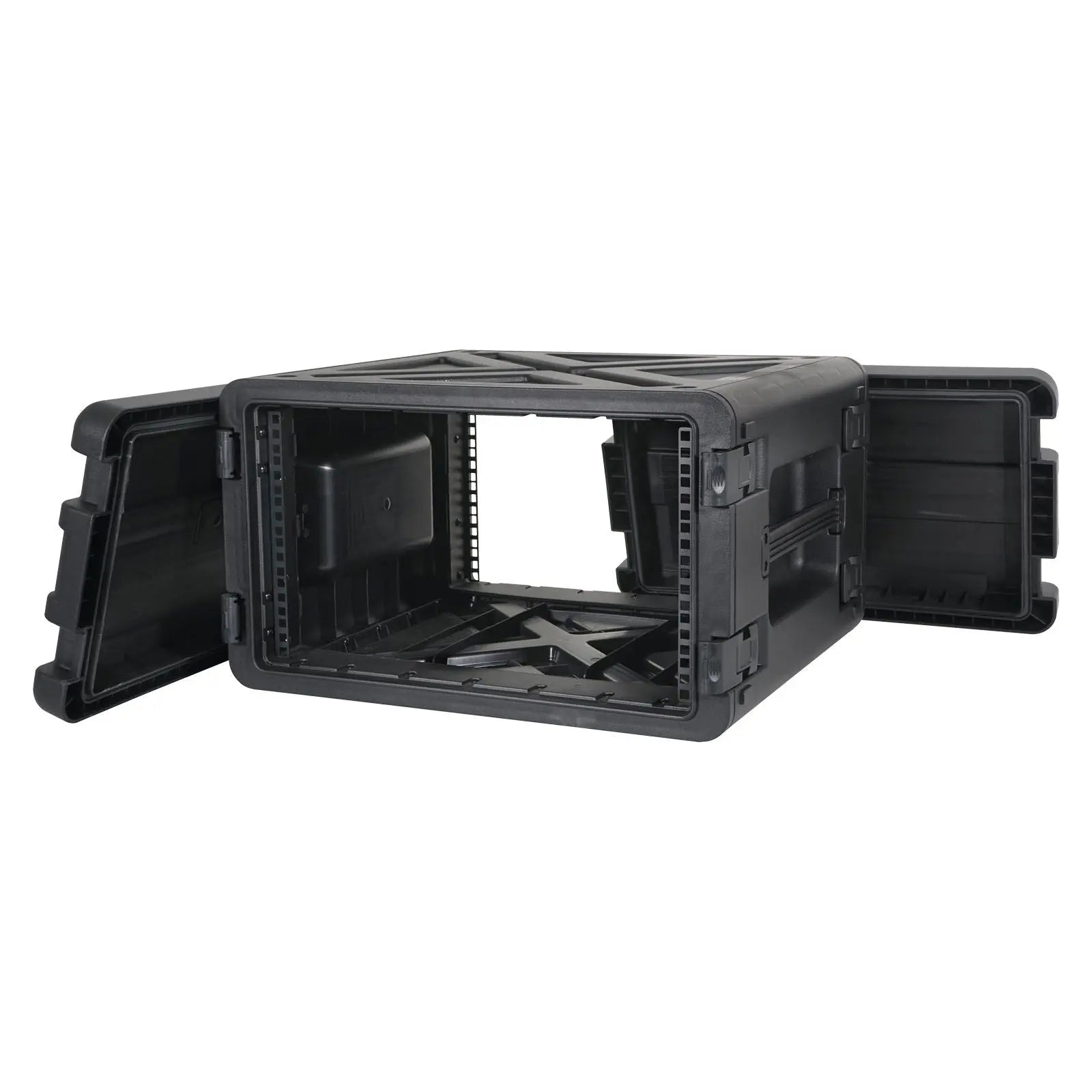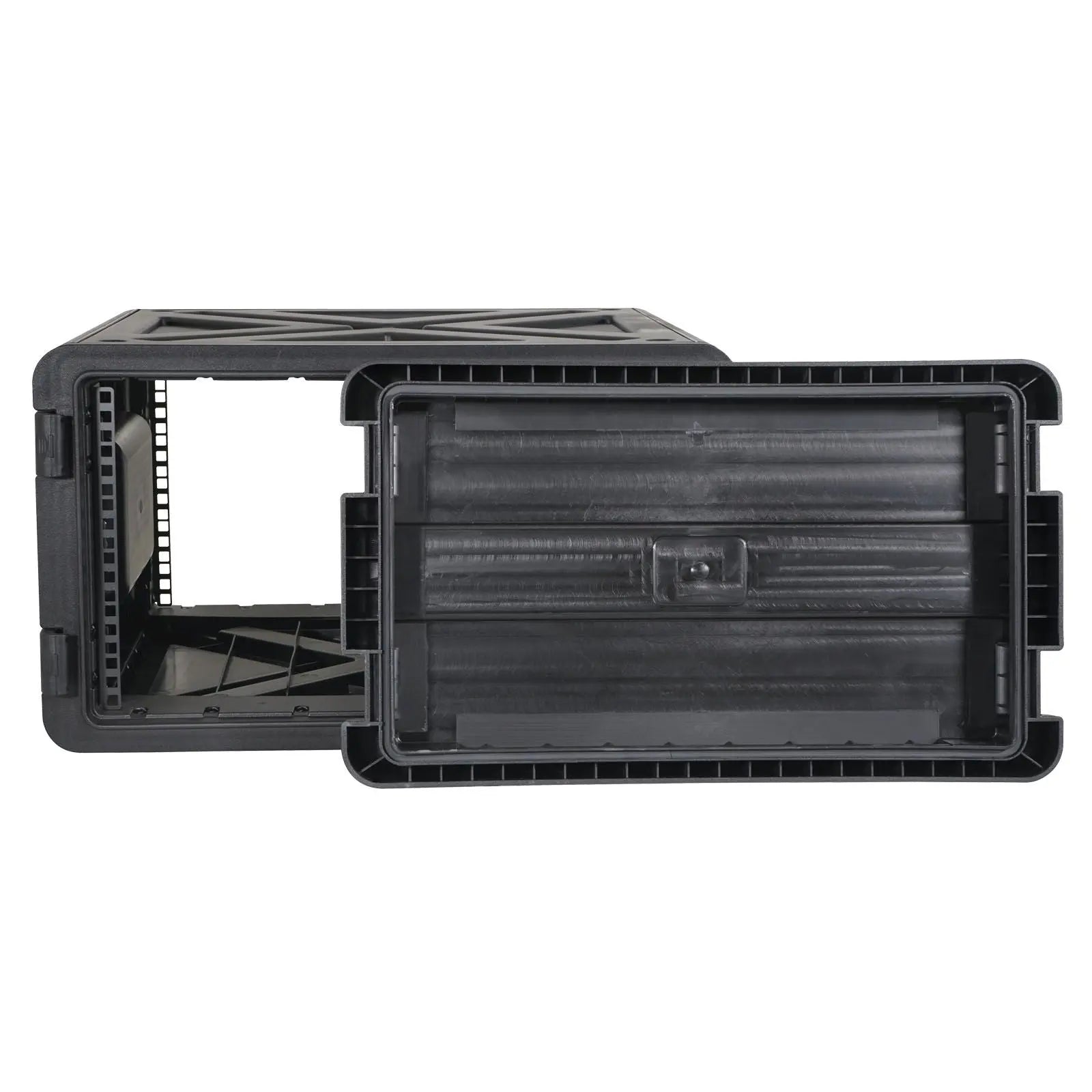 Rugged injection moulded short depth 19” rack cases suitable for housing and transporting a wide range of audio visual equipment. The tough polypropylene material offers impact resistance while remaining lightweight compared to traditional timber flight cases. Injection moulded high strength polypropylene Foam gaskets to prevent moisture ingress during storage and transportation Lightweight Impact and corrosion resistant Secure stacking design Front and rear lids Front and rear rack railsOverlocking flush mounted catches keep lids secure during transit (2 per lid) Supplied with a bag of 12 x M5 cage nuts and 12 x M5 pan head screws Four rubber feet Two large carry handles