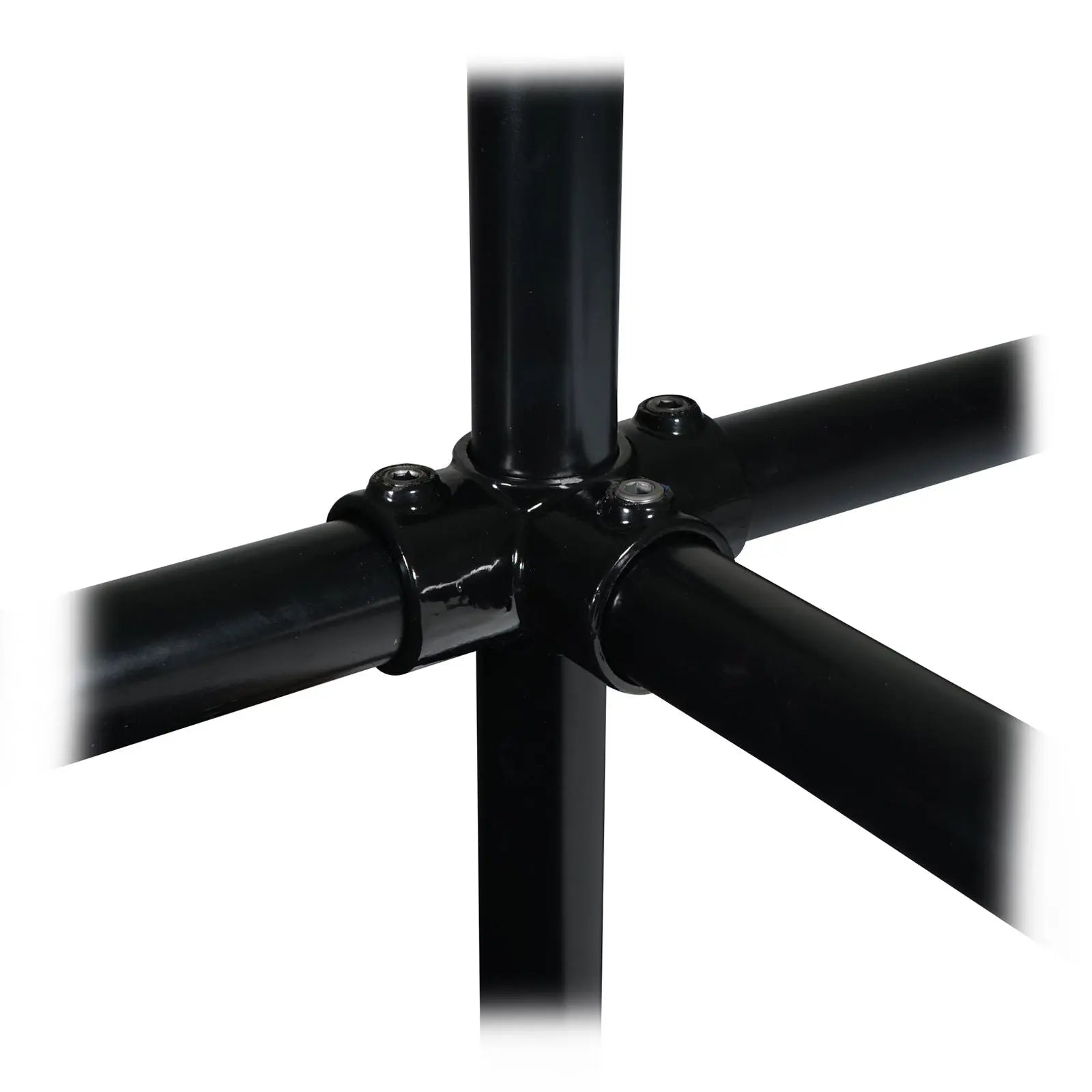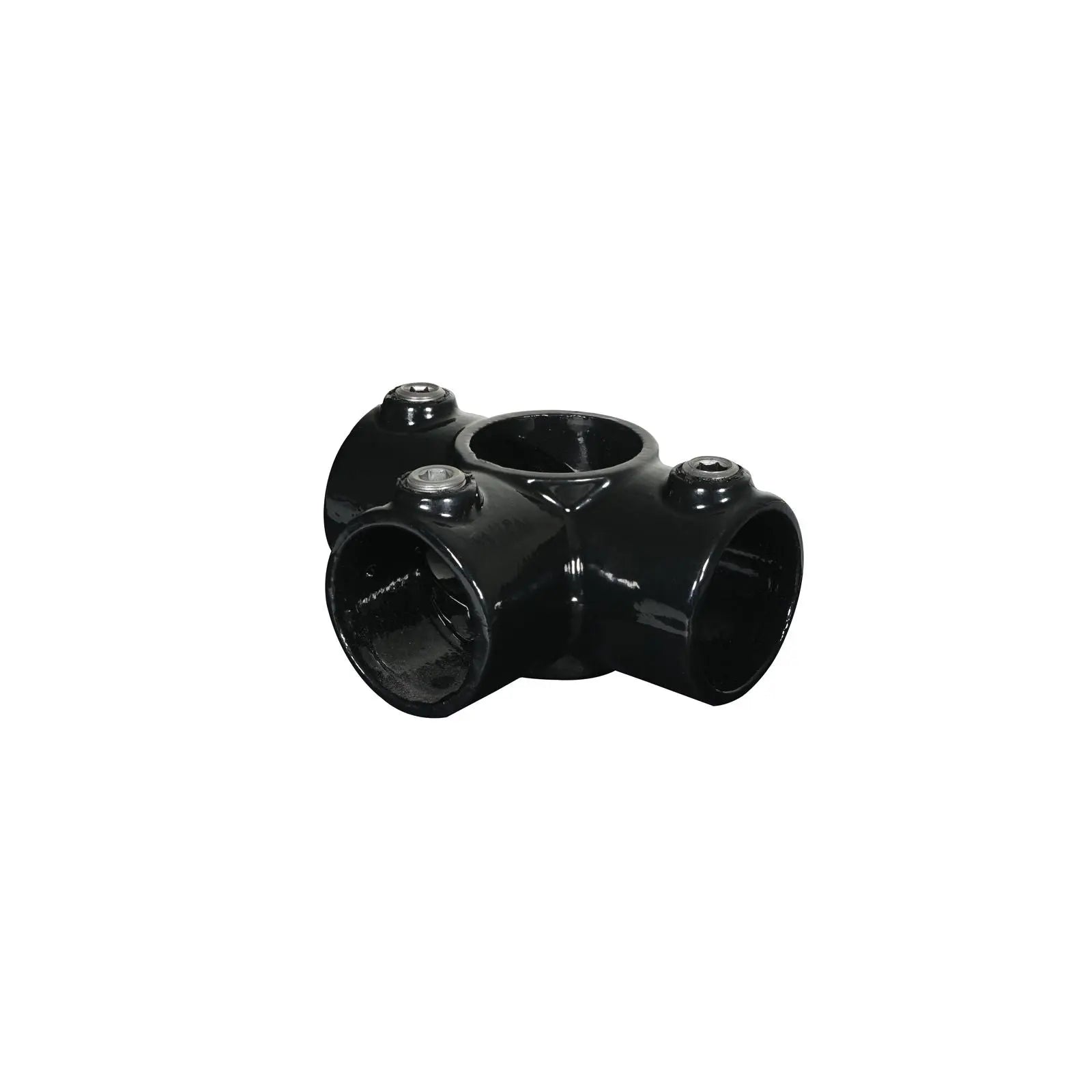 Elumen8 CLAM264 Side Outlet Black Key Clamp (176-BPC). Key clamps are designed to secure and connect 48.3mmØ tubes quickly and easily. The wide range of options available enables users to create a huge variety of configurations including lighting grids studio frames staging and exhibitions stands. The side outlet key clamp allows for the connection of four tubes with one tube passing directly through the central junction more commonly used to connect uprights with horizontal tubes at 90° to the upright in 3 directions. Malleable cast iron construction hot dip galvanised with black powder coated finish Designed to fit 48.3mmØ tubes Simply secured via an Allen key (not included) Please note: Not suitable for use in the construction of scaffolding frameworks Grub screws included
