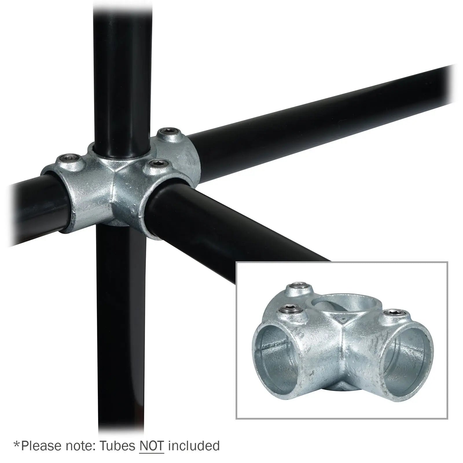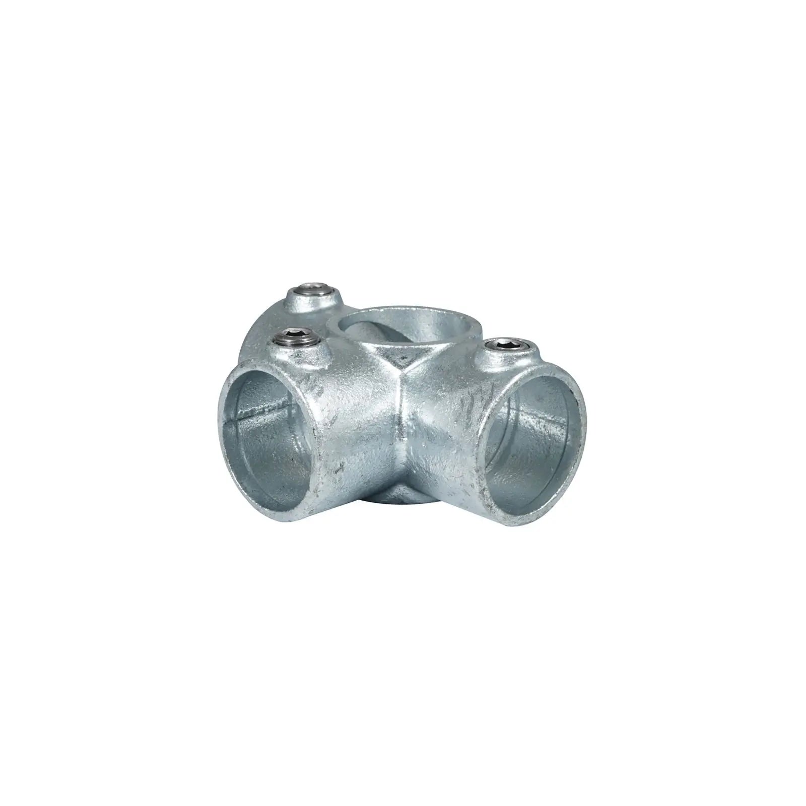 Elumen8 CLAM214 Side Outlet Key Clamp (176-HDG). Key clamps are designed to secure and connect 48.3mmØ tubes quickly and easily. The wide range of options available enables users to create a huge variety of configurations including lighting grids studio frames staging and exhibitions stands. The side outlet key clamp allows for the connection of four tubes with one tube passing directly through the central junction more commonly used to connect uprights with horizontal tubes at 90° to the upright in 3 directions. Malleable cast iron construction with hot dip galvanised finish Designed to fit 48.3mmØ tubes Simply secured via an Allen key (not included) Please note: Not suitable for use in the construction of scaffolding frameworks Grub screws included