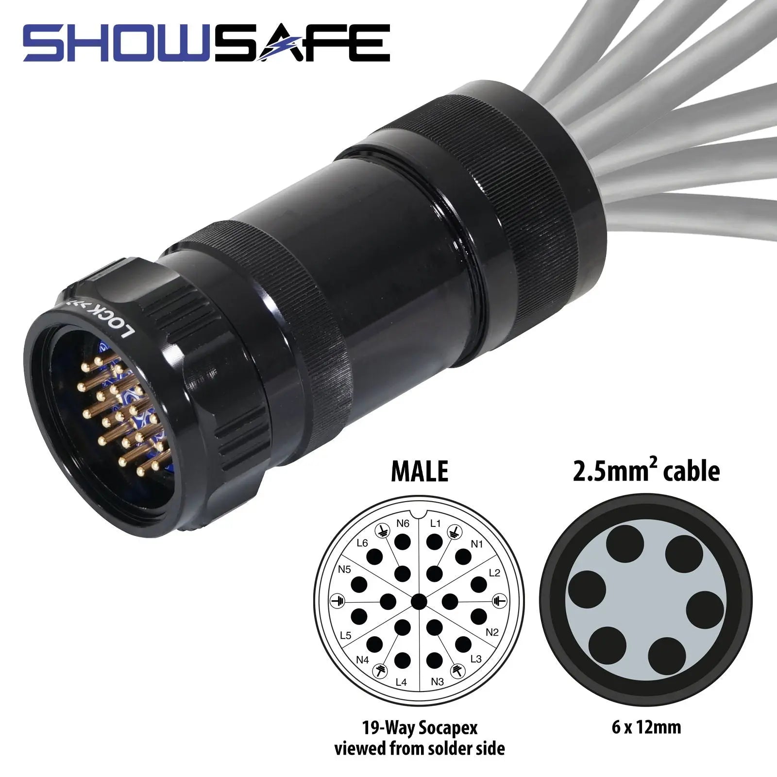 The eLumen8 Showsafe range of UL certified Socapex connectors have been manufactured to deliver the highest levels of quality reliability and safety for stage lighting connections. The super robust construction of these multi-pin devices ensures reliable operation for AV professionals. The rugged plug design has been tailored specifically for professional touring and stage lighting applications and all products are fully Socapex SL419 compatible. Showsafe 19-Pin plugs are sealed to IP67 protection when mated making them water and dust proof for festivals worldwide. The sand of Benicassim? The mud and rain of Glastonbury? No problem. Model reference: P19-LM-S-SPR-BK-UL Inline male 6 x 12mm (2.5mm² cable) UL approved to UL1977 standard 100% UK manufactured and assembled Amphenol Socapex SL419 compatible 19-Pin connectors are all rated at 25A Multi-point gold plated contacts Integral insulation sleeves